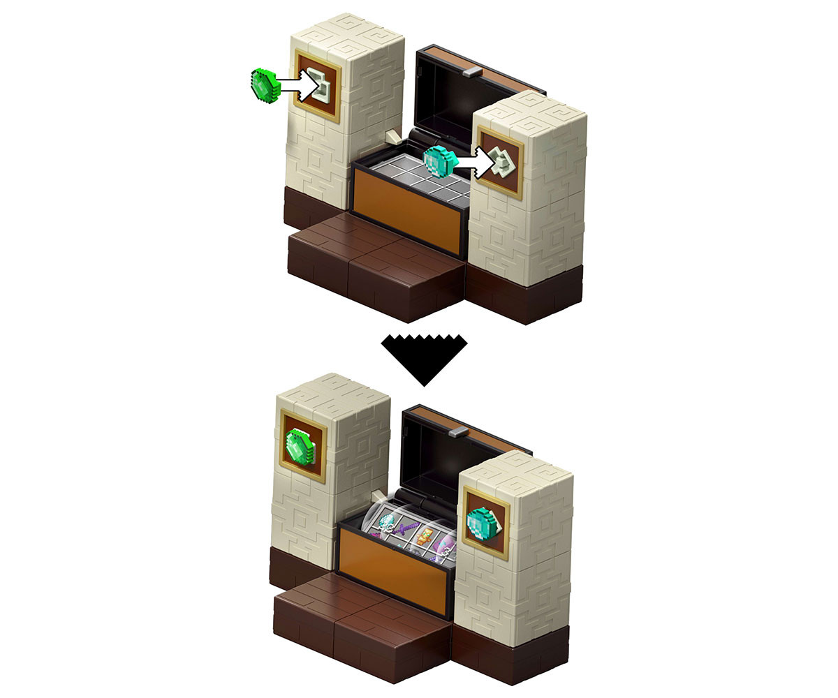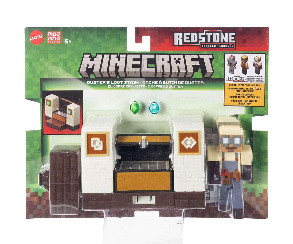 Светът на Minecraft се разширява със „силата на Redstone“ чрез серията Minecraft Redstone Charged екшън комплекти. Комплектът Duster's Loot Stash включва подвижна фигурка Duster с височина около 8 см, специално устройство „Redstone Charged“ и аксесоари, които позволяват на феновете да открият скрито съкровище в сандък. Комплектите са разработени от дизайнерите на Minecraft с динамичен механизъм за още по-забавно колекциониране. Всеки комплект включва и DLC код за достъп до ексклузивен предмет в играта. Продават се поотделно и са в зависимост от наличността. Цветовете и декорациите може да варират.