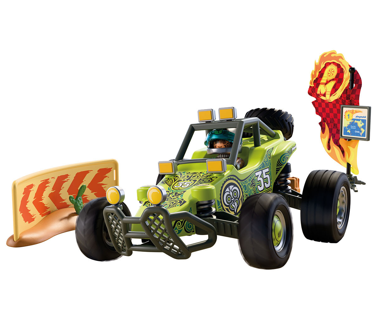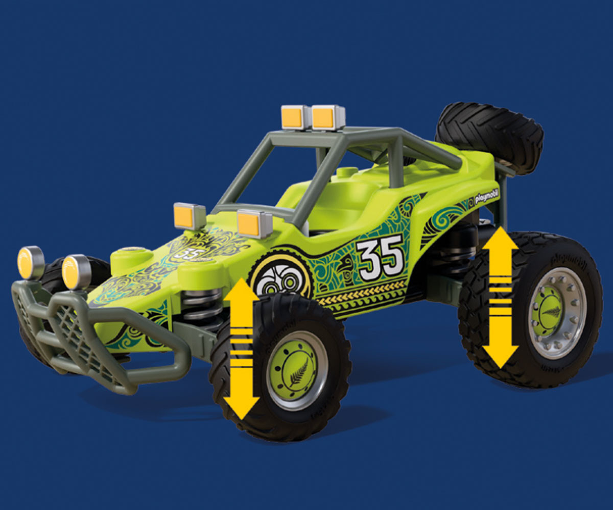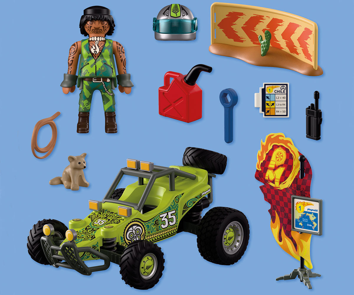 Прахът се вдига, слънцето пече силно - новозеландският състезател натиска газта! Със своето високотехнологично офроуд бъги той преминава през сухите пустинни етапи на „Ring of Fire“ в Чили. Бъгито е отлично подготвено за тежките условия - задното окачване осигурява комфорт при неравен терен, а отзад има стойка за резервна гума, която може да се сваля и използва при нужда. Всички важни аксесоари като инструменти, туба с гориво, въже и куфар с карта и радио са винаги под ръка. Отпред бъгито разполага със здрав предпазен буфер с възможност за добавяне на допълнителни светлини - идеално за нощни карания и лоша видимост в пустинята. Включената предпазна ограда добавя още повече реализъм към състезанието, а пустинните лисици наблюдават действието!