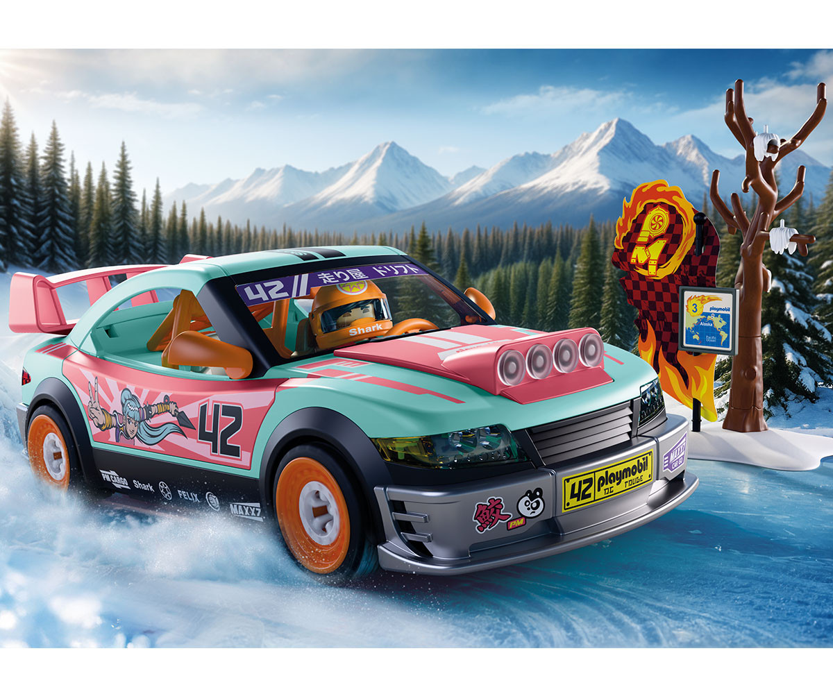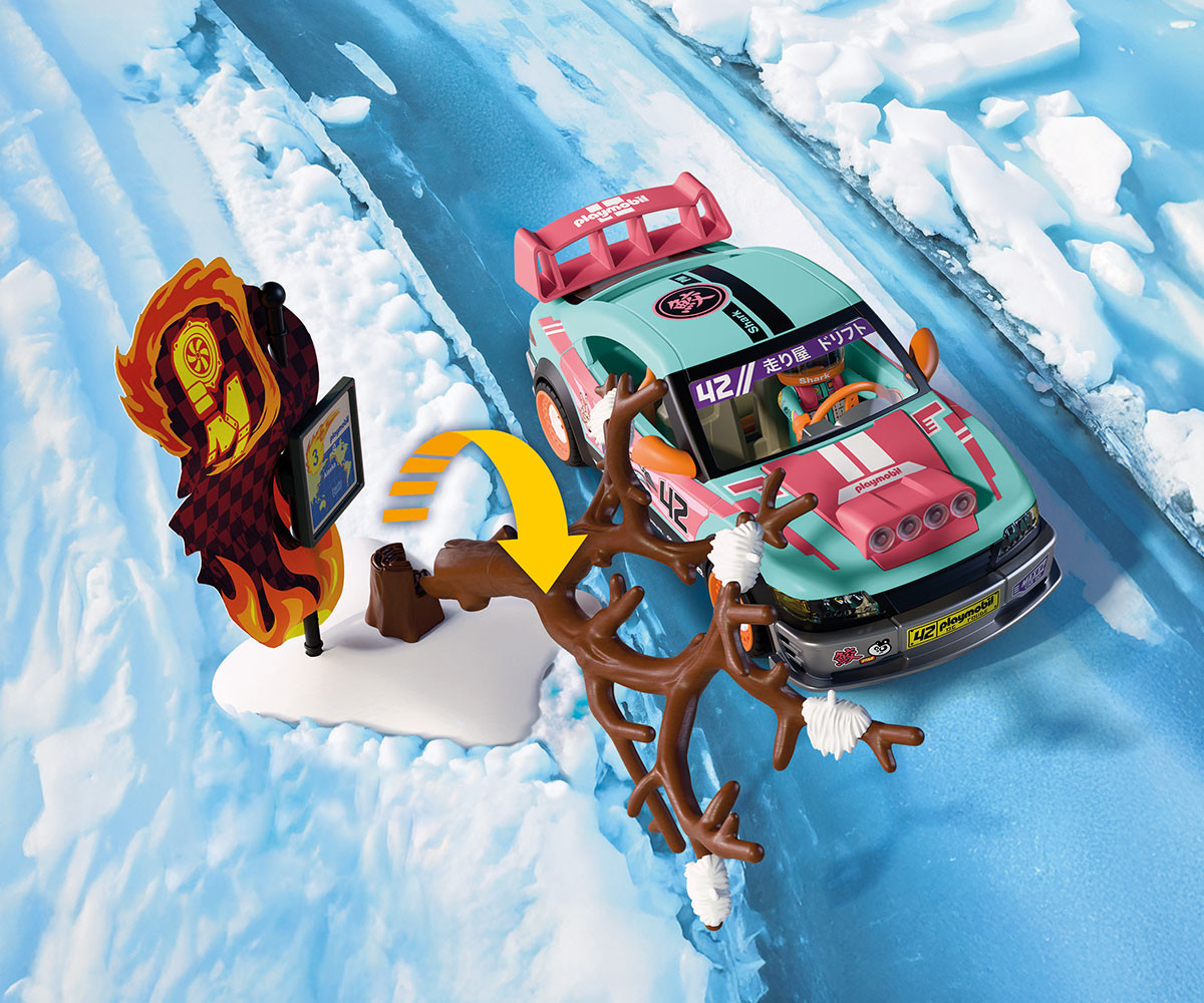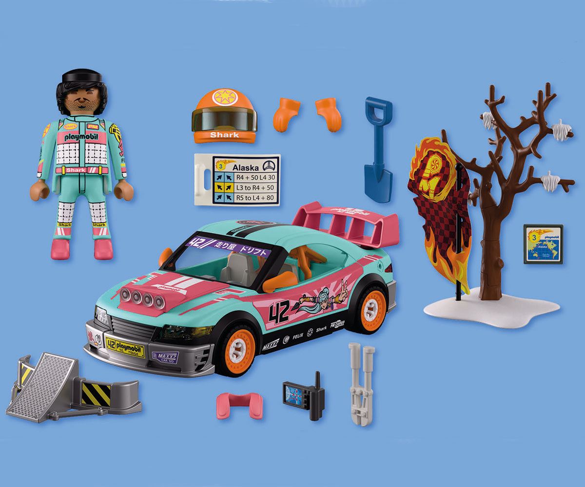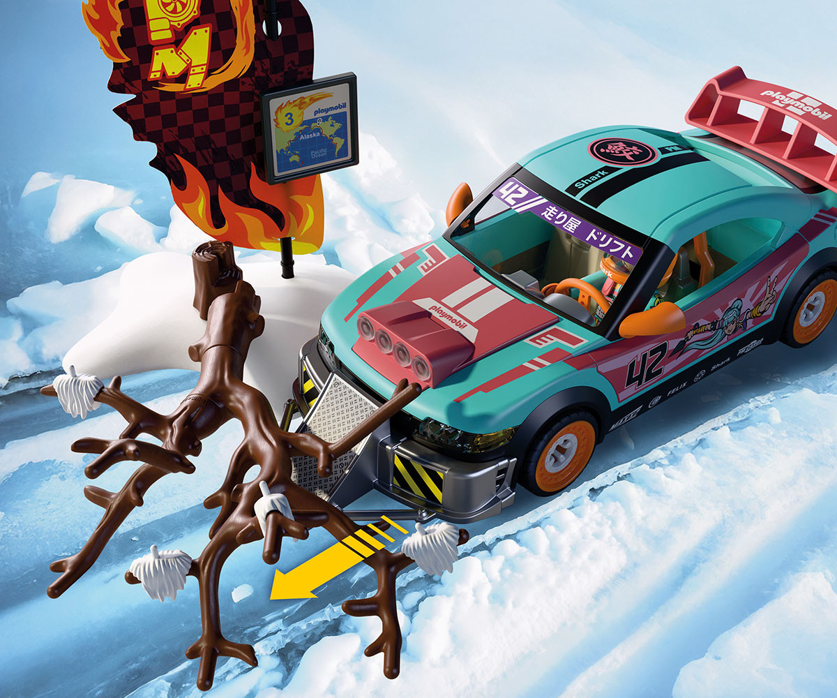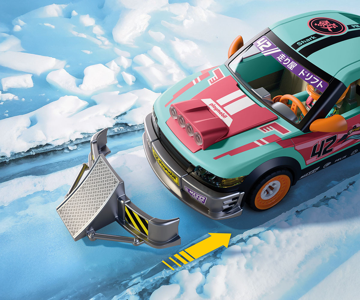 Със своя стилно тунингован офроуд автомобил японският състезател с лекота приема предизвикателството на легендарното състезание „Ring of Fire“! В момента той се състезава в ледените условия на Аляска, където сняг, студ и паднали дървета поставят на изпитание всеки участник. Но този пилот запазва спокойствие - неговият автомобил побира две фигурки и се управлява стабилно дори върху хлъзгав терен. В багажника има необходимите инструменти за бързи ремонти, а впечатляващият дизайн с аниме графика, заден спойлер и характерен капак със светлини правят автомобила едновременно функционален и стилен. Ако препятствие блокира пътя - няма проблем! Броните могат да се свалят и заменят с таран, с който дори падналите дървета не са пречка.