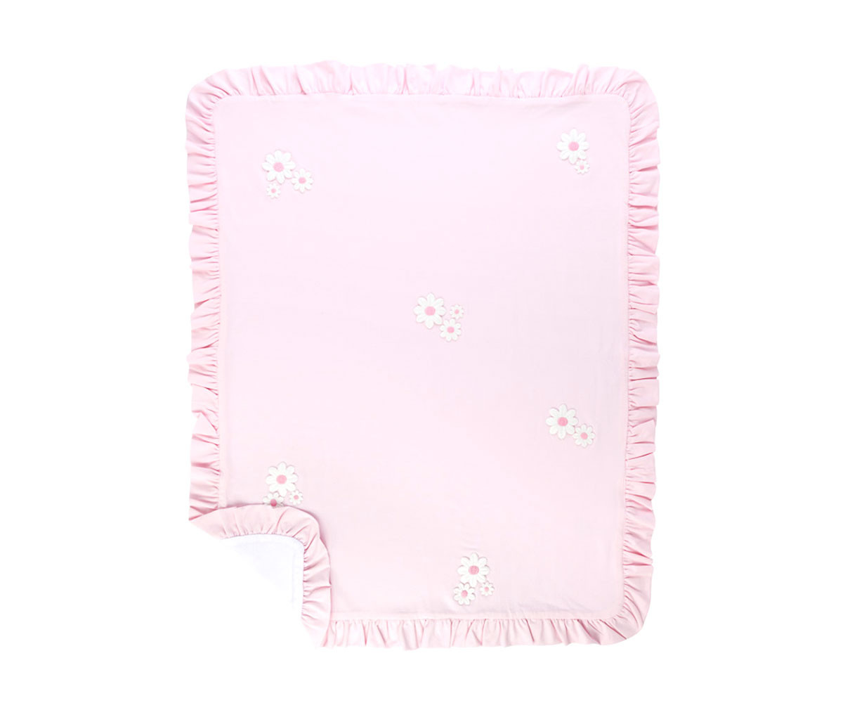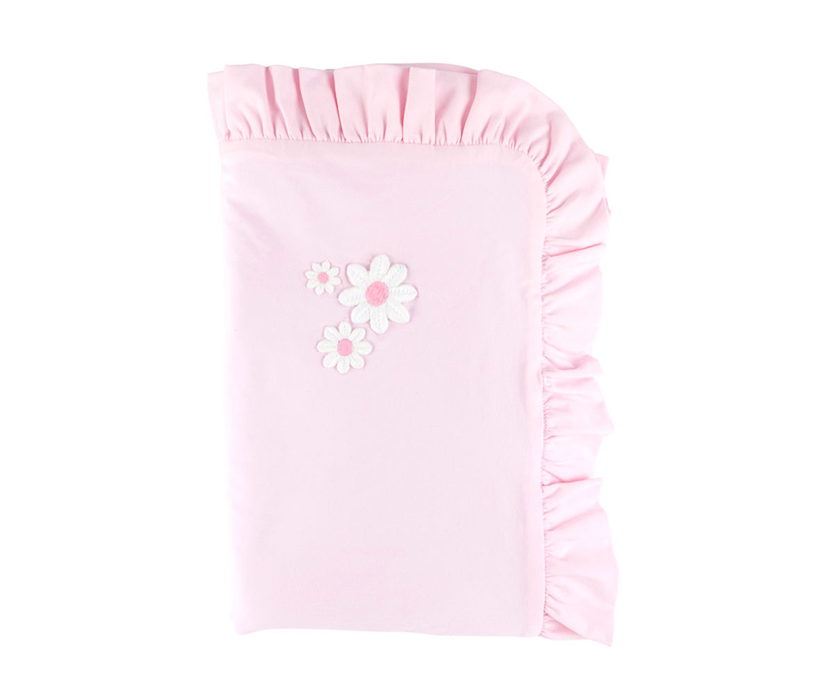 Чудесно бебешко одеяло, което може да се използва в много различни ежедневни ситуации – вкъщи или навън. Изработено от две различни тъкани. Две подробности за дизайна са поразителни. Първият, неговите краища, във формата на къдри са по цялата периферия. Вторият, нежни цветя, които са пришити върху външната страна. Това одеяло се отличава с голямата си мекота, лесно да се сгъва и е в един размер. Характеристики: Размери: 80 х 100 см. Състав: 95% памук, 5% еластан