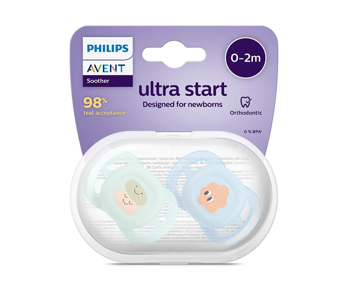- Име: Ортодонтични залъгалки Philips-Avent Ultra Start, 2 броя, със стерилизаторна кутия, усмивка/очички момче, 0-2 м