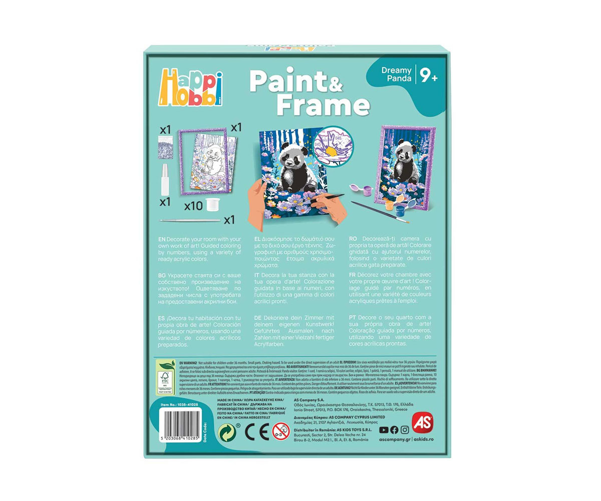 Комплект за рисуване по номера HappiHobbi Paint & Frame – Тема „Панда“. Комплектът HappiHobbi Paint & Frame с тема „Панда“ включва предварително отпечатана дъска, на която всяка зона е обозначена с номер, съответстващ на определен цвят. Детето открива кой цвят е предназначен за всяка зона и я оцветява съгласно указанията. Резултатът е изключително удовлетворяващ, тъй като процесът на рисуване се води стъпка по стъпка. Серията HappiHobbi Paint & Frame на AS е идеалният избор за създаване на истински произведения на изкуството! Украси стаята си със своя собствен шедьовър! Техниката „Рисуване по номера“ използва предварително смесени акрилни бои. С този комплект ще се научите да оцветявате всеки детайл от предварително отпечатаната дъска, като развивате художествените си умения и фината си моторика. Крайният резултат ще ви донесе усещане за радост, гордост и удовлетворение! Гордейте се със своя шедьовър – поставете го в рамка и го изложете в стаята си.