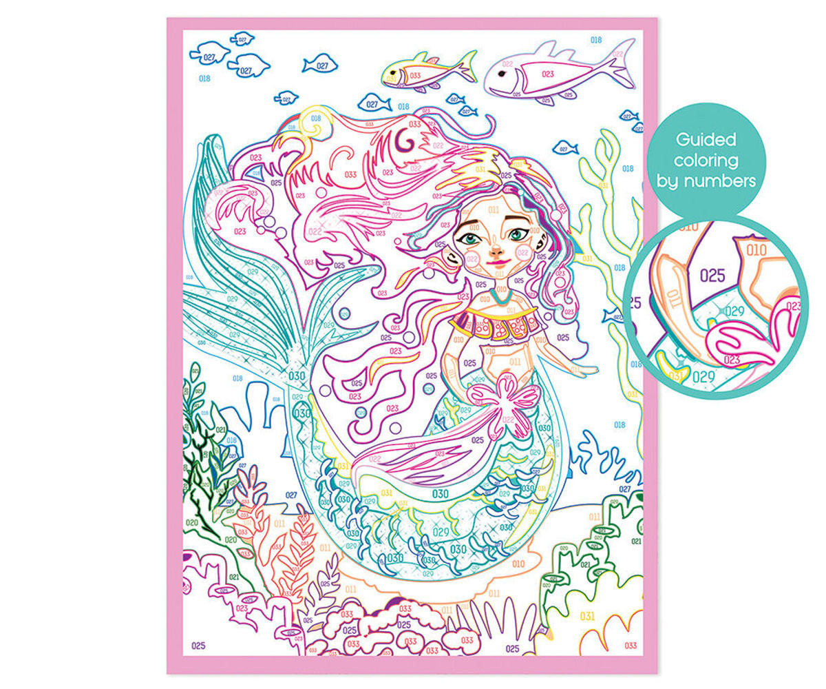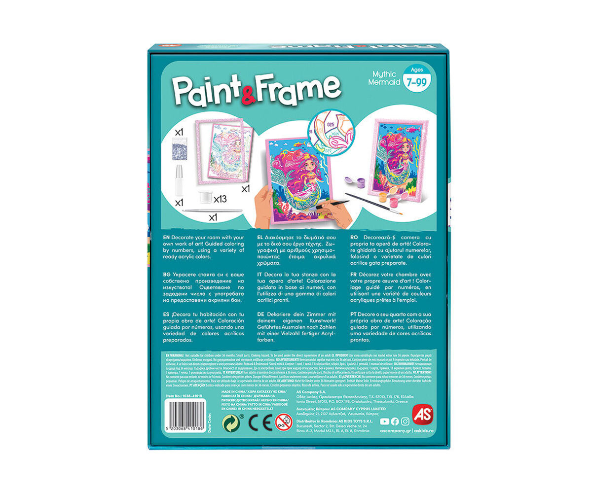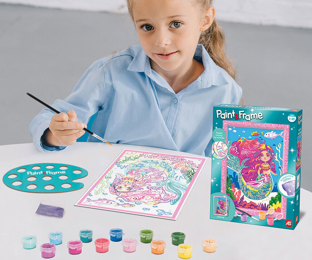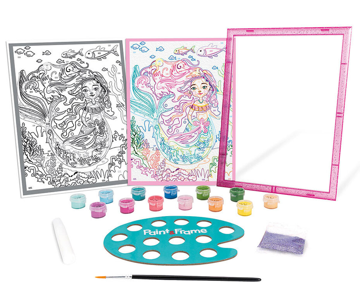 Комплект за рисуване по номера Paint & Frame – „Русалка“. С комплектите Paint & Frame, базирани на техниката за рисуване по номера, децата се учат да оцветяват различни изображения с внимание и прецизност, като по този начин развиват своите художествени умения и фина моторика. В края на процеса те изпитват радост, гордост и удовлетворение, което ги мотивира да продължат да рисуват и създават. Удовлетворение и радост! Превърнете се в истински артисти и се гордейте със своя шедьовър. Paint & Frame прави всеки малък творец истински художник! Цветните картини с включена рамка са идеални за декорация на детската стая.