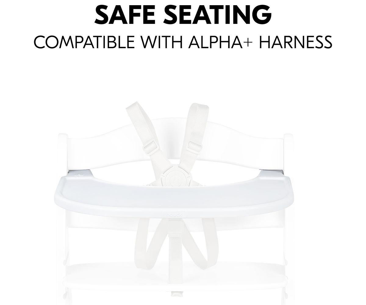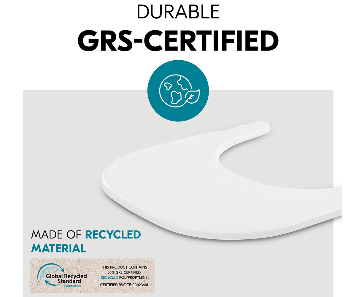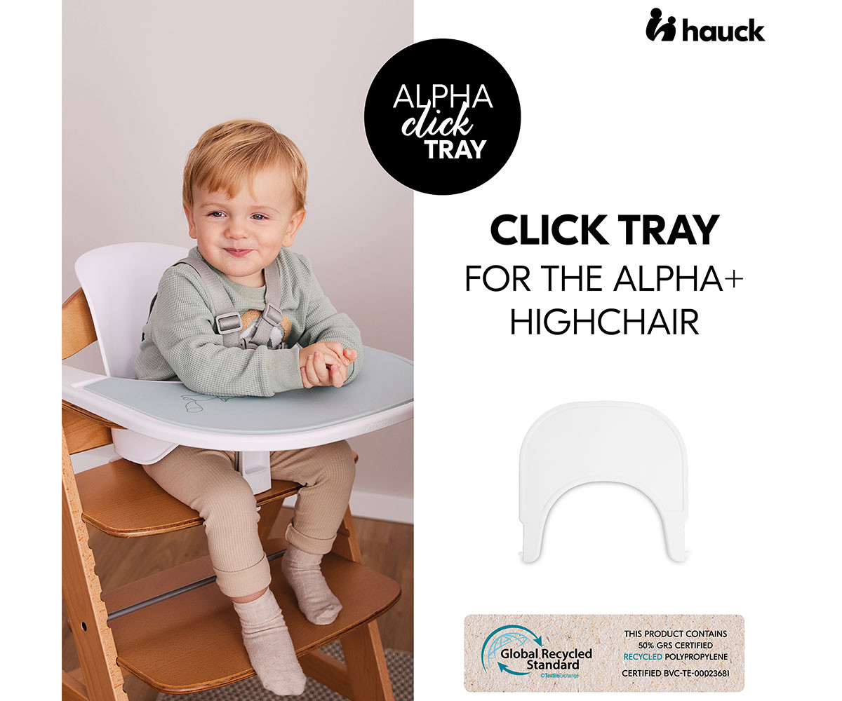 Alpha Click Tray - Практична и устойчива табла за Alpha+. Устойчива табла за столче за хранене от 6 месеца нататък. Подносът за столче за хранене е направен от материал, сертифициран по Глобален рециклиран стандарт (GRS), който означава ясни социални, екологични и правила за химическо производство. Може лесно да се закрепи върху вашето столче за хранене Alpha+, позволявайки на детето ви да яде и да играе на собствена маса от 6 до 36 месеца. Независимост, безопасност и комфорт за вашето дете. Благодарение на това, че таблата е съвместима с 5-точковия колан и предпазната лента на столчето за хранене, вашето дете е добре обезопасено в Alpha+. Подносът предлага достатъчно място за чинии, чаши и играчки. Независимо дали е във всекидневната, кухнята или банята, благодарение на таблата на вашия Alpha+, вашето дете може да седи винаги близо до вас. Издръжлив, лесен за поддръжка аксесоар за столче за хранене. Благодарение на здравия материал, таблата може да се използва дълго време. Повдигнатият ръб предпазва играчките от падане или разливане на напитките на пода. Гладката повърхност може лесно да се избърше с кърпа и почистващи продукти. Можете да добавите и Подложка за масичка Alpha+ (предалага се отделно, можете да я закупите тук).