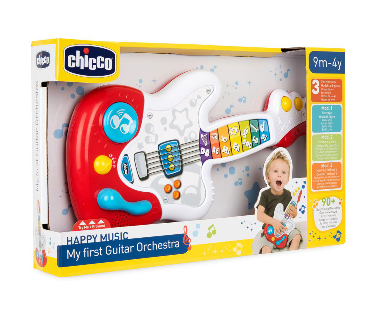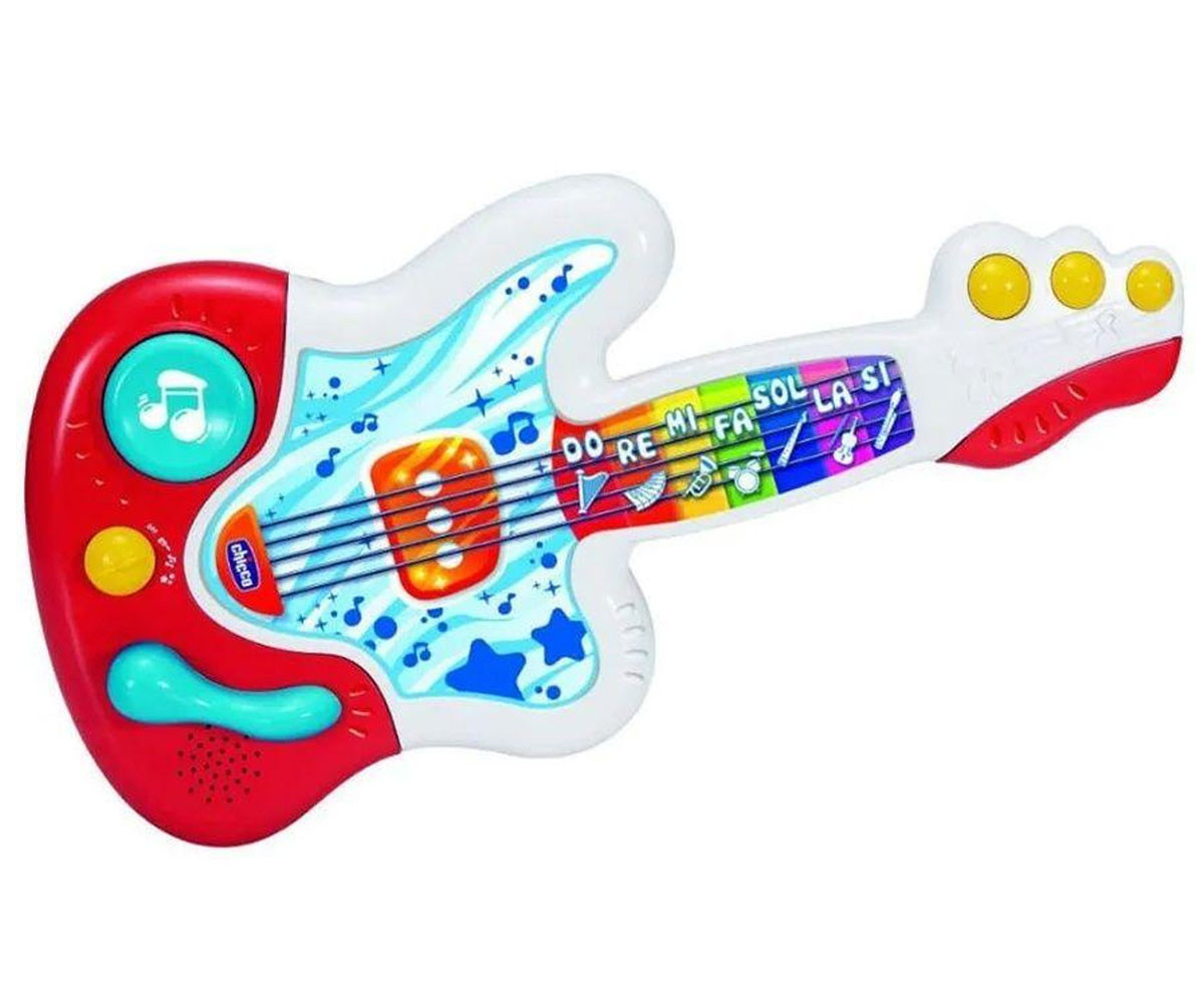 Очарователната музикална китара Chicco ще грабне вниманието на малчуганите и ще ги впусне в безброй музикални приключения. Създадена да забавлява и едновременно с това да подпомага развитието на слуха, координацията и креативността. Подходяща за деца над 9 месеца.
