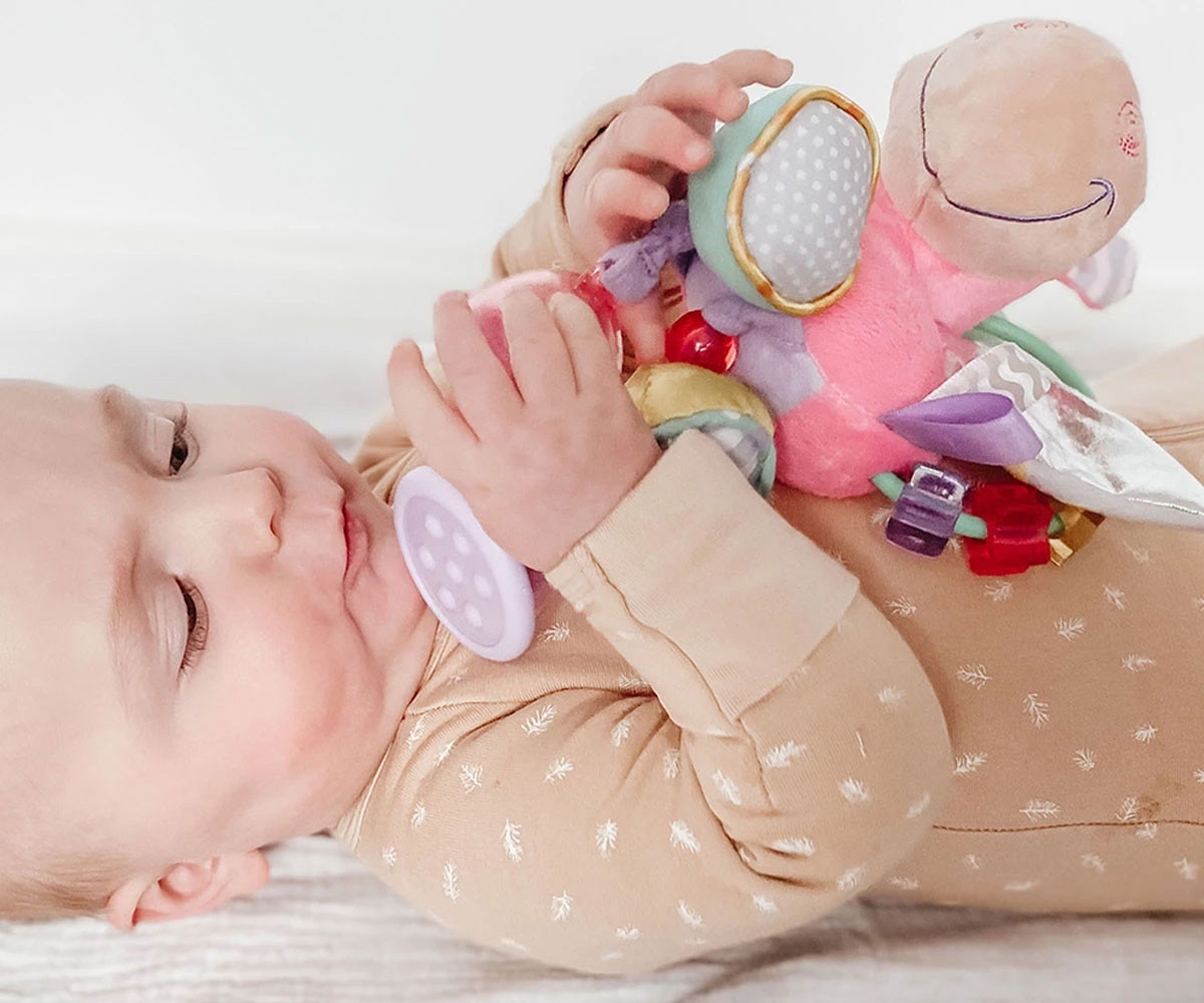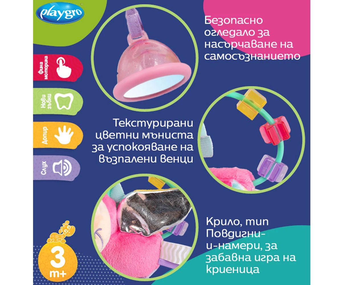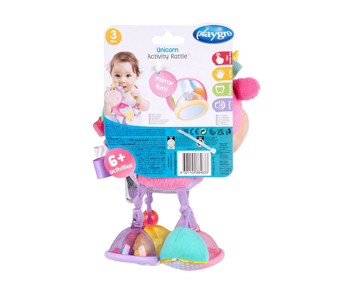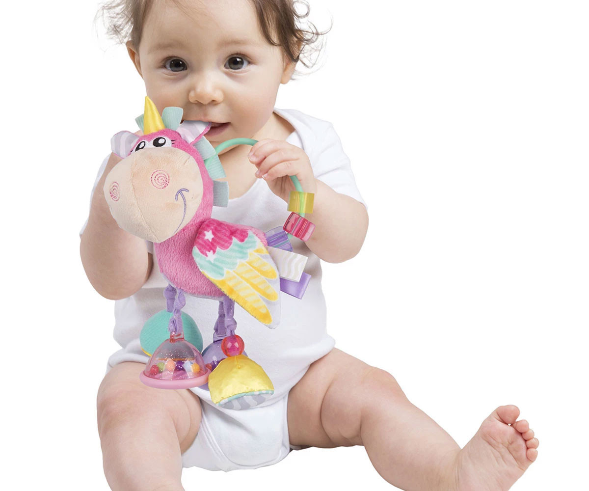 Дрънкалката Playgro Розов Еднорог е симпатичен плюшен герой със 6 забавни активности, които развличат бебето и подпомагат развитието му. Докато мъничето изследва различни звуци, текстури и форми, се стимулира фината моторика и сетивното възприятие. Играчката е особено подходяща и за периода на никнене на зъбки, когато релефните мъниста по дръжката успокояват чувствителните венци. Бебетата често изследват света чрез поставяне на предмети в устата, а текстурираните цветни мъниста са идеални за това.