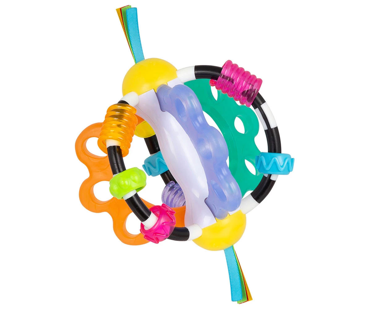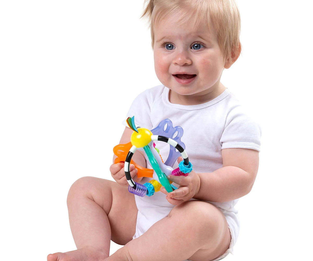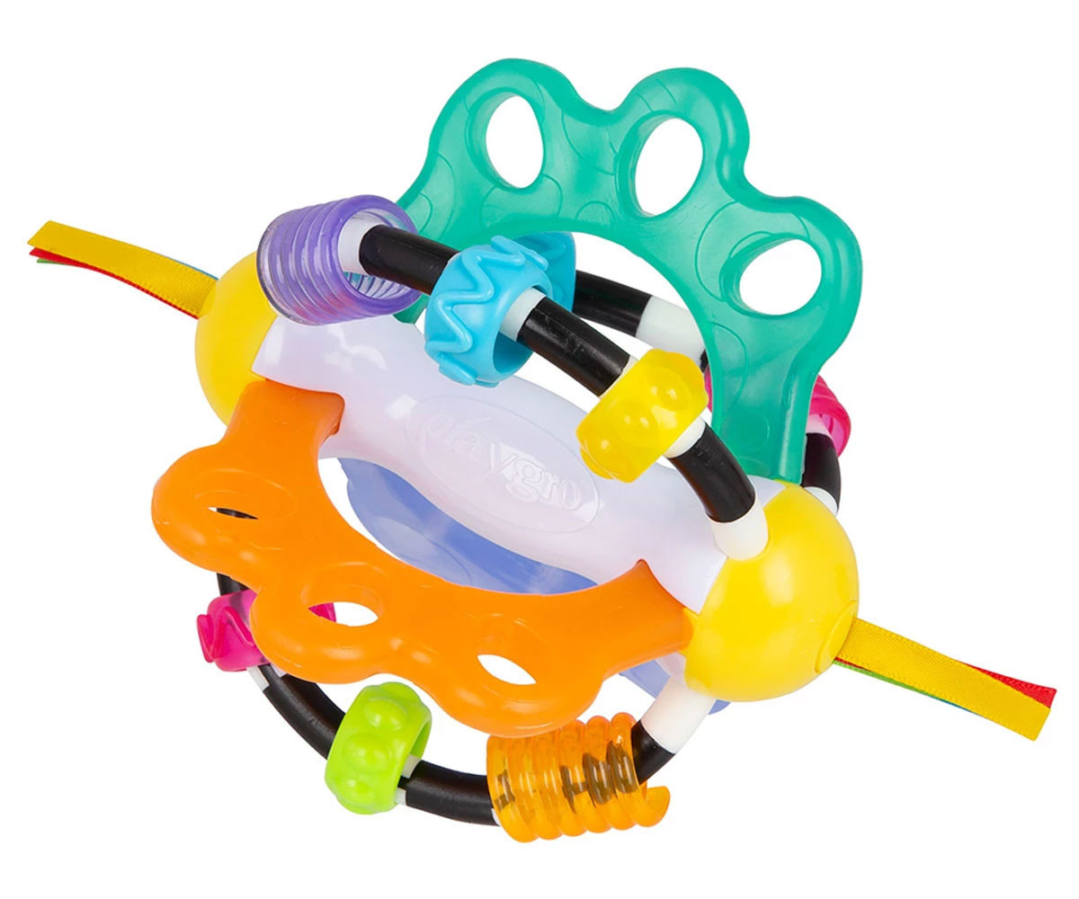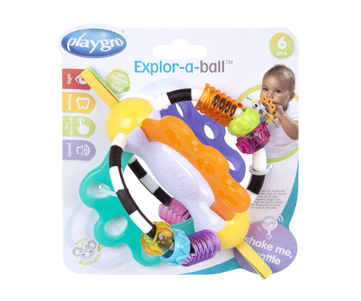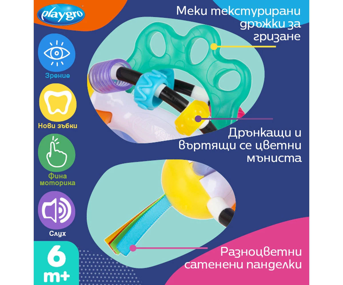 Playgro Дрънкаща топка Откривател. Забавна и цветна играчка, която насърчава бебето да изследва различни текстури, меки и твърди повърхности и ярки цветове. Чрез хващане и разтърсване на топката се развива грубата моторика, а играта с лентичките и мънистата подпомага фината моторика. Вградените части за гризане облекчават дискомфорта при никнене на зъбките. Лека и удобна за захващане, топката е снабдена с дрънкащи мъниста, цветни сатенени панделки и разнообразни текстури за цялостно сетивно развитие.