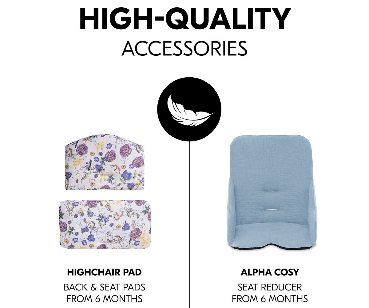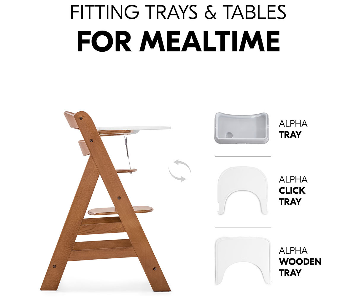 Alpha+ може да се комбинира с таблата Alpha Tray, което позволява използване като самостоятелно столче от 6-месечна възраст.