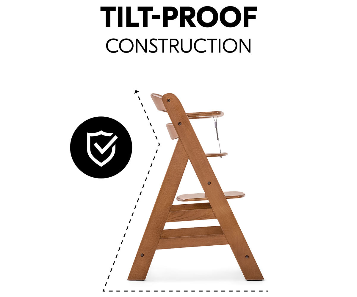 Стабилната конструкция и вградените плъзгачи за под осигуряват защита срещу преобръщане. Ако детето се отблъсне от масата, столчето леко се приплъзва назад, вместо да се накланя.