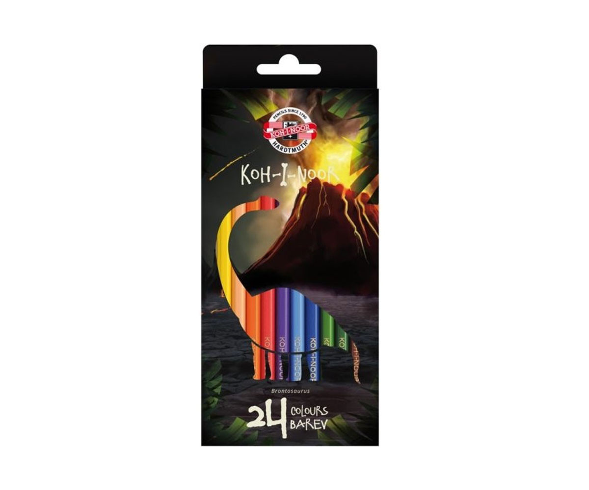 За да бъде едно дете напълно подготвено за училище, са му нужни основни учебни пособия – сред тях задължително място заемат цветните моливи. Именно затова KOH-I-NOOR разработиха специалната ученическа серия Dino, в която влиза и комплект от 24 цветни молива. Те имат шестостенно тяло с диаметър 6.9 мм и графит с дебелина 3.2 мм. Дължината на всеки молив е 175 мм, като всички пристигат добре подострени и готови за употреба.