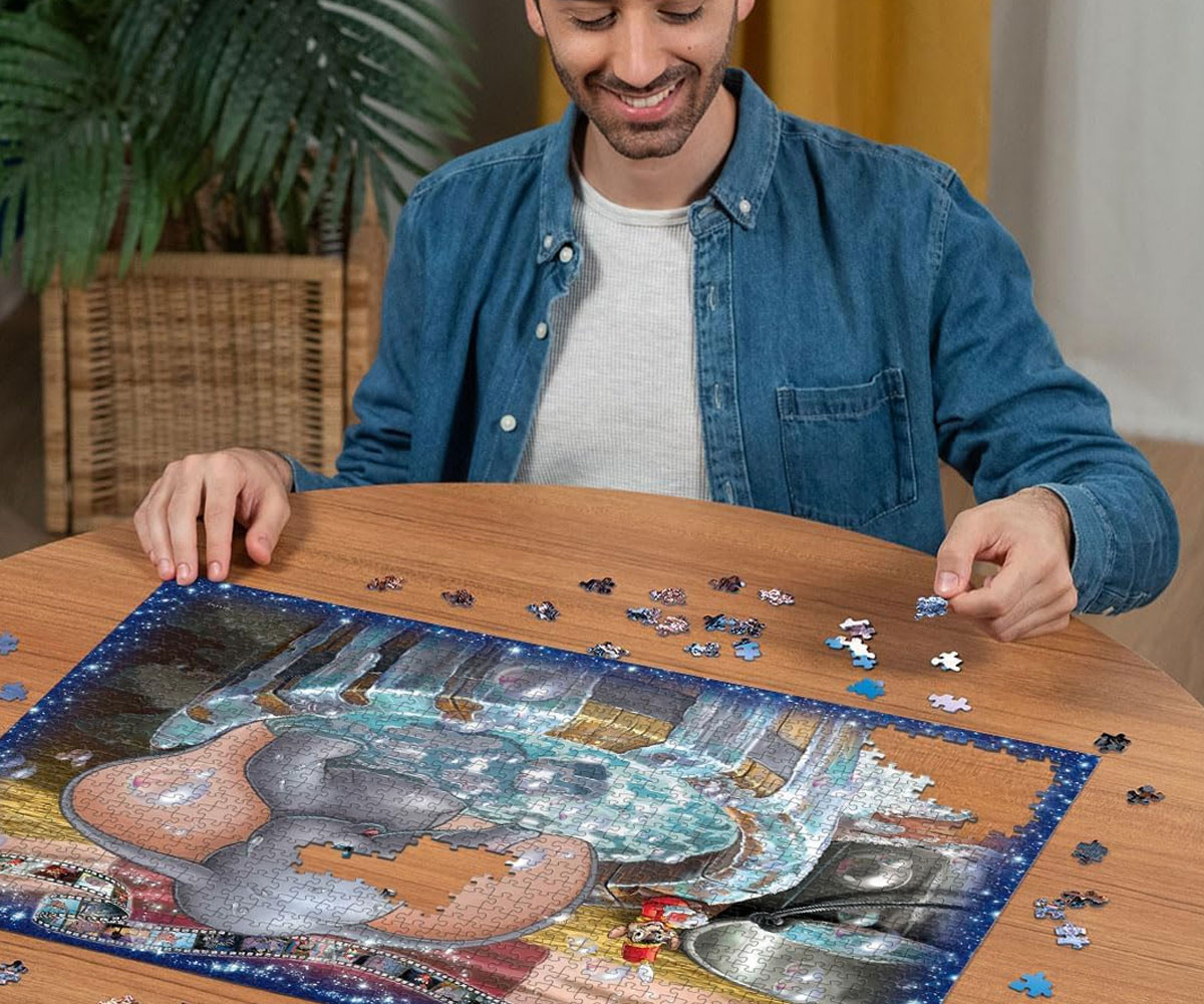 Оставете грижите зад гърба си и се потопете в магията на Дисни с най-сладкото слонче с големи уши и неговия верен приятел – Тимъти Кю Маус! Представяме ви пъзела „Дъмбо“ от Колекционерската серия на Disney – истинско бижу за феновете на класическите анимации! Историята на малкото цирково слонче Дъмбо е създадена през 1941 г. и остава един от най-кратките, но най-обичани пълнометражни филми на Дисни. В този очарователен пъзел ще откриете Дъмбо, който се наслаждава на пяна и балончета във ваната, под зоркия поглед на своя най-добър приятел Тимъти Кю Маус. В горната част на дизайна ще откриете и филмова лента с емблематични сцени от филма. Пъзелът е част от специална колекция от 5 класически Дисни заглавия. Пъзелите Ravensburger от 1000 части са направени с първокласно качество и са с размери 70 x 50 см, когато са готови. Идеални за възрастни и за деца над 14 години. Изработени са от изключително дебел картон, комбиниран с фина, ленена структурирана хартия, за да създадат изображение без отблясъци и да осигурят възможно най-доброто изживяване. От забавно прекарано време заедно със семайството, до пълен релакс след напрегнат ден, има толкова много положителни неща в реденето на пъзели. Това е подкрепено от десетилетия опит в производството на пъзели и високи стандарти за качество за материал, мотив и дизайн. Уникалността на характерните части от пъзела се постига чрез ръчно изработени инструменти за щамповане, които се произвеждат с най-голяма часовникарска прецизност в Равенсбург в Горна Швабия. Тази страст към качеството, вниманието към детайла и огромната селекция от мотиви правят пъзелите Ravensburger толкова уникални и гарантират незабравимо изживяване.