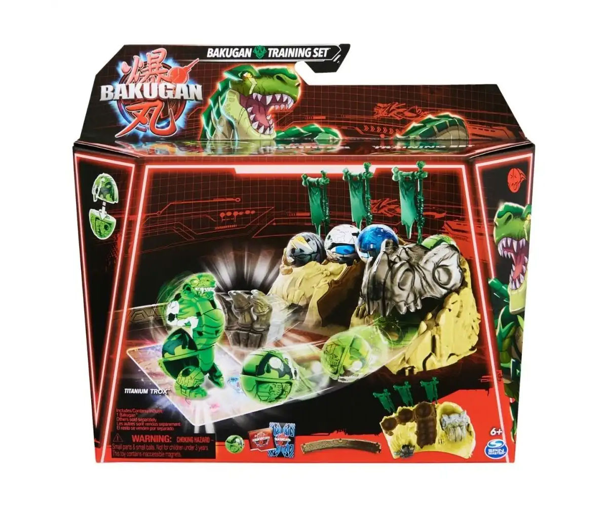 Персонализирайте и подобрете всяка Bakugan Battle с Bakugan Training Set. Всеки комплект за игра и Bakugan са тематични въз основа на различни кланове от шоуто. Пресъздайте свои собствени битки и препятствия с гребло с пружина, 3 тотема и стена за уникален геймплей всеки път. Пуснете, търкаляйте се и дръжте своя Bakugan върху този комплект за игра и задръжте действието със стената. Приземете своя Bakugan върху Gate Card за емблематични отворени трансформации. Влезте в битката с включените знамена на клана, за да представите вашия Bakugan. Използвайте картата с герои за нови статистики, за да повишите нивото на играта си. Всяка екшън фигурка Bakugan включва специален код за използване в онлайн играта Roblox за нови начини за игра и взаимодействие. Комбинирайте множество тренировъчни комплекти или Battle Arena, за да създадете по-големи битки за повече действие. Добавете всички нови Bakugan, горещи играчки като вашите нови любими колекционерски предмети, включително други специални атакуващи и бойни пакети (всеки се продава отделно). Използвайте Baku-tin (продава се отделно) като идеалното място за съхранение на играчки или калъф за бакуган за всичките ви свирепи герои и карти Bakugan, докато влизате в следващата Bakugan Battle. Тренирайте, за да станете победители с тренировъчните комплекти Bakugan.