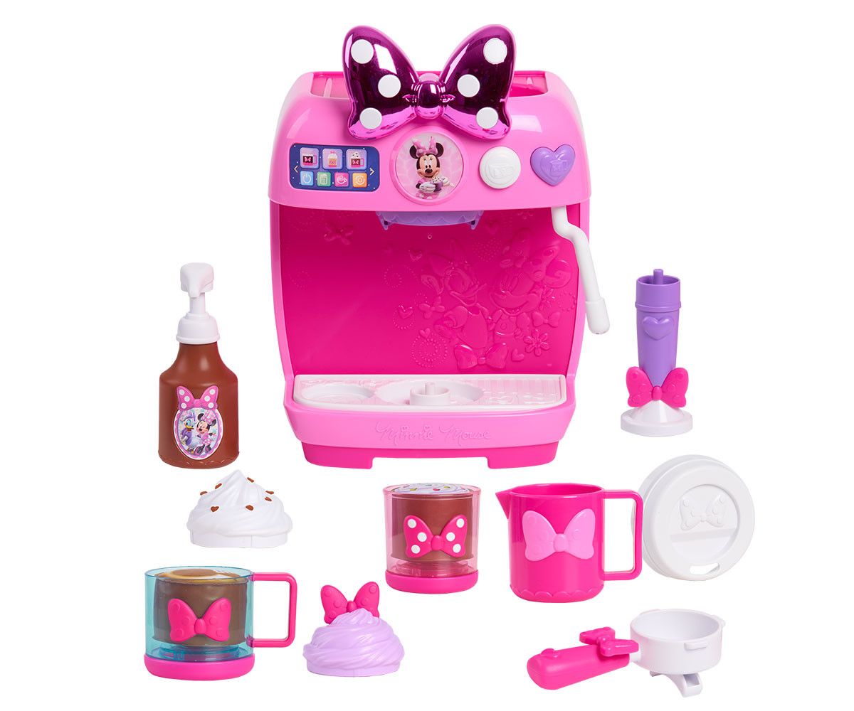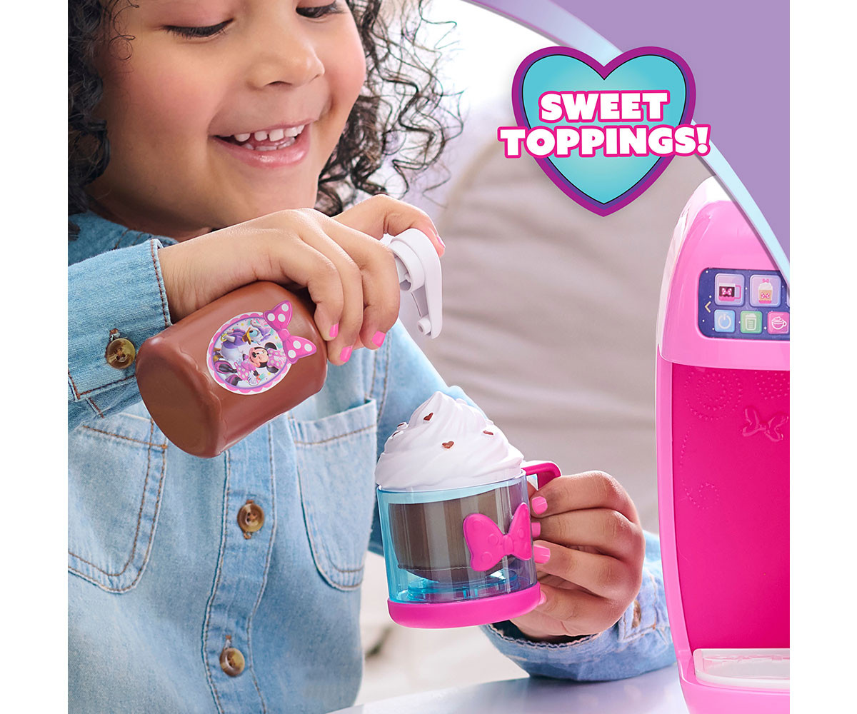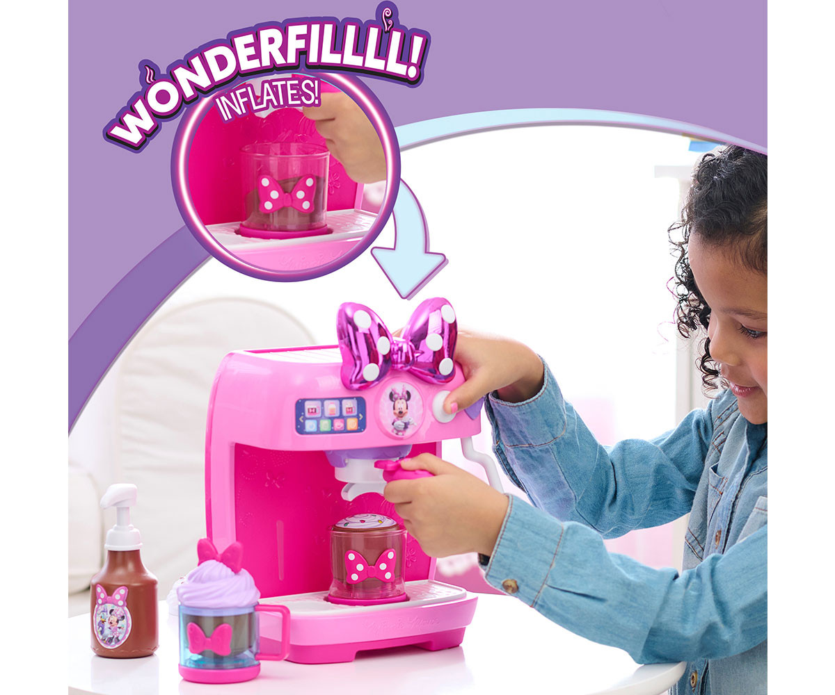 Създай незабравими кафе-моменти с този комплект от 10 части за деца, вдъхновен от Мини Маус! Играчката-еспресо машина предлага светлини, реалистични звуци, фрази от Мини Маус и две сладурски чашки с панделки, които се пълнят „до ръба“! Постави филтъра в машината, заключи го и сложи чашката върху подложката. Натисни белия бутон и виж как системата Wonderfill надува „кафето“ в чашата – сякаш истинска еспресо машина работи! Разбий „мляко“ с каничката за пяна, добави „сироп“ и капаче със сметана, за да довършиш напитката. А когато е време за ново кафе – източи чашката с помощта на панделката на Мини или с тампера отдолу. Комплектът е перфектен за ролеви игри, създава безкрайни сценарии за игра с приятели и семейство и е чудесен подарък за всеки малък фен на Дисни!