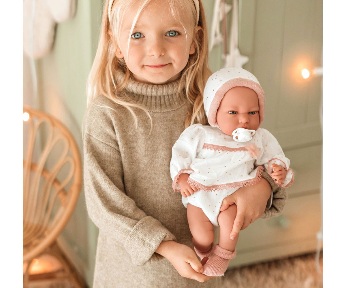 Кукла ELEGANCE Анди 40 см с механизъм за плач. Облечена в светли и розови тонове. Включва кошче и залъгалка. Анди е толкова сладко бебе, че няма да искате да я оставите. Когато ѝ натиснете коремчето, тя започва да плаче. Освен това, тялото й е меко, а главата и крайниците ѝ са изработени от винил и излъчват нежен аромат на ванилия. Облечена е в дрешки в светли принтове и розови цветове, които пасват идеално на нейното кошче. Включва залъгалка.