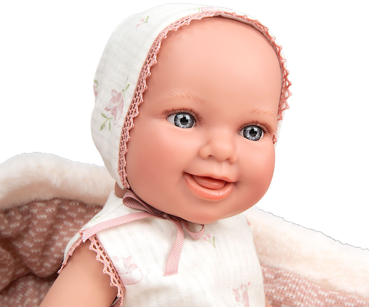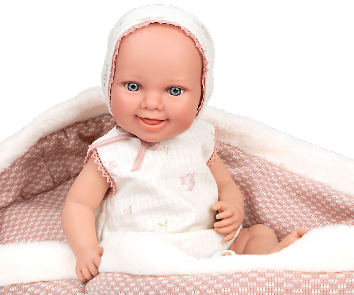 Кукла Оли ELEGANCE 38 см, облечена в розови и бели тонове с подходяща качулка и кошче. Теглото ѝ е толкова реалистично, че се усеща като истинско бебе. Включва залъгалка и кошче. Малката Оли е облечена в най-сладкото си комплектче с качулка, за да се наслади на най-прекрасните вечери до вас. Най-специалната ѝ характеристика е, че тежи колкото истинско бебе. Изработена е изцяло от винил и излъчва нежен аромат на ванилия, който ще ви очарова. За дрешките ѝ са подбрани само висококачествени материи.