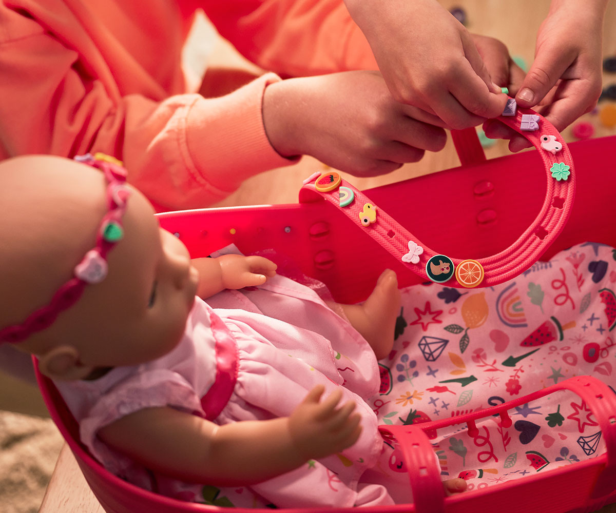 Към люлката могат да се добавят и други продукти от серията BABY born Pinplay – чанти за аксесоари, дрешки или обувки с пинове. Самите пинове се предлагат отделно в разнообразни дизайни – от животни до букви и символи. Идеален подарък – 3-в-1 люлката съчетава множество идеи за игра в едно, а Pinplay системата добавя уникален и персонализиран щрих, без нужда от допълнителен монтаж.