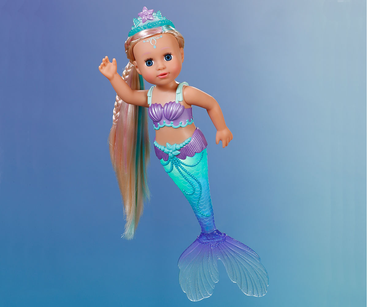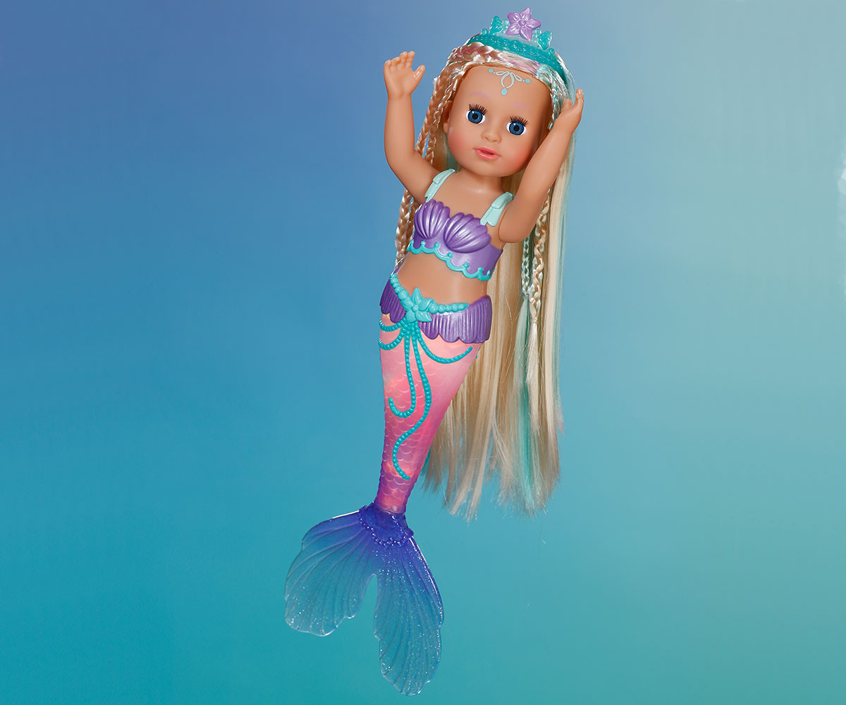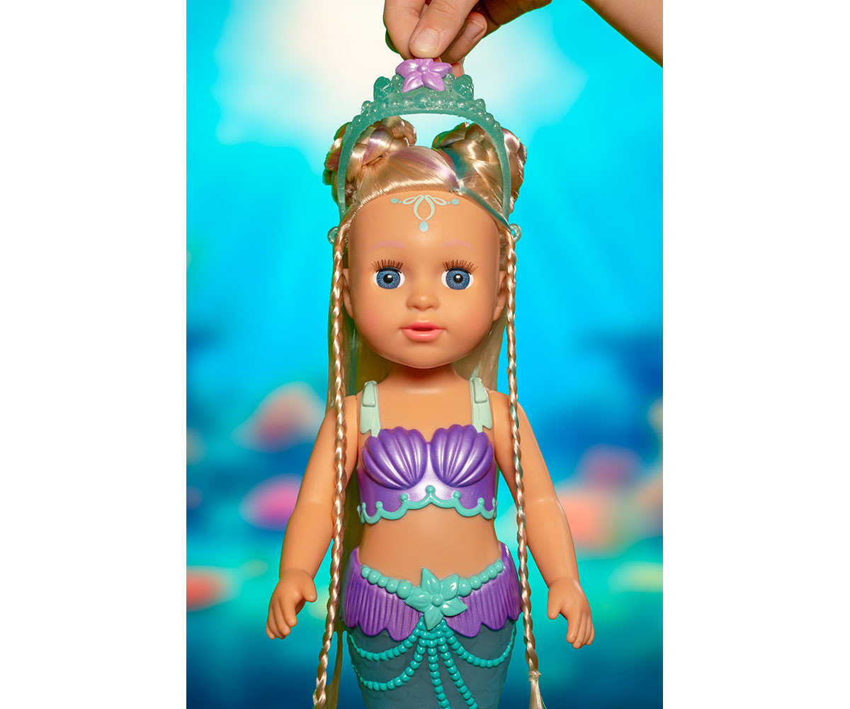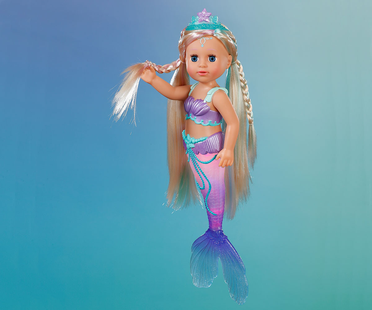 В омагьосаното подводно царство, където слънцето кара вълните да блестят, живее смела и игрива русалка. Денем тя открива коралови рифове заедно със своите морски приятели, а нощем танцува под лунните лъчи, създавайки искрящи вълни със своята магическа опашка. Сега тази приказна русалка е готова да пренесе чара на океана във вашия дом! Превърнете банята в истинско подводно приключение и оставете въображението да се понесе с BABY born Русалка с дълга коса!