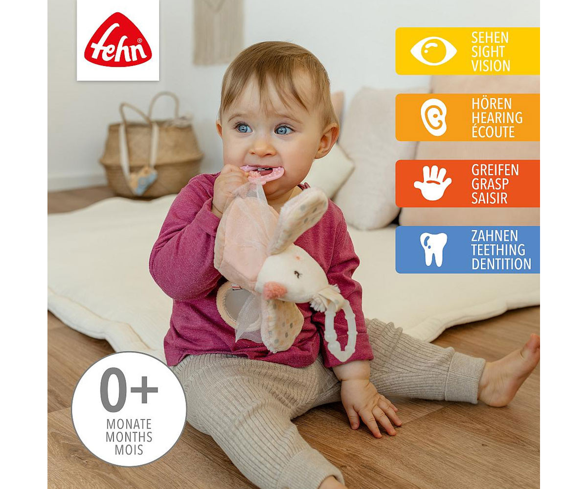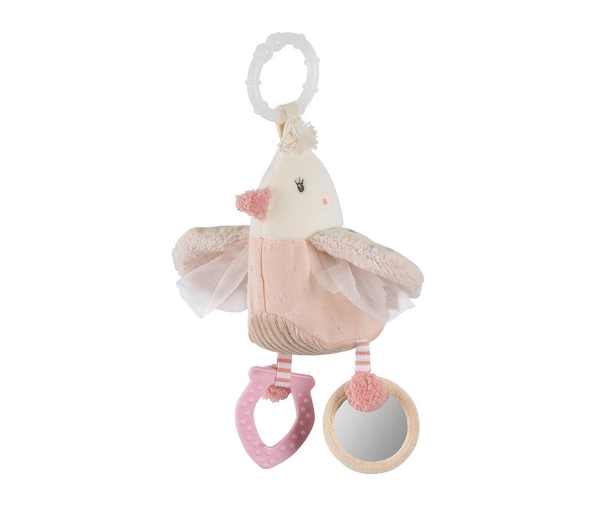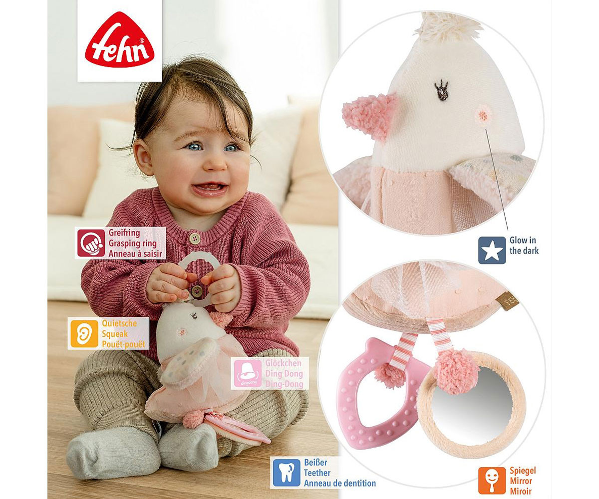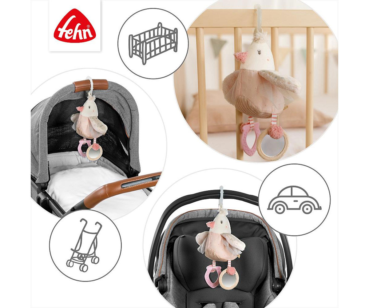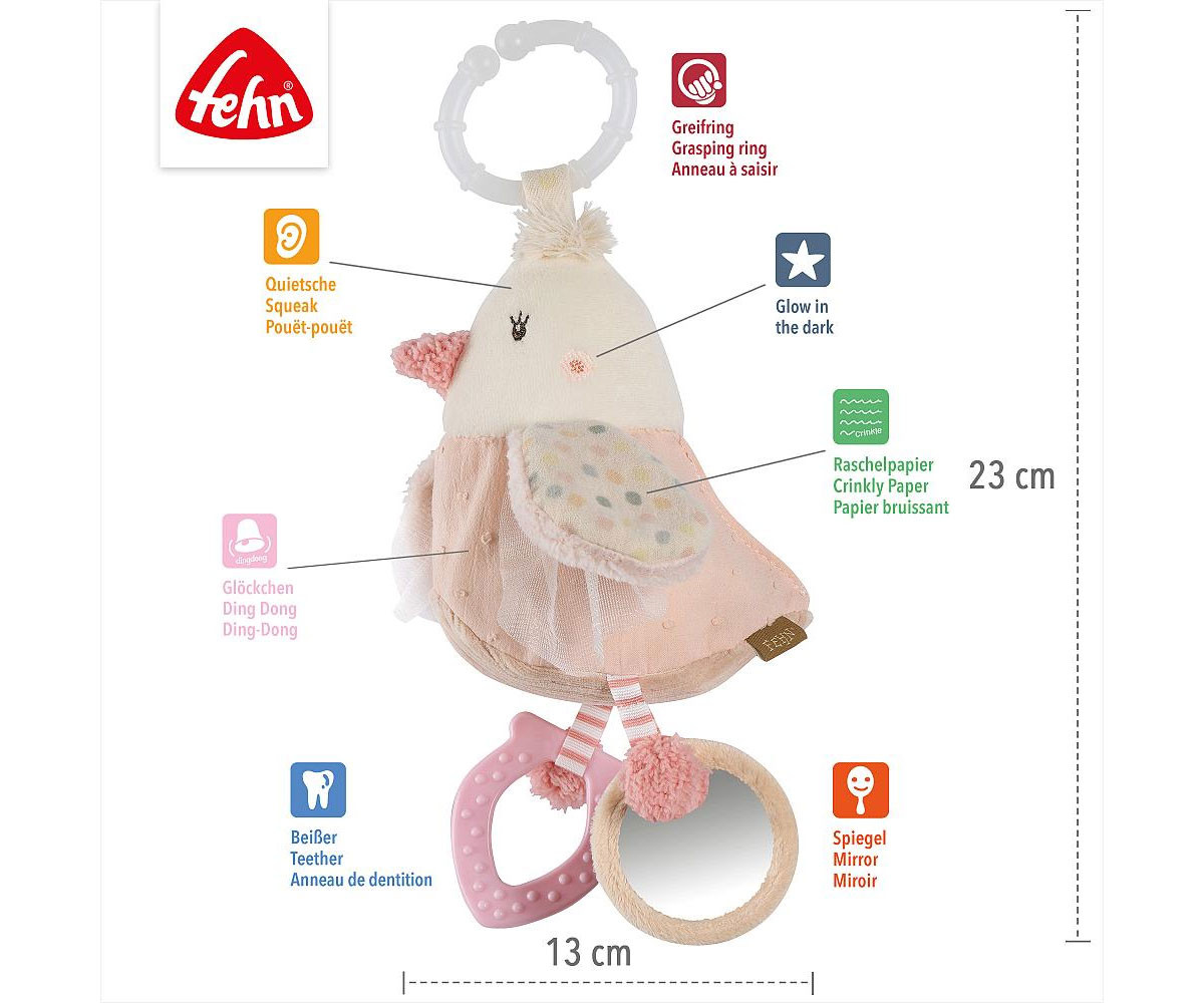 Забавно игрово забавление, както у дома, така и на път: С практичния пръстен, играчката с активност „Птиче“ от колекцията feehnLAND може лесно да се прикрепи към количка, кошче за бебе или легло. Разнообразието от игрови възможности осигурява добро настроение навсякъде: камбанка, гризалка, пищялка, шумоляща хартия и пръстен за хващане стимулират любопитството и подпомагат развитието на хващането, тактилното усещане и фината моторика на бебето. Малкото огледало допринася за положителното развитие на самосъзнанието, а фееричната бродерия „Glow-in-the-dark“ прави малката птица най-добрия приятел на бебето.