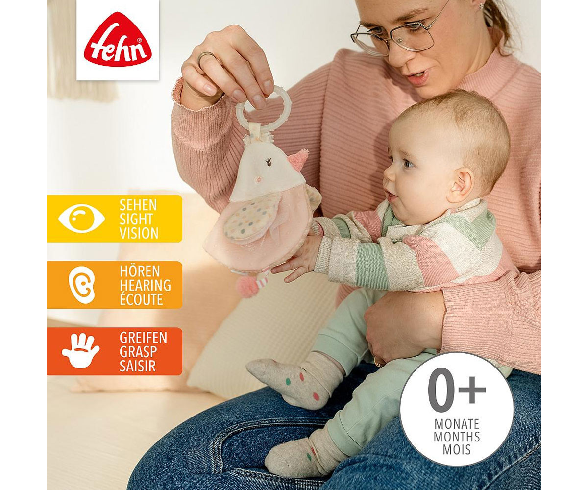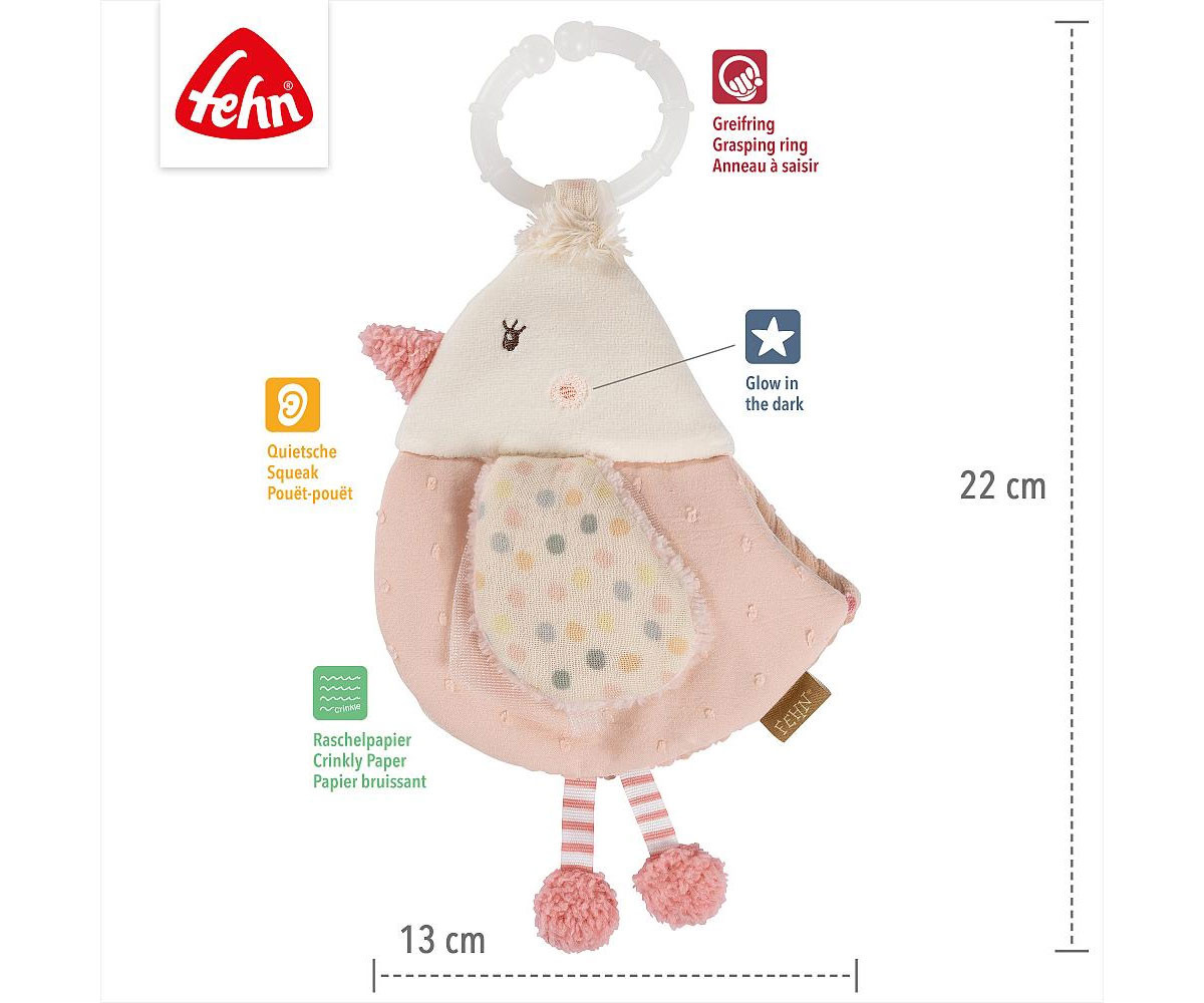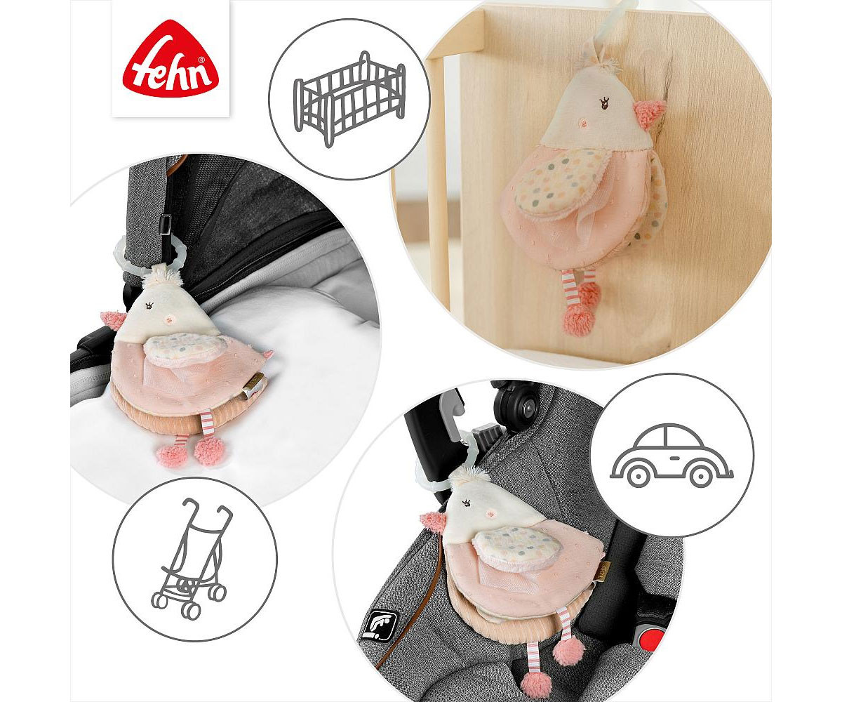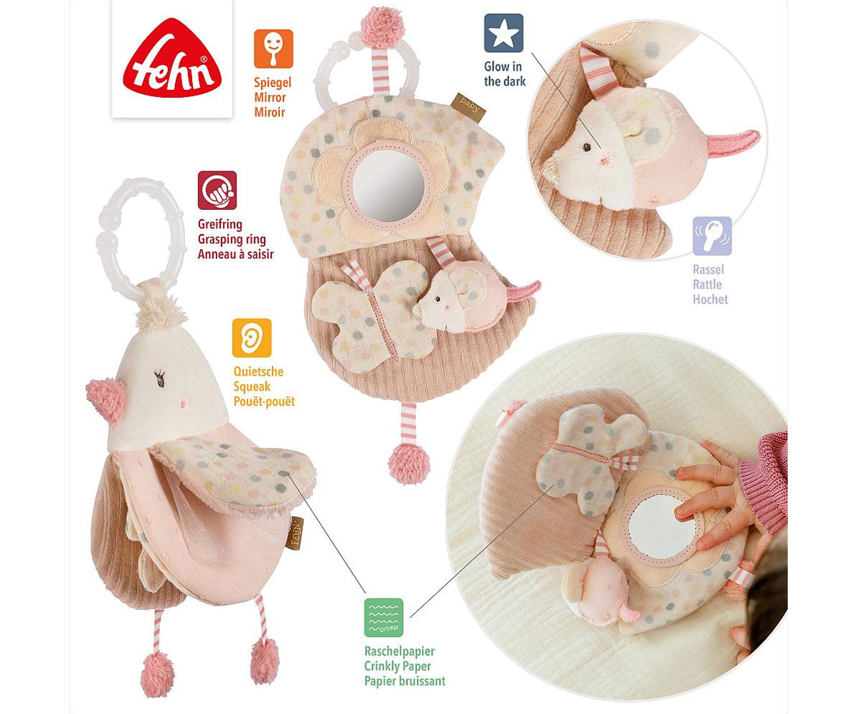 Очарователната птица и нейните скрити приятели от колекцията feehnLAND канят бебето да открива, изследва и пипа. Под крилете на птицата са се сгушили мишка и пеперуда, които заедно с малкото огледало създават удивление на лицето на бебето. Това насърчава първоначалните упражнения за хващане, тактилното усещане и допринася за положителното развитие на самосъзнанието на бебето. Бродерията „Glow-in-the-dark“ свети в тъмното. Пръстенът за закрепване на меката книжка осигурява лесно и сигурно прикрепване към кошчето за бебе, количката, детското легло или в колата. Перфектно за забавление както вкъщи, така и на път!