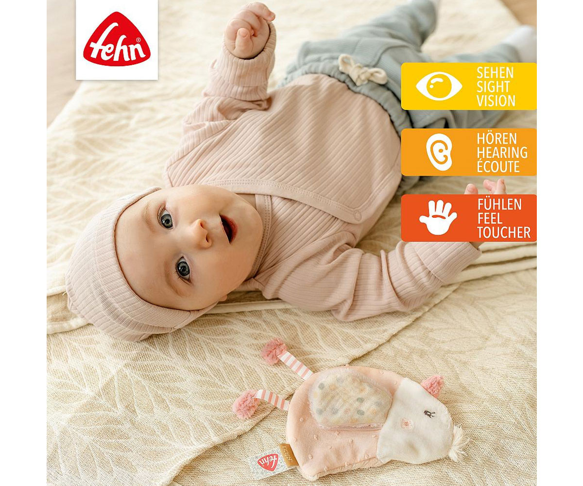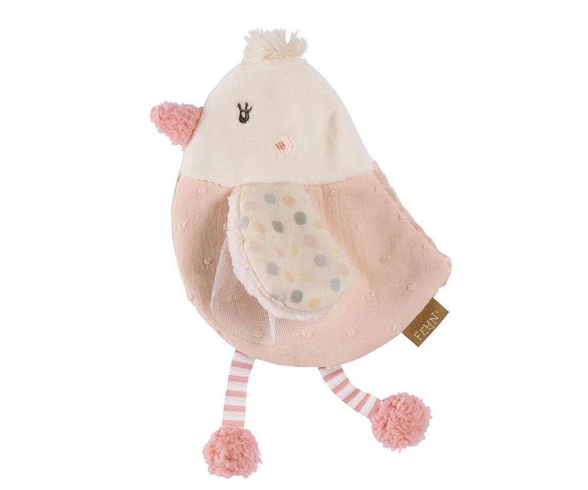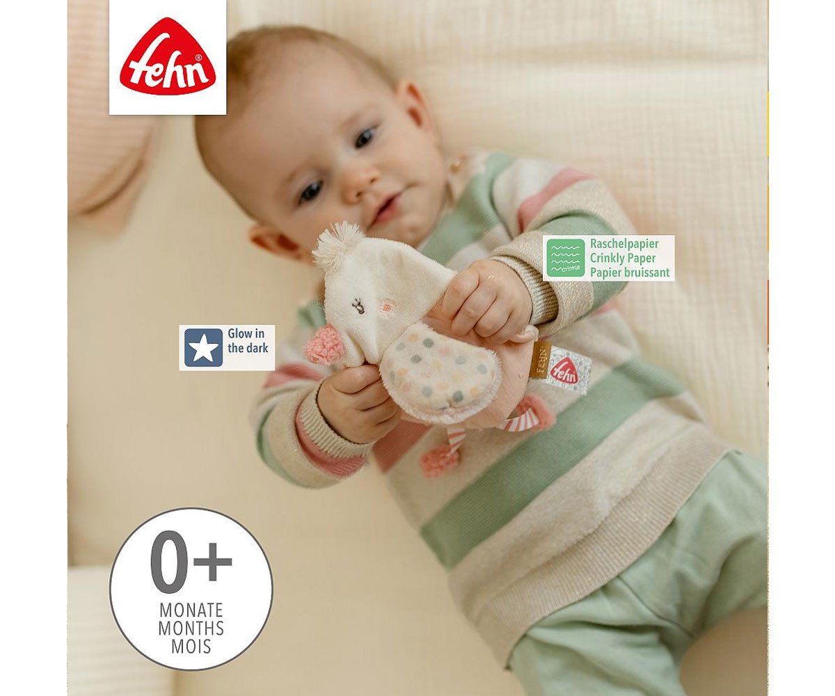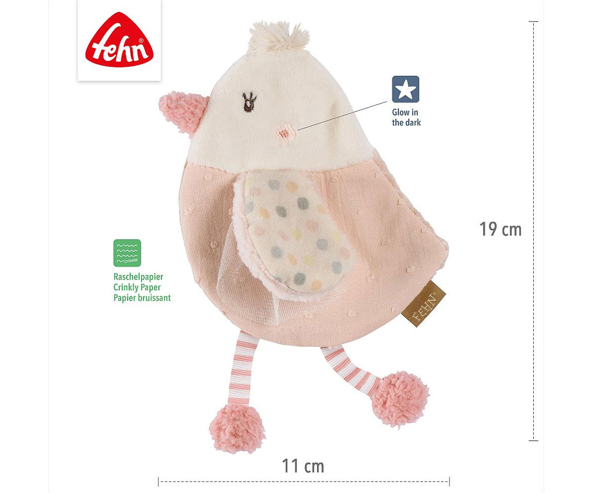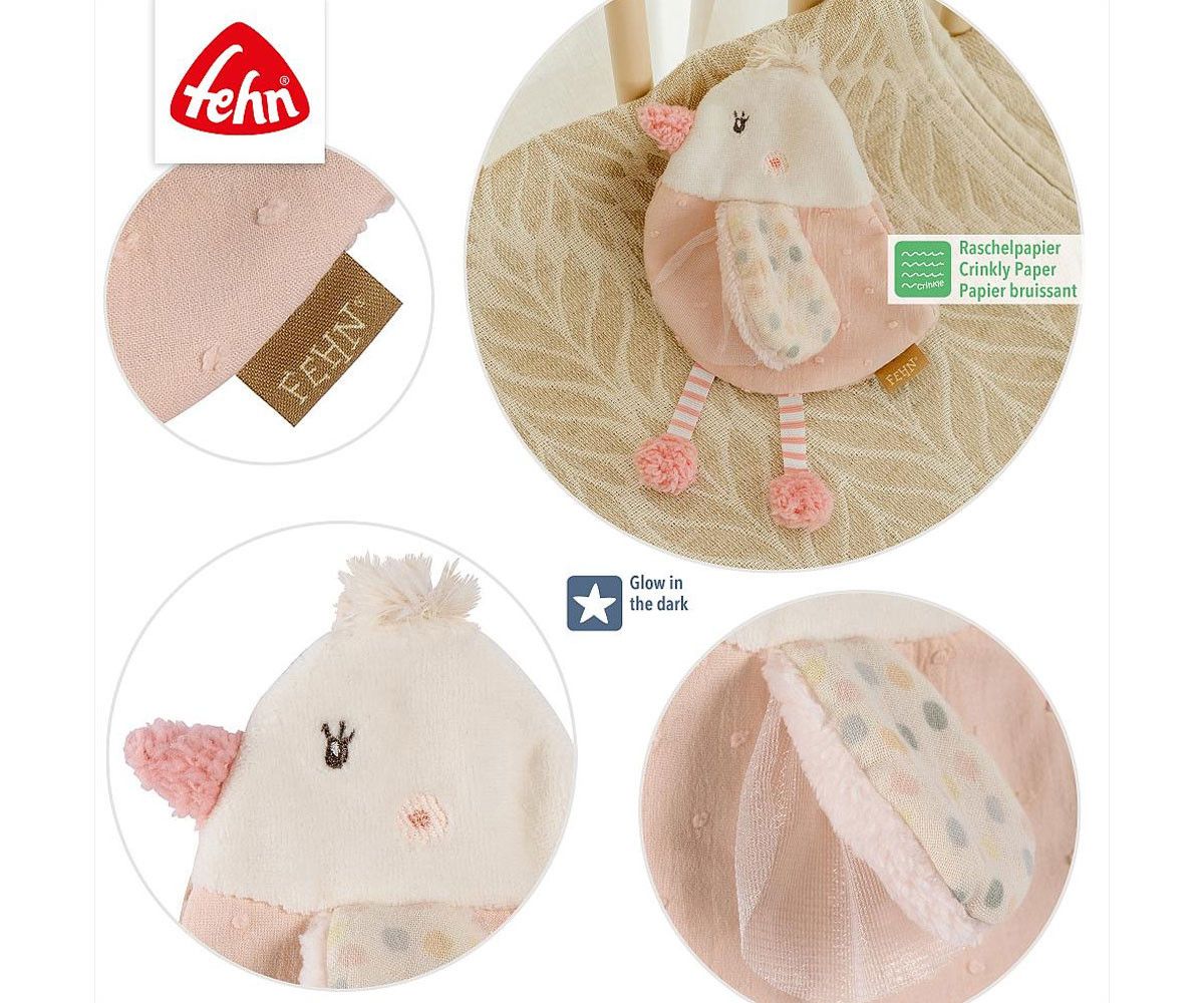 Малкото шумолчщо птиче от колекцията feehnLAND игриво стимулира слуховите, тактилните и хващащите способности на бебето. С разнообразните материали и вълнуващите звуци на скритата шуоляща хартия, никога не е скучно. Бебетата обичат формата на сладката птица за хващане, пипане, открития и гушкане! Бродерията „Glow-in-the-dark“ на малката птица помага на бебето да преодолее страха от тъмнината при заспиване и осигурява уют. Меката птица може да бъде взета навсякъде и е перфектен спътник на бебето при игра и мечтаене.