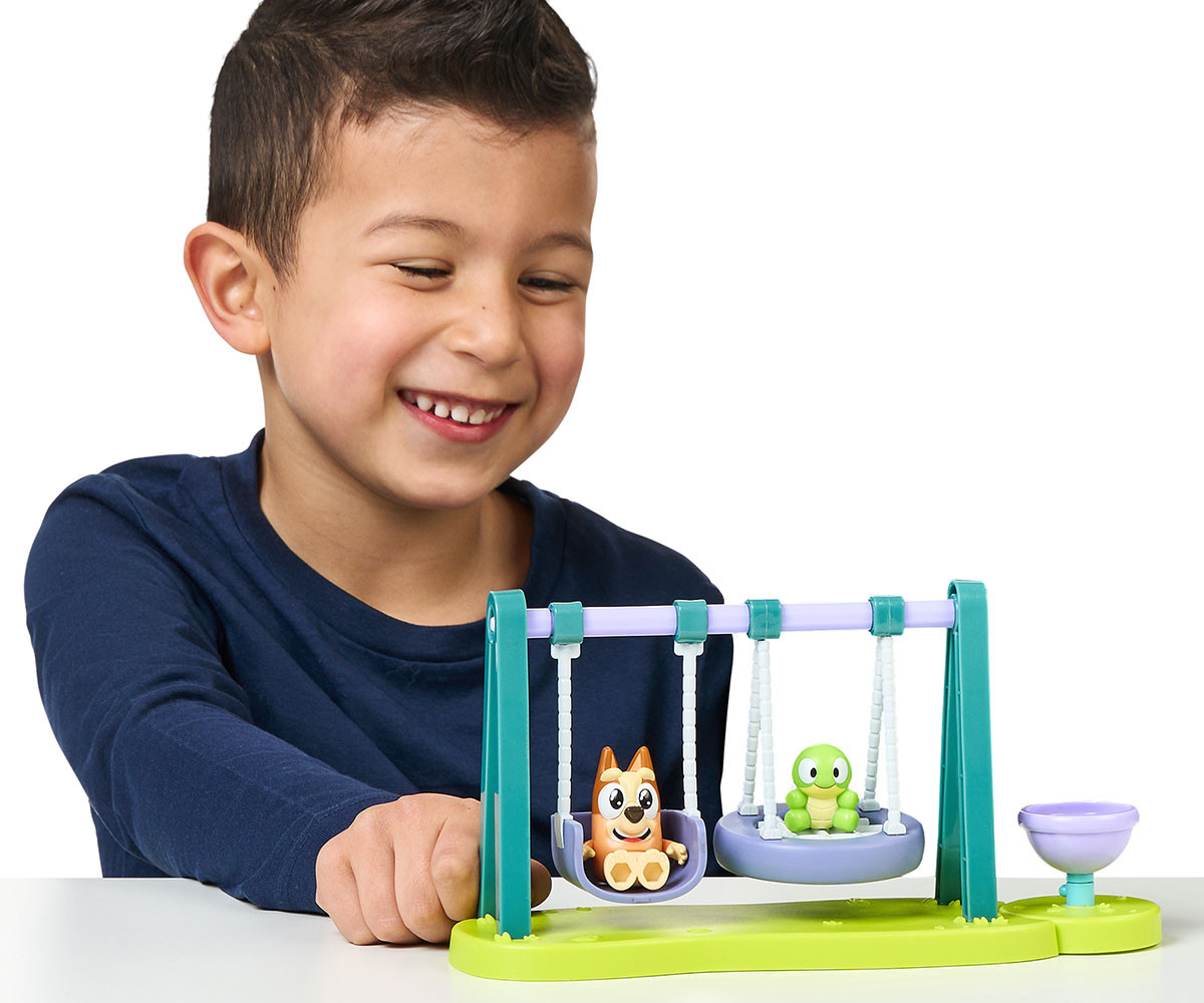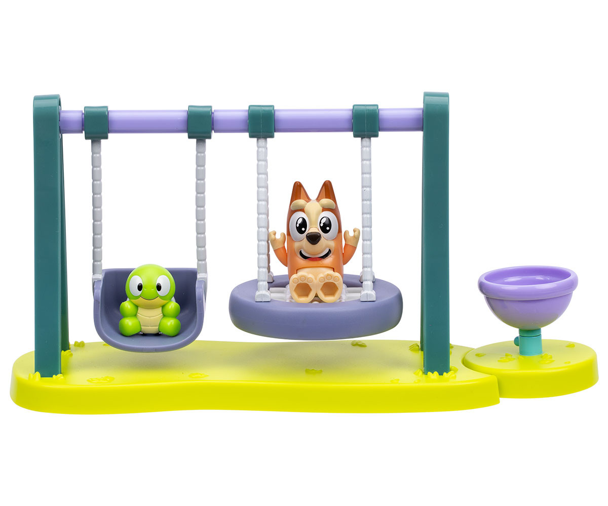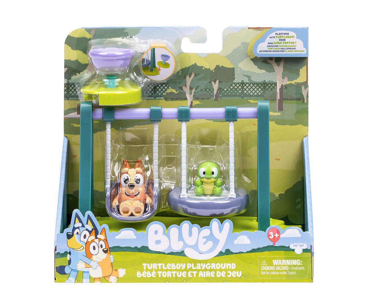 Игралният комплект Turtleboy Playground включва фигурки на Бинго и Turtleboy. Този забавен мини комплект разполага с люлки и въртележка с подвижни елементи. Люлейте Бинго и Turtleboy напред-назад на люлките и се забавлявайте с играта. Поставете фигурките на въртележката и ги завъртете, за да оживеят още повече приключенията! Децата ще се радват да пресъздават любимите си сцени от анимационния сериал, както и да измислят нови истории и приключения в света на Bluey.