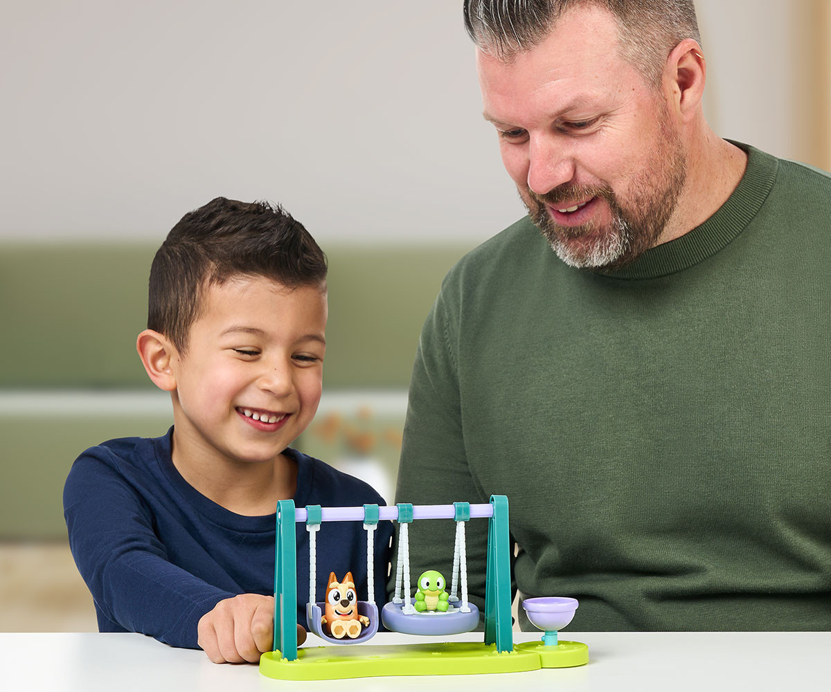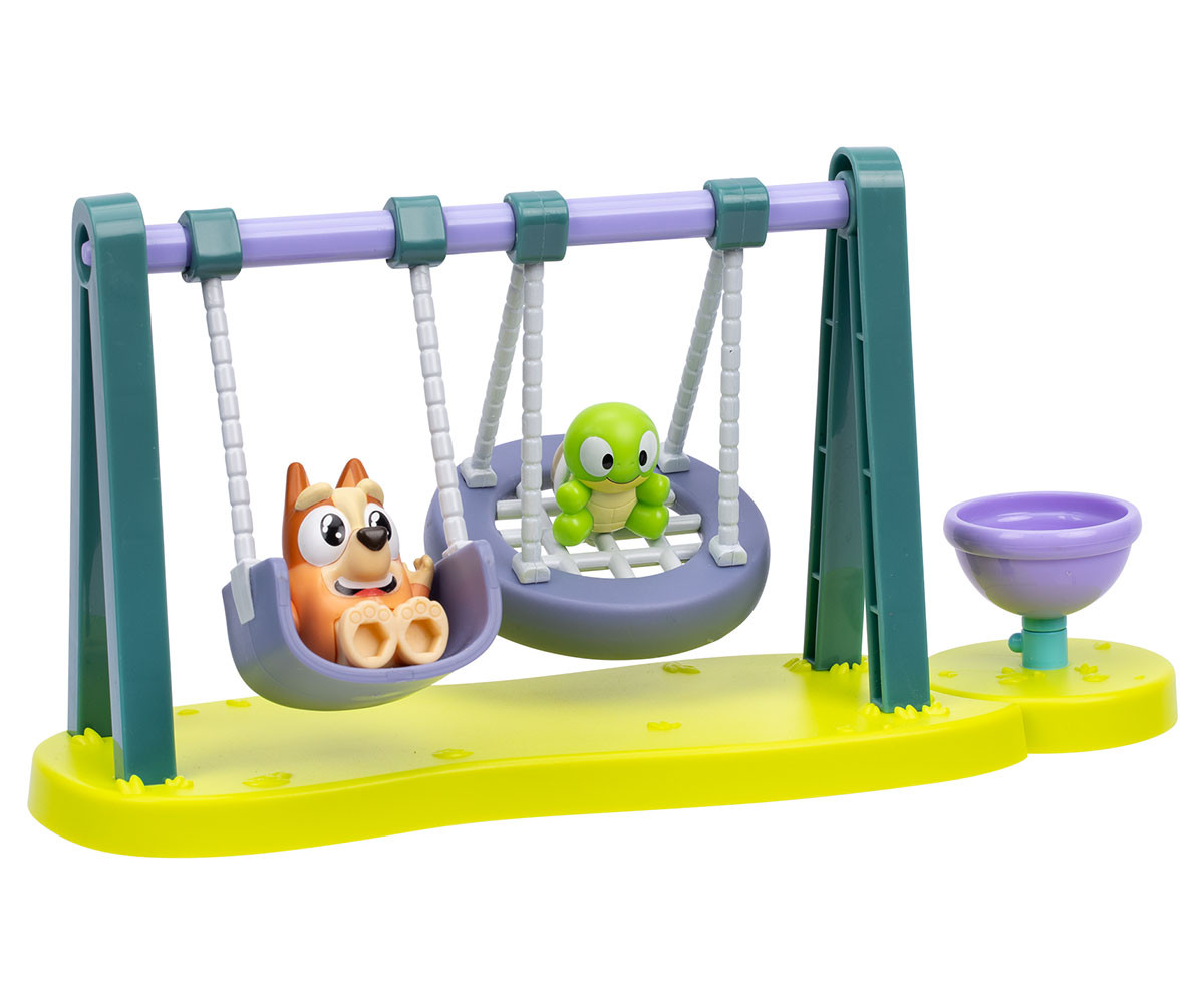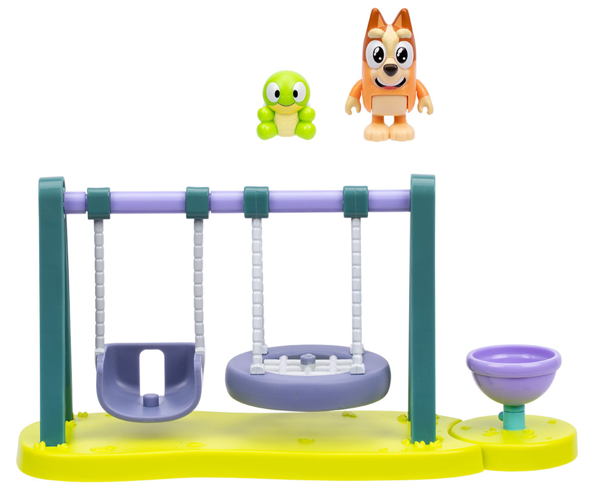 Игралният комплект Turtleboy Playground включва фигурки на Бинго и Turtleboy. Този забавен мини комплект разполага с люлки и въртележка с подвижни елементи. Люлейте Бинго и Turtleboy напред-назад на люлките и се забавлявайте с играта. Поставете фигурките на въртележката и ги завъртете, за да оживеят още повече приключенията! Децата ще се радват да пресъздават любимите си сцени от анимационния сериал, както и да измислят нови истории и приключения в света на Bluey.