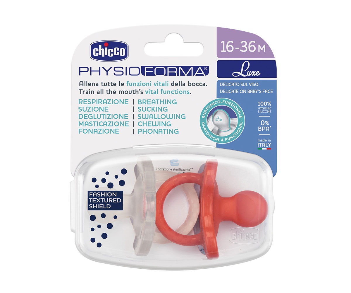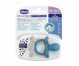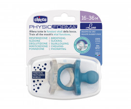 Изключително мека и нежна към кожата, Physioforma® Luxe е първата залъгалка с модерен текстуриран щит и различни непрозрачни цветове в зависимост от размера. Мека и деликатна, залъгалката Physioforma® Soft е предназначена да придружава детето по време на сън, без да го безпокои или да оставя следи по кожата. 100% силикон: хигиеничен и недеформируем материал, избран заради своята практичност. Изключителното покритие SOFT SENSE го прави меко и кадифено. PhysioForma е изключителната анатомично-функционална форма на всички залъгалки Chicco, предназначена да насърчава и стимулира жизнените функции на устата по време на нехранително сукане, като същевременно поддържа физиологичното позициониране на езика, високо на небцето. Залъгалките Chicco PhysioForma® тренират всички жизненоважни функции на устата за здравословен растеж: дишане, сукане, преглъщане, дъвчене и фонация.