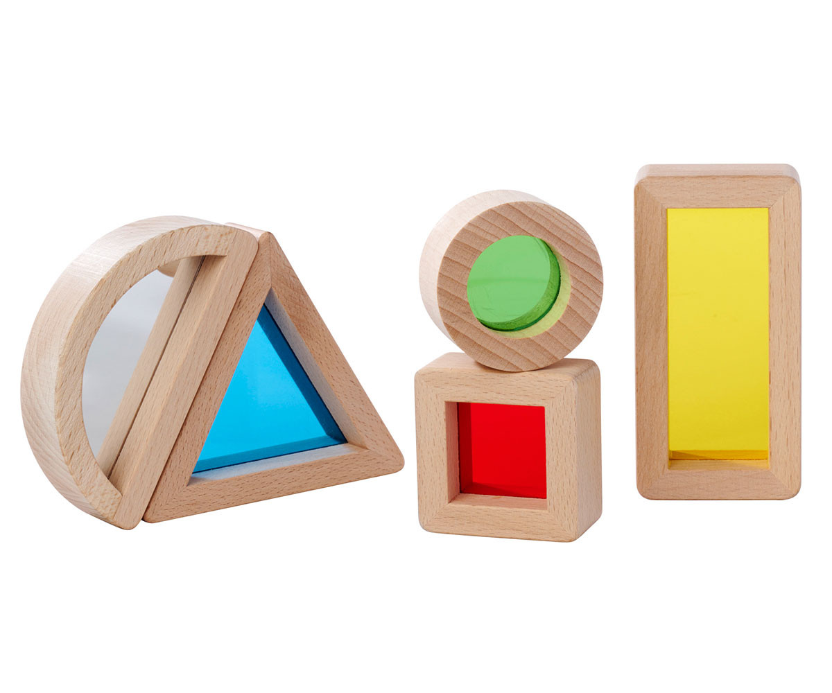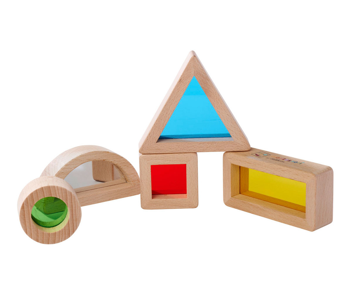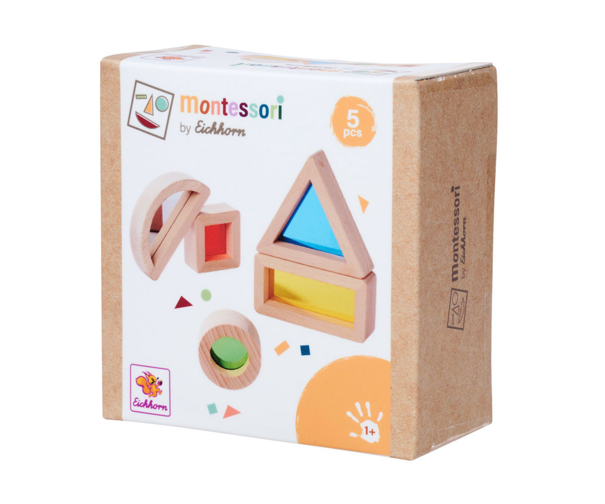 Триъгълник, правоъгълник, квадрат, кръг и дъга с огледало. Образователни цели: изучаване на цветове и геометрични форми, стимулиране на сетивата, координация око-ръка. Монтесори прозоречните дървени блокчета в 5 различни форми са истинско забавление за малките откриватели. Те са пълни с цветно акрилно стъкло, което приканва децата да изследват света през цветна „ленза“. Особено интересен е елементът с огледална повърхност, който ще предизвика възхищение и любопитство.