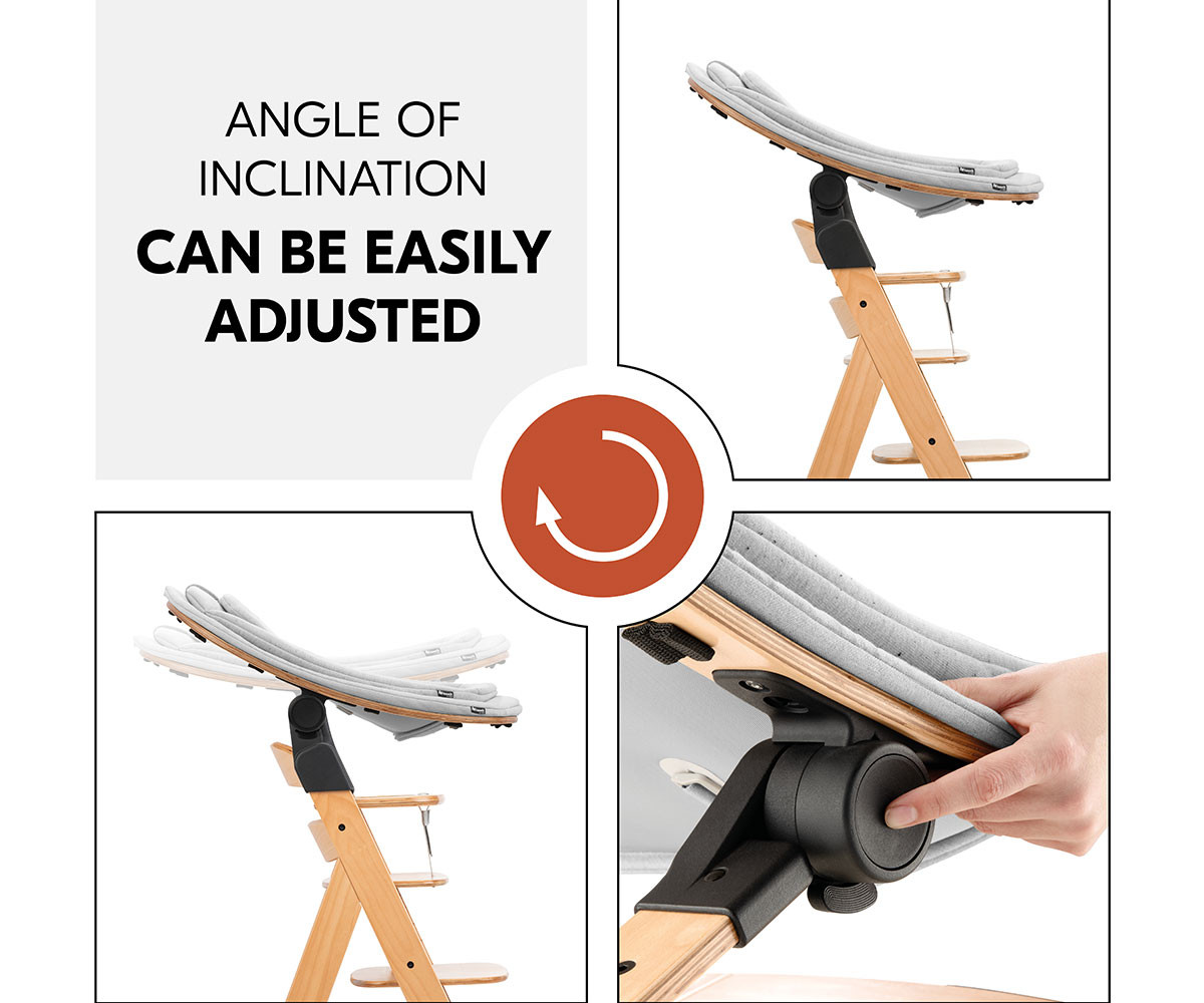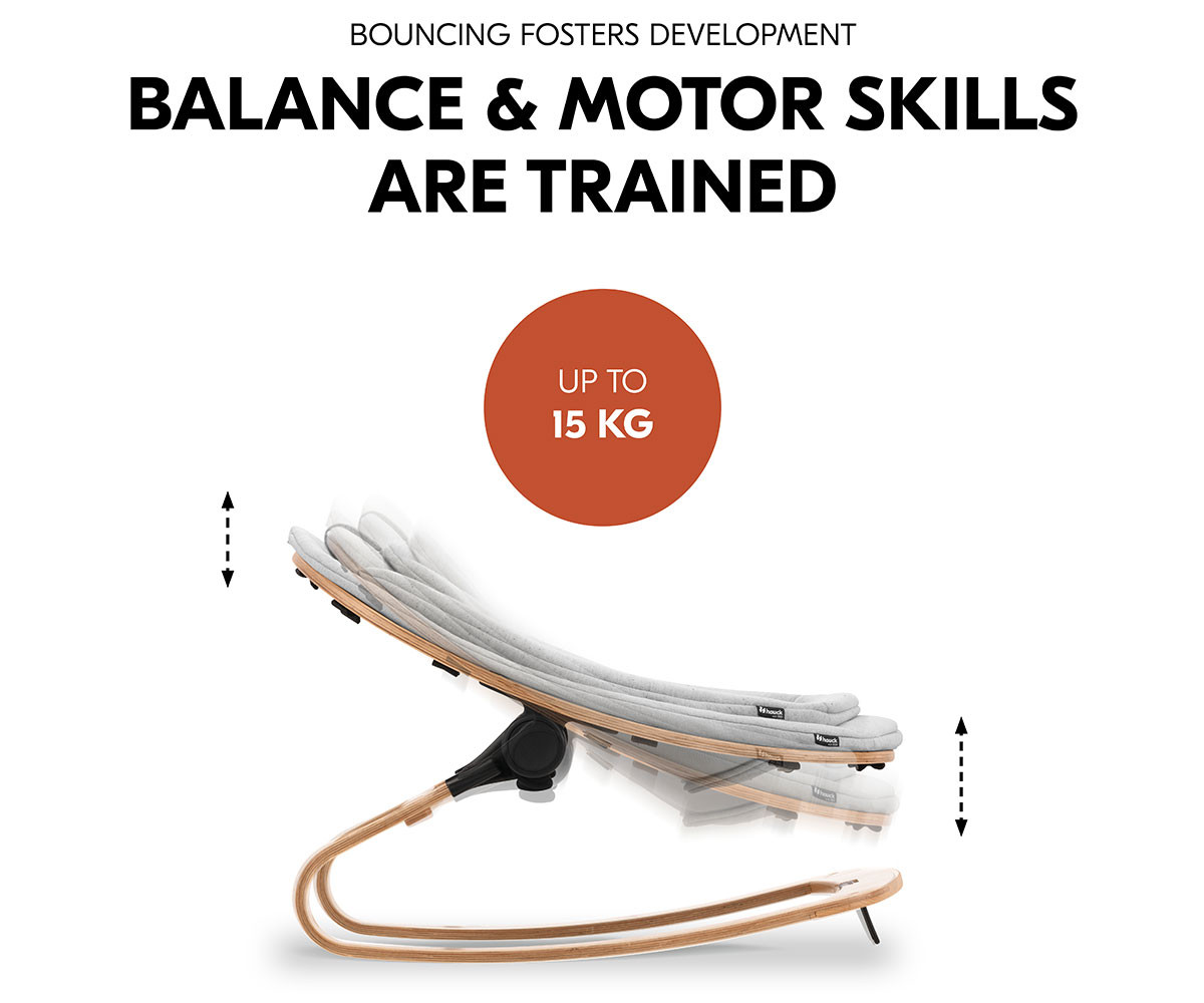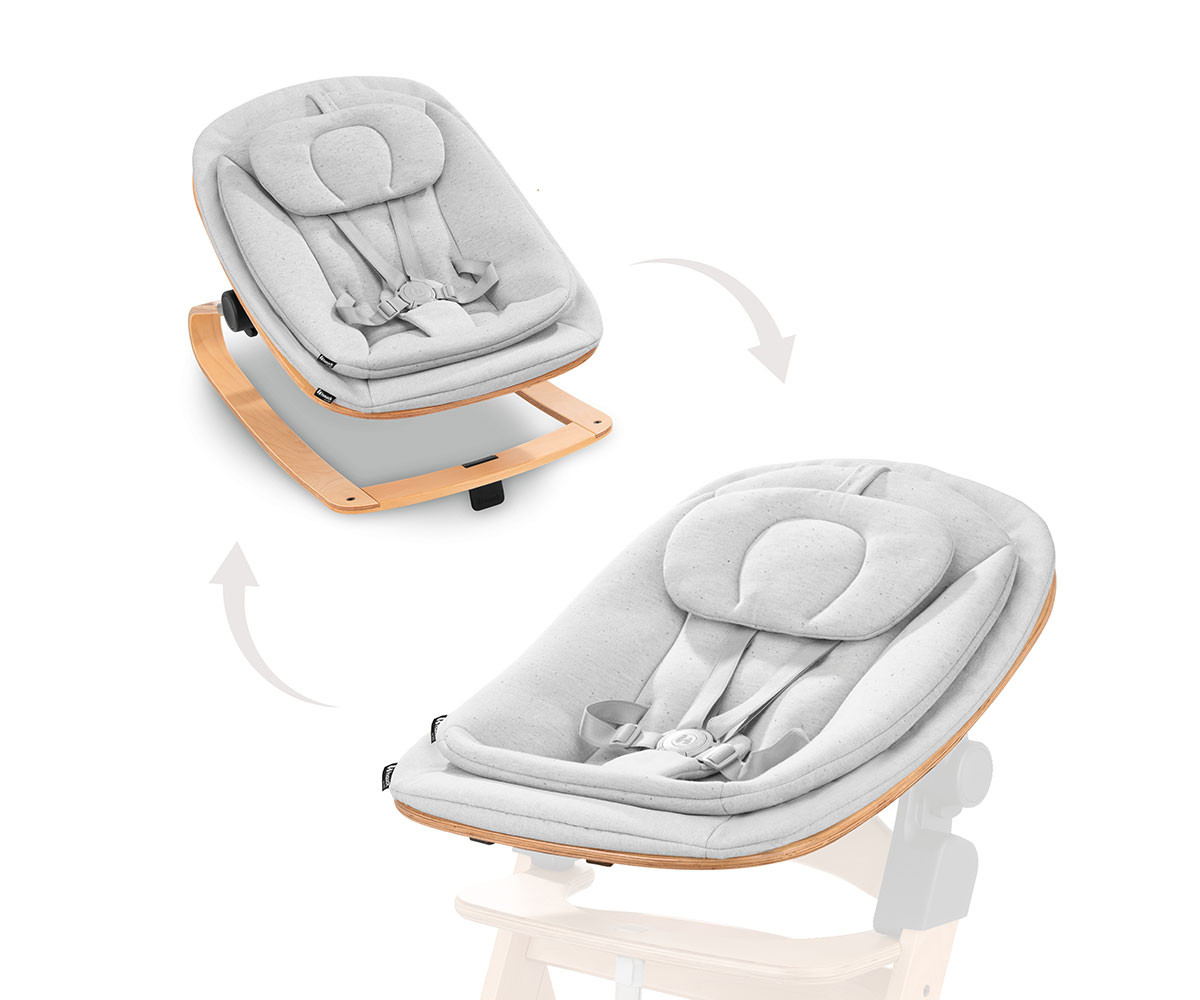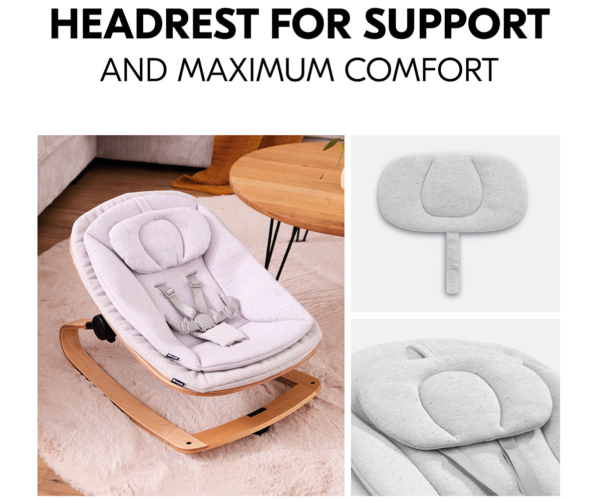Люлеенето насърчава развитието! Вашето бебе тренира баланс и моторни умения. Те могат да се люлеят или да почиват с Highchair Bouncer Eco, като издържа натоварване до 15 кг в режим на люлеене и до 9 кг като е прикачено към столче за хранене. Бърза промяна на позицията? Поставете лесно регулираната наклонена позиция на Highchair Bouncer Eco в легнало положение, когато бебето ви е уморено и наполовина изправено, когато иска да играе. Главата на бебето има нужда от много поддръжка. Highchair Bouncer Eco има специално подложка за главата. Това осигурява перфектна защита.