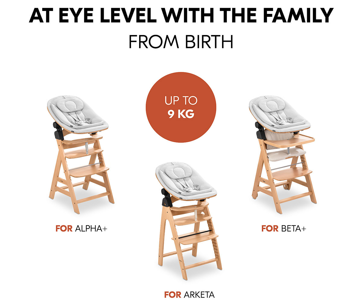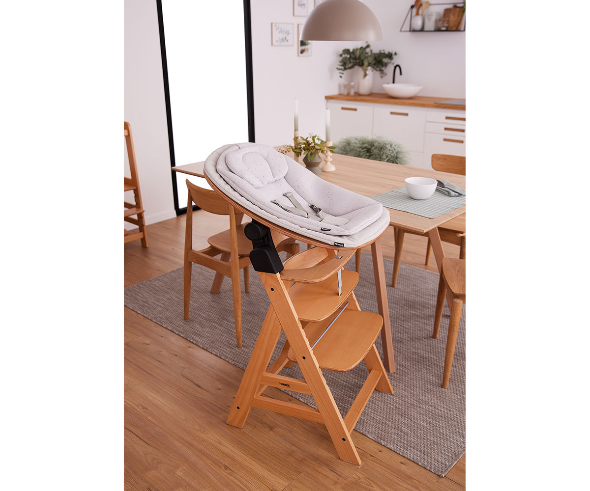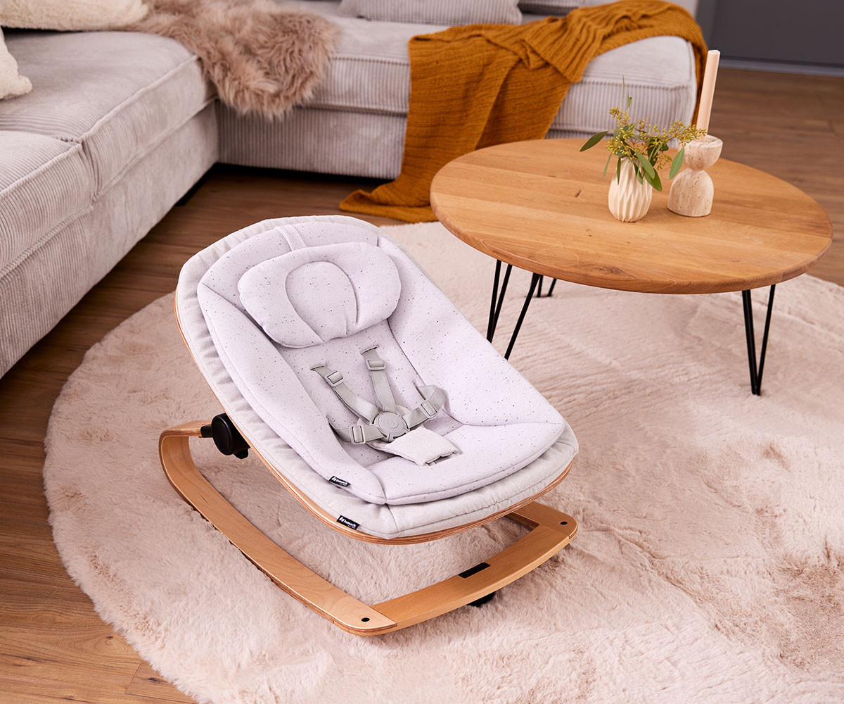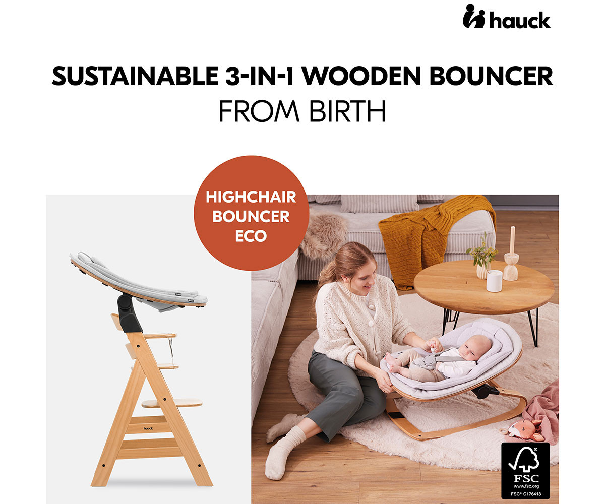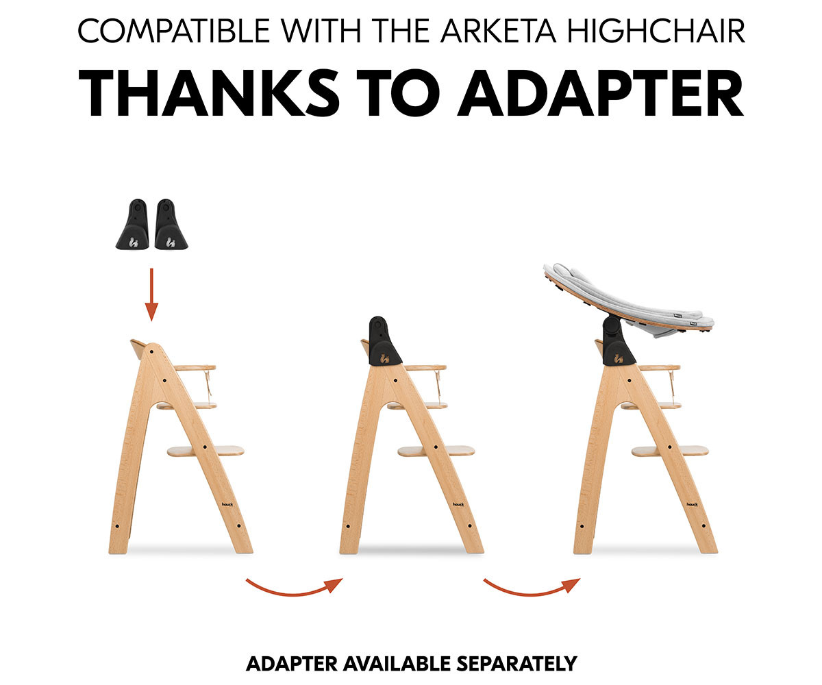 Винаги искате вашето бебе да е близо до вас? Благодарение на предоставения адаптер, можете да прикрепите дървения шезлонг към столче за хранене hauck Alpha+ (можете да го закупите тук) или Beta+ като модул за новородено. С отделно наличния адаптер можете да използвате Highchair Bouncer Eco и за Arketa.