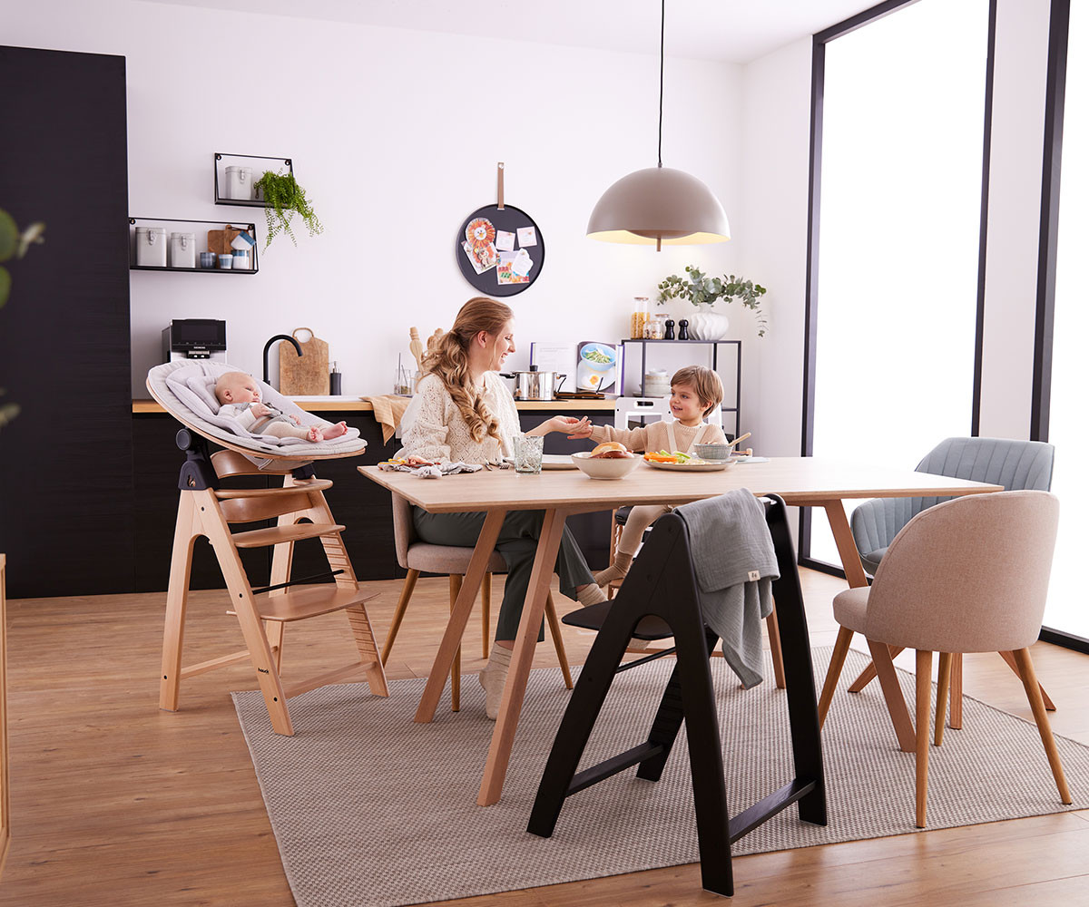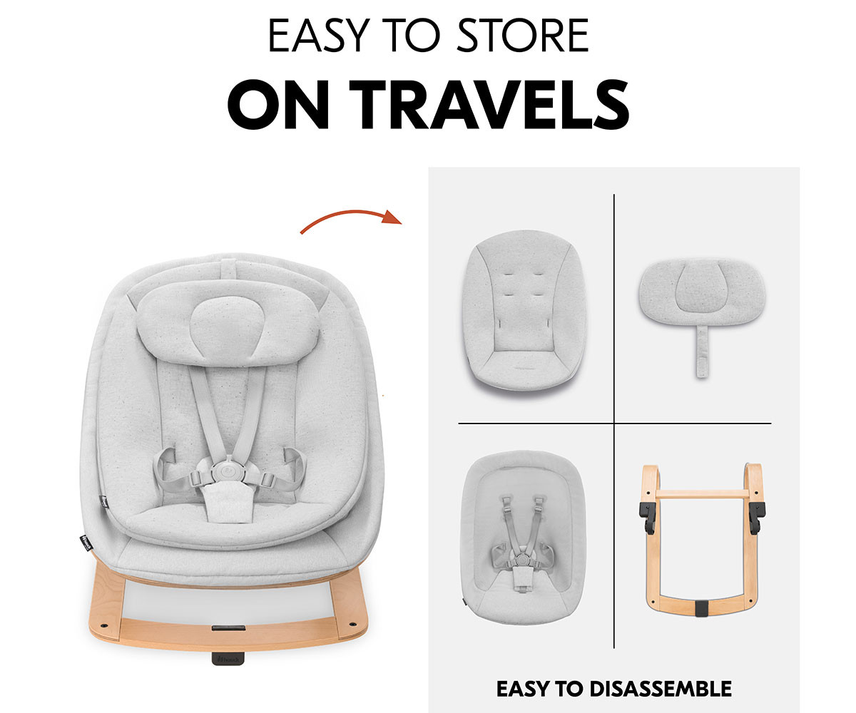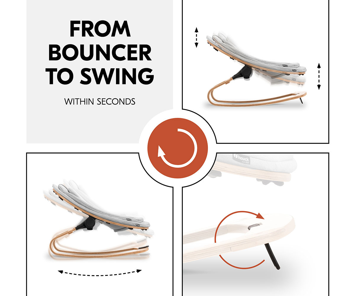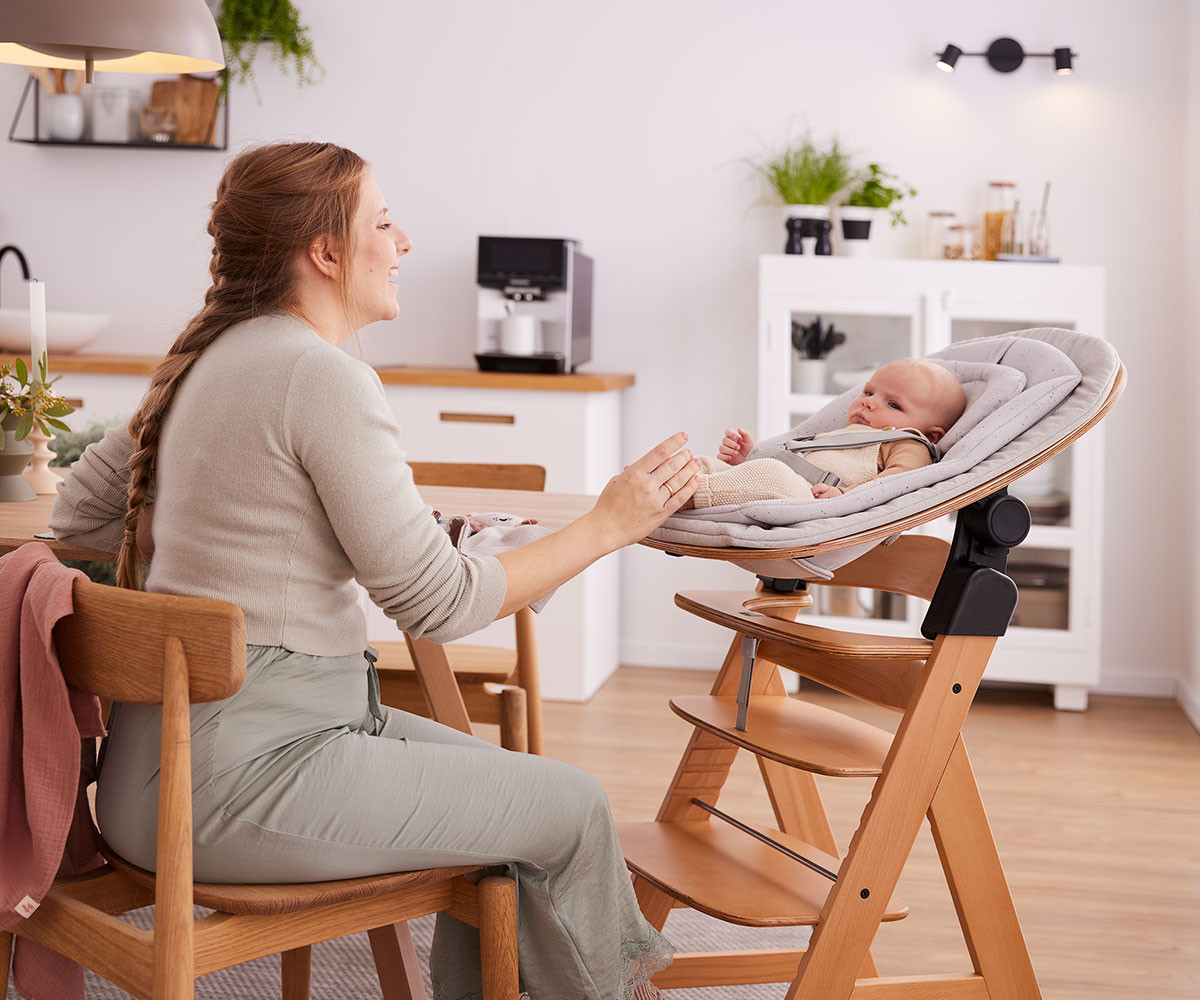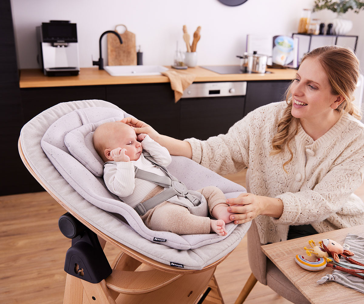 Винаги искате вашето бебе да е близо до вас? Благодарение на предоставения адаптер, можете да прикрепите дървения шезлонг към столче за хранене hauck Alpha+ (можете да го закупите тук) или Beta+ като модул за новородено. С отделно наличния адаптер можете да използвате Highchair Bouncer Eco и за Arketa.