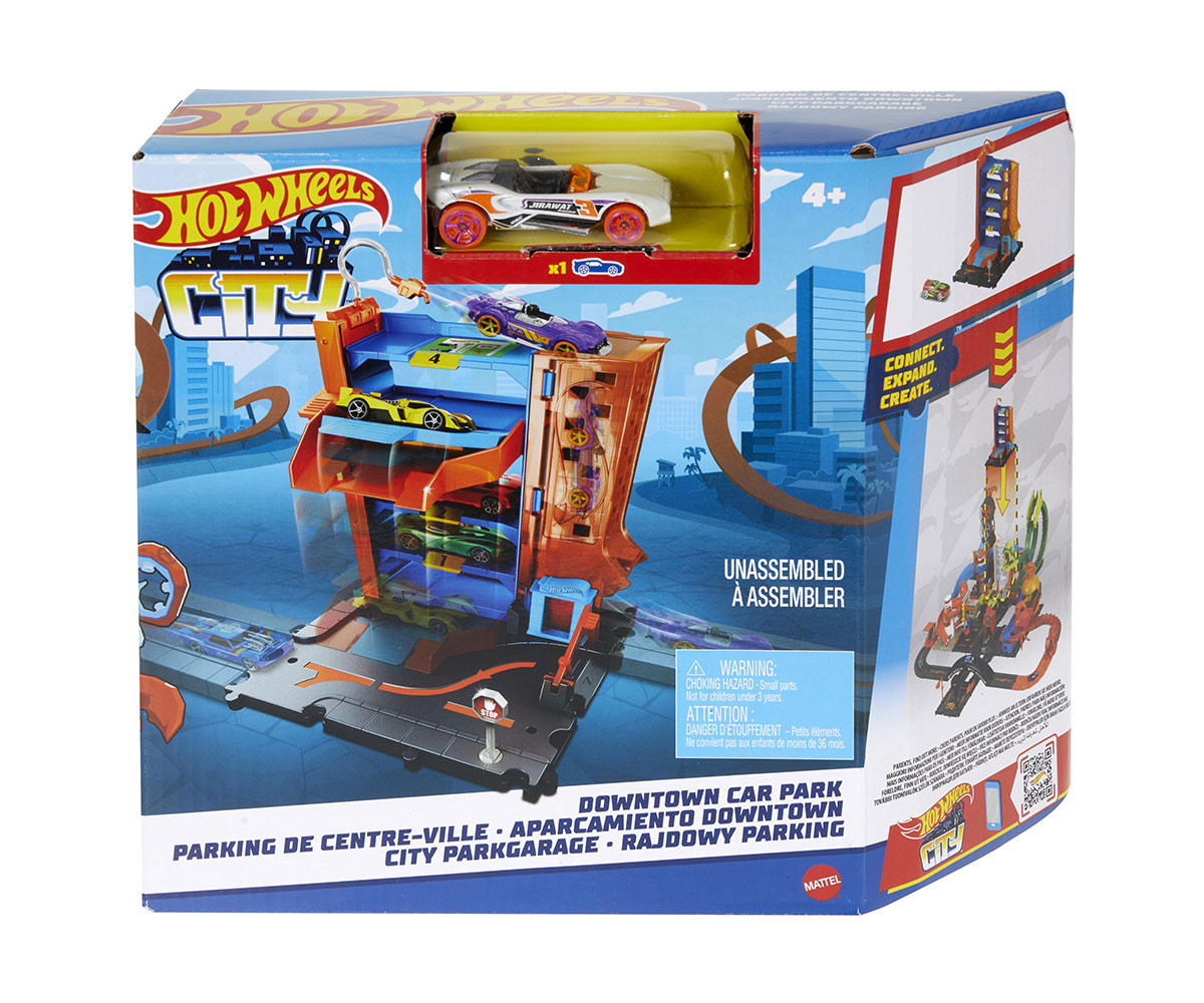 Комплектът Hot Wheels™ City Downtown позволява на децата да създават свои собствени градски пейзажи, изпълнени с каскади и готини приключения. Всеки игрален комплект на тема чудовища Hot Wheels™ City създава усещането, че някое чудовище се прокрадва наблизо, чакайки удобния момент за нападение. Всички те се свързват с други комплекти на Hot Wheels® чрез множество точки на свързване и всеки се предлага с едно превозно средство Hot Wheels® за игри направо от кутията. С известни места, като например сервиз, драйв тру за бургери, автомивка и гараж, децата ще искат да съберат всички за безкрайни възможности за разказване на истории. Всеки продукт се продава отделно според наличностите. Цветовете и декорациите може да се различават.