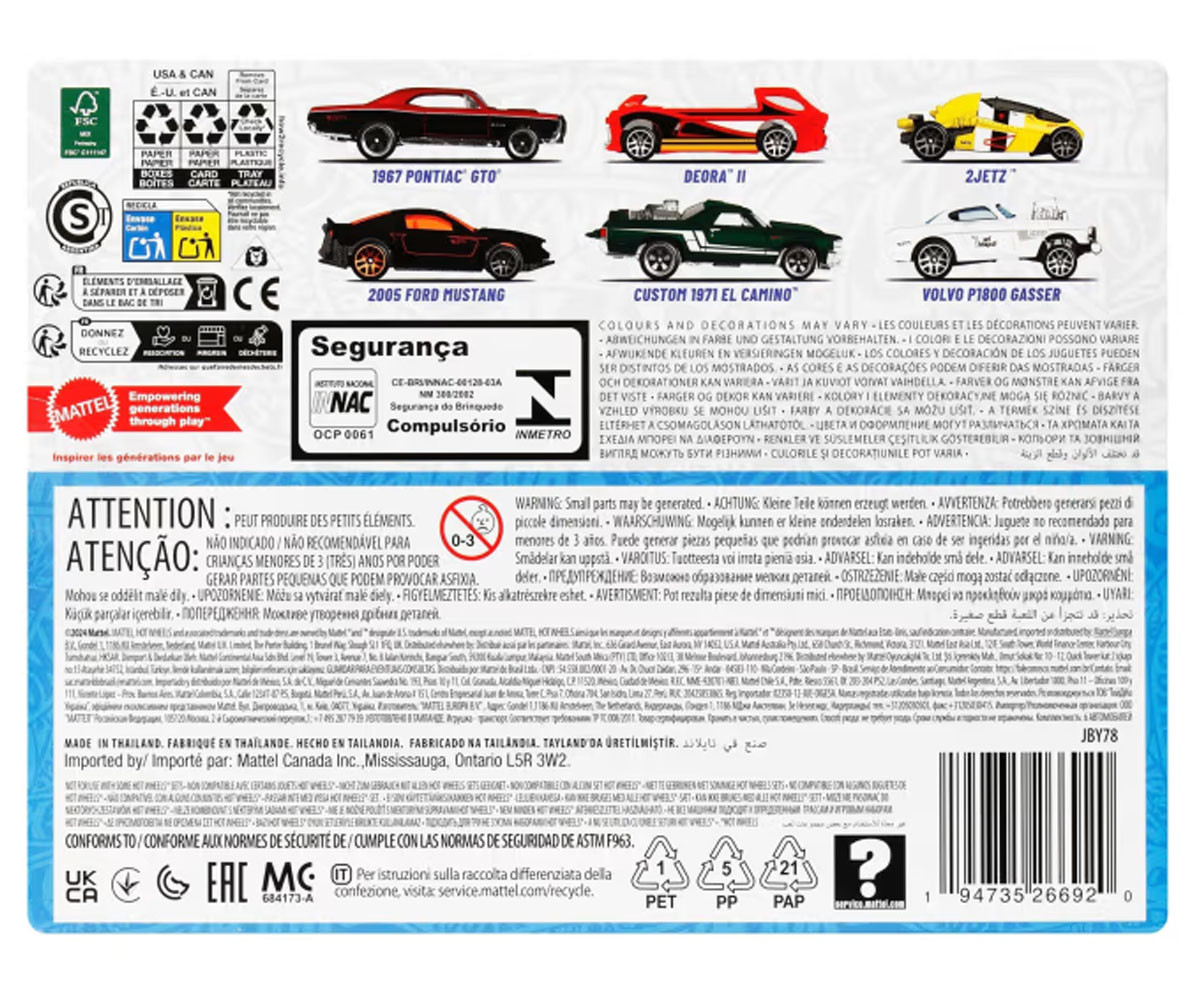 Комплектът Hot Wheels HW Legends Multipack ще вдигне всяка колекция до нови скорости с шест коли и камиончета в мащаб 1:64! Всяко от тези ляти от метал превозни средства е истинска легенда Hot Wheels с още по-луксозен дизайн от стандартните базови модели. Комплектът съдържа: 1967 Potiac GT0, Deora II, 2Jetz 2005 Ford Mustang, Custom 1971 EL Camino и Volvo P1800 Gasser. Феновете не трябва да пропускат и другите тематични комплекти – Япония (можете да ги закупите тук) и Европа (можете да ги закупите тук) – за да завършат пълната колекция!