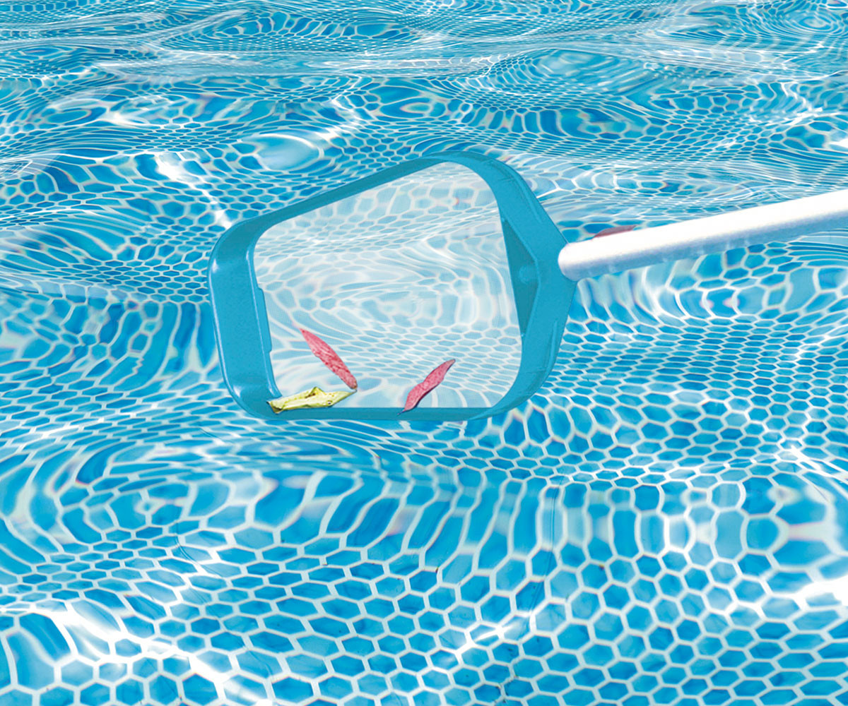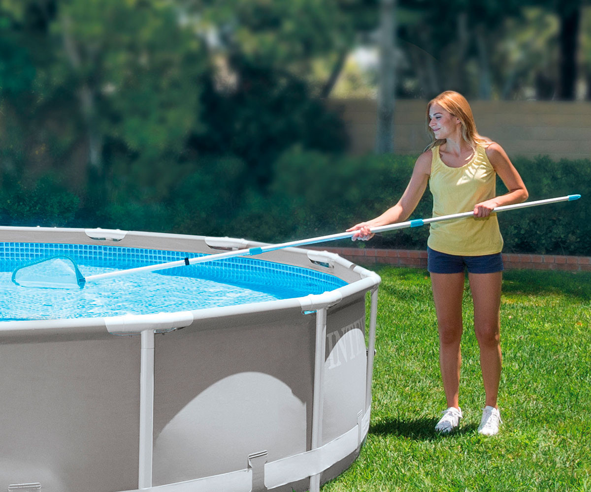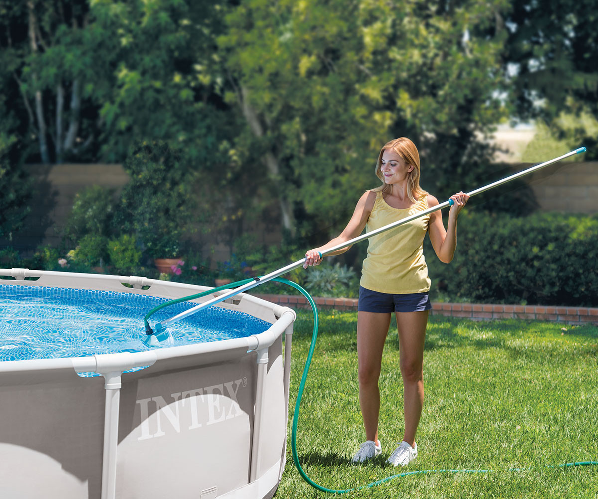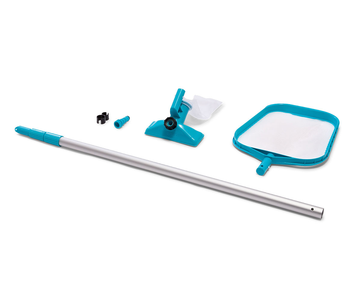 Този комплект за поддръжка на басейни е подходящ за басейни с диаметър до 488 см. Опаковката включва 239 см дълга здрава телескопична алуминиева дръжка със сменяема мрежа за почистване на водната повърхност и специална вакуумна глава. Вакуумната глава отстранява замърсяванията, които са се утаили по дъното и/или стените на басейна.