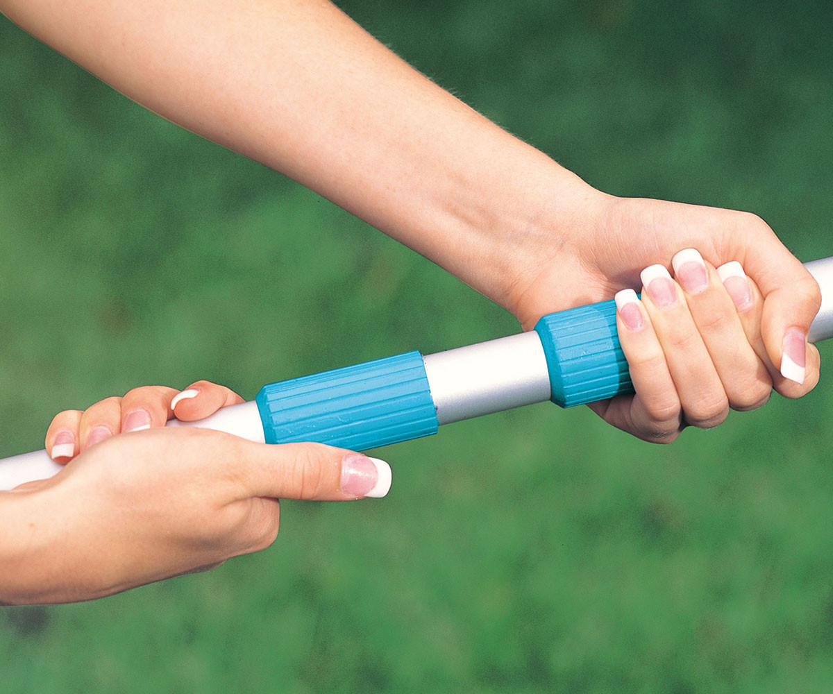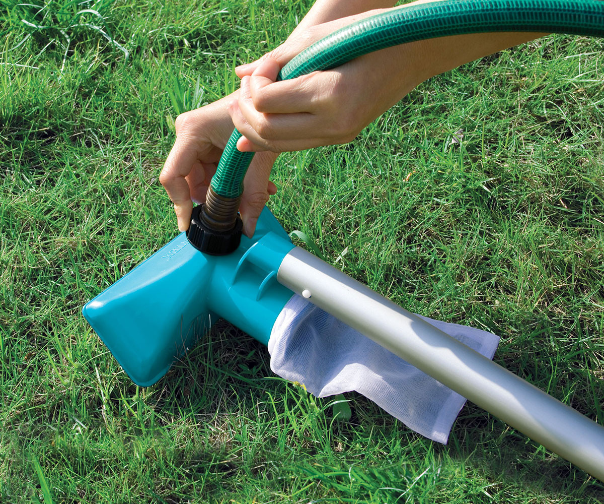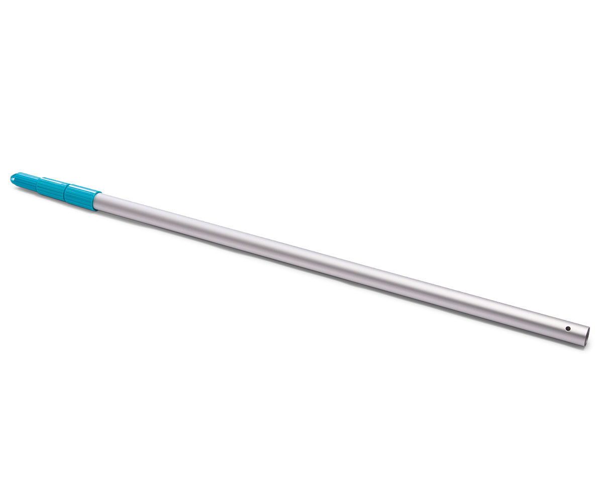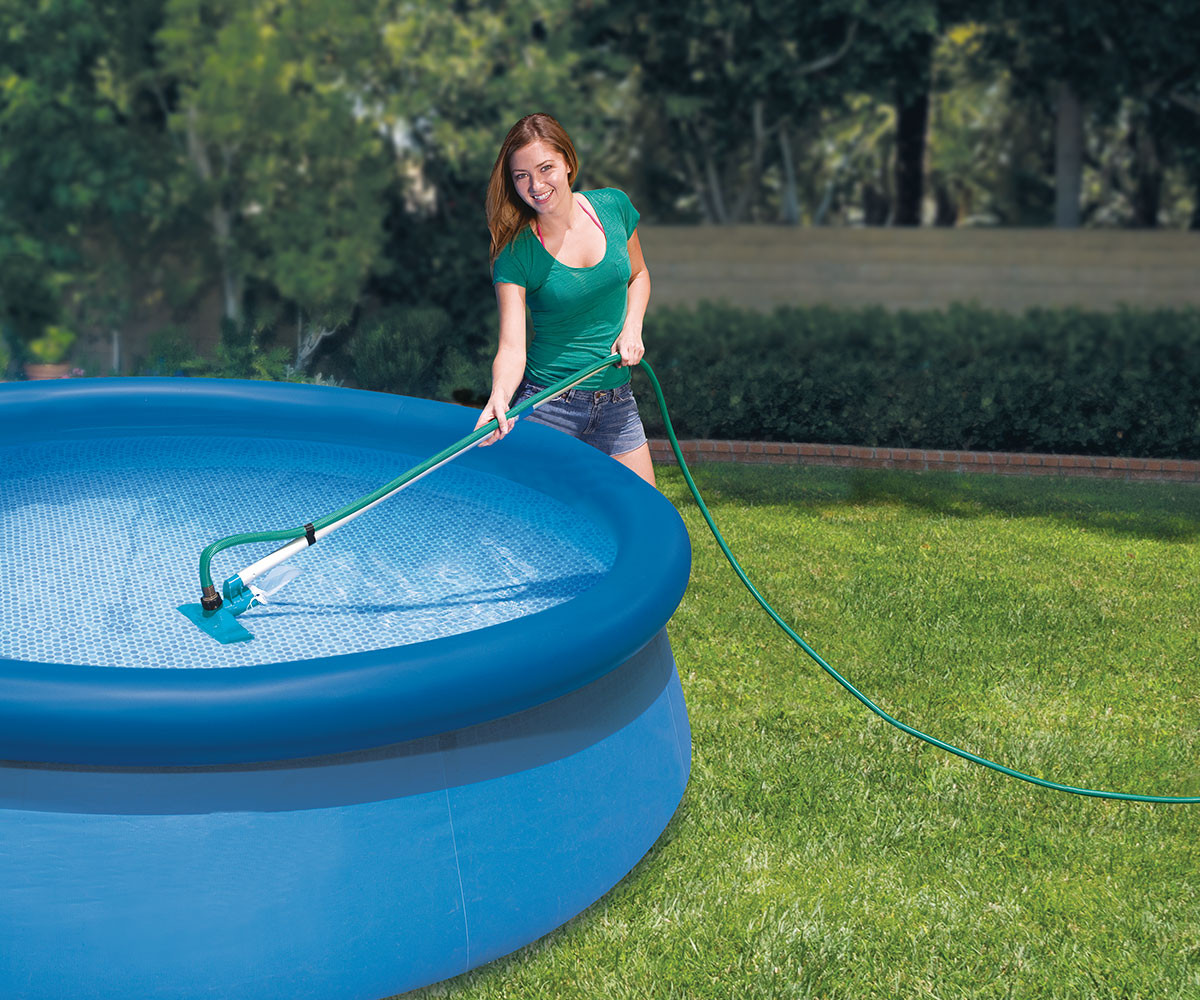 Този комплект за поддръжка на басейни е подходящ за басейни с диаметър до 488 см. Опаковката включва 239 см дълга здрава телескопична алуминиева дръжка със сменяема мрежа за почистване на водната повърхност и специална вакуумна глава. Вакуумната глава отстранява замърсяванията, които са се утаили по дъното и/или стените на басейна.