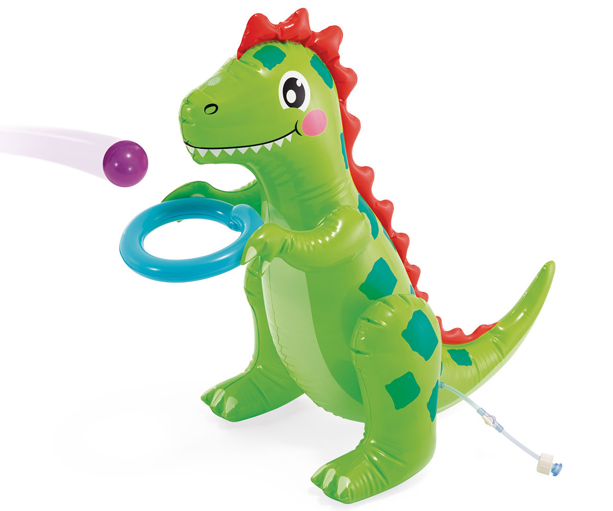 Надуваем воден център за деца над 2 години. Включва пързалка с допълнително омекотяване на зоната на приземяване и 6 топки, които децата могат да поставят в отворите в стената или да целят ринга, който динозавърът държи. Вградената пръскачка, при свързване към градински маркуч, ще осигури приятно освежаване. Дайте на децата си часове на праисторическо забавление с този вълнуващ надуваем център с вграден динозавър, който не само пръска вода, но и предлага игра с хвърляне на топки!