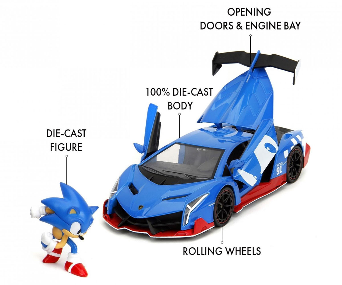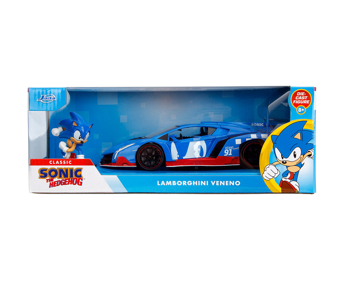 Сблъсък на скоростни титани – суперзвездата Sonic и екстремният Lamborghini Veneno се обединяват в стилен колекционерски комплект. Автомобилът е боядисан в емблематичното синьо на Sonic и украсен с автентични червени детайли и графика, включително номер "91" – годината, в която Sonic се появява за първи път. Моделът на Lamborghini Veneno е изработен с внимание към всеки детайл – метален корпус, свободно въртящи се колела и отварящи се елементи. Съчетанието с фигурката на Sonic прави комплекта мечтан подарък за всеки фен на видеоигрите, филмите и автомобилите. Този лицензираният комплект е чудесно попълнение към всяка колекция от Sonic или суперспортни коли. Подходящ за деца над 8 години и всички, които обичат героите от поп културата.