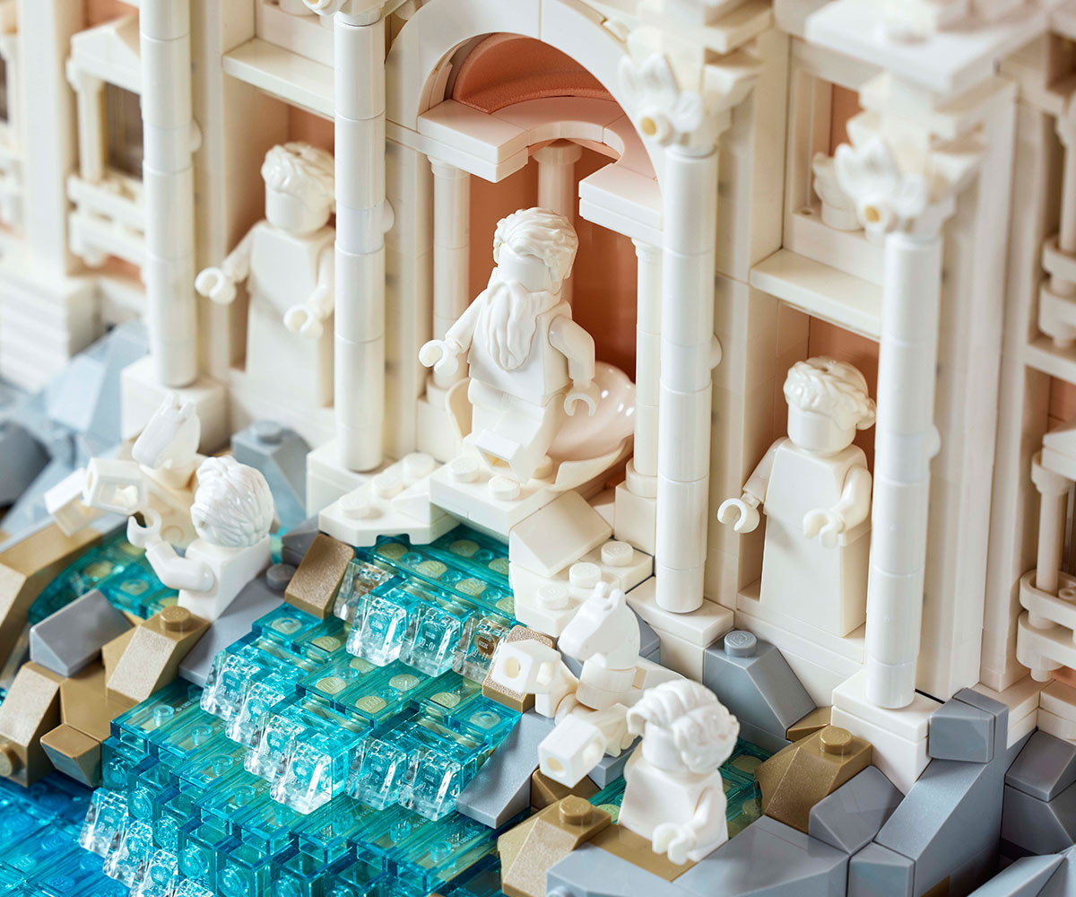 Пресъздайте емблематичната барокова конструкция на Фонтан ди Треви в Рим, Италия, с нейните каменни скулптури от травертин, в детайлен модел от LEGO® Architecture.