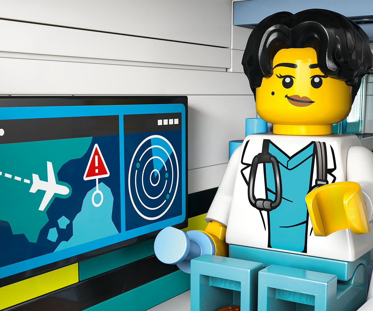Присъединете се към екипажа на борда на въздушната линейка за спешни случаи и се отправете към планината, където скиор се нуждае от спешна помощ. Кацнете, свалете носилката и медицинското оборудване, скочете на снегомобила и бързайте до местопроизшествието. Прегледайте пациента в медицинската лаборатория на самолета, преди да отлетите с него. В LEGO® City ви очакват въздушни спасителни приключения!