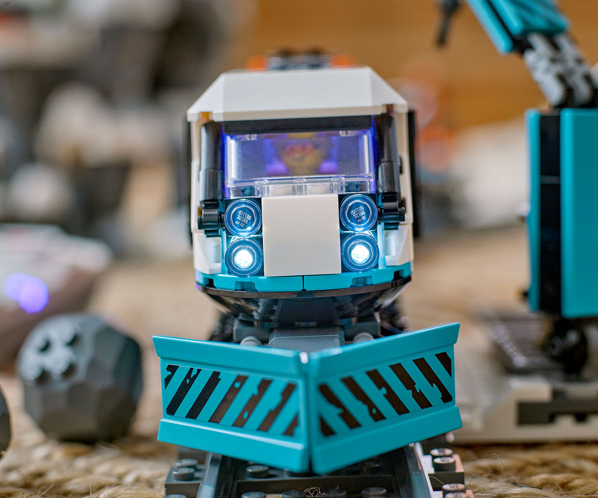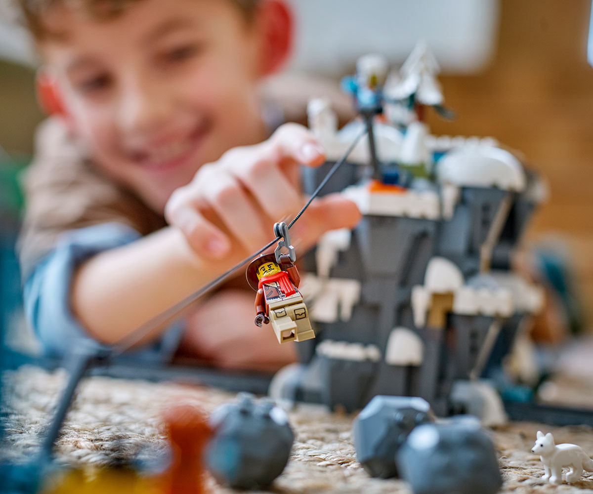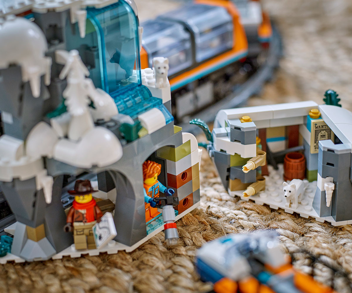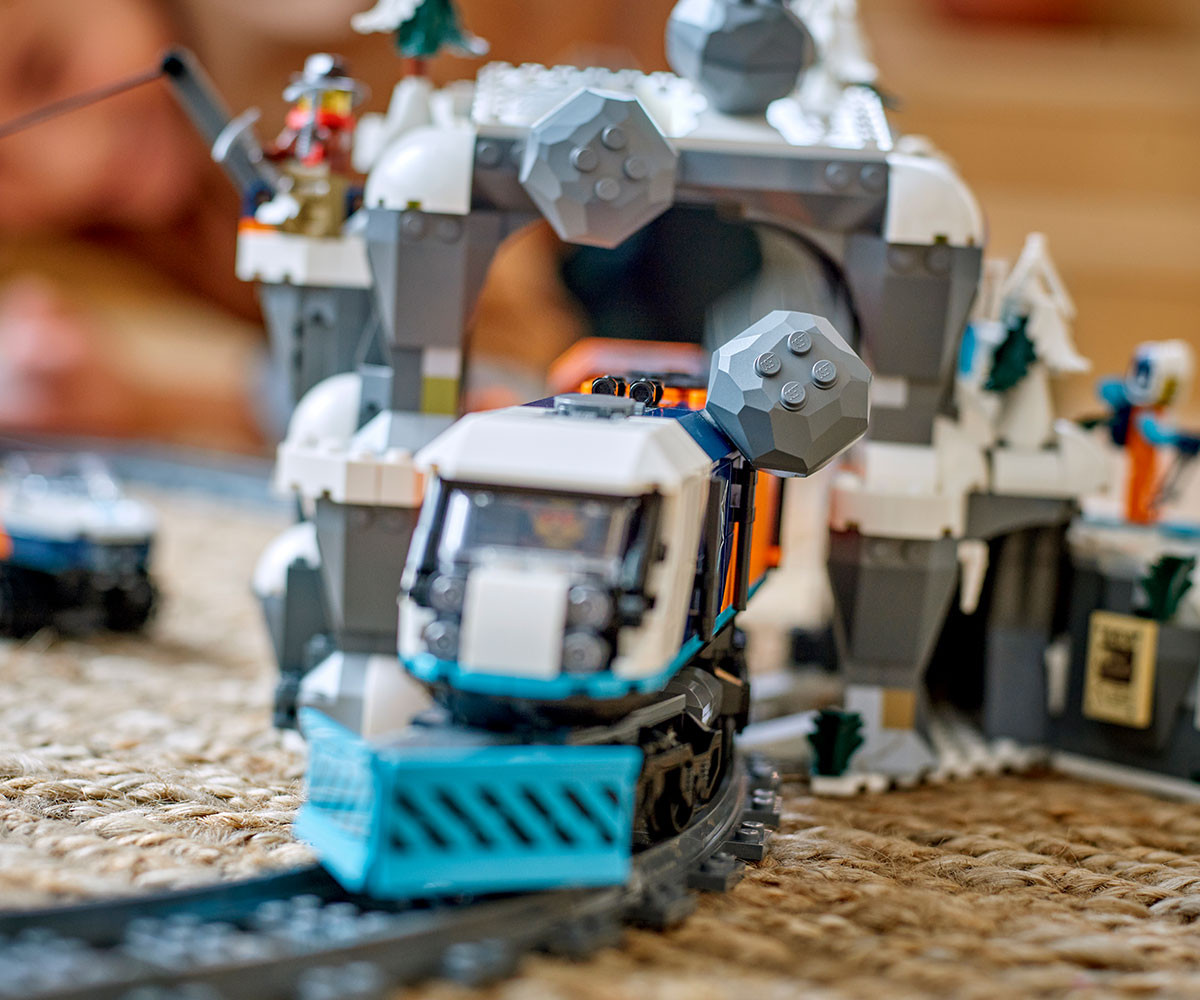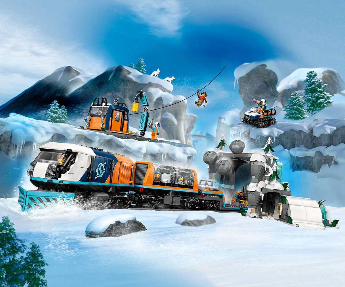 - Елементи и функции – децата могат да прекарат влака през планинския тунел, да активират функцията за падащи камъни и да изпратят минифигури по въжената линия, която свързва планината с арктическата станция;