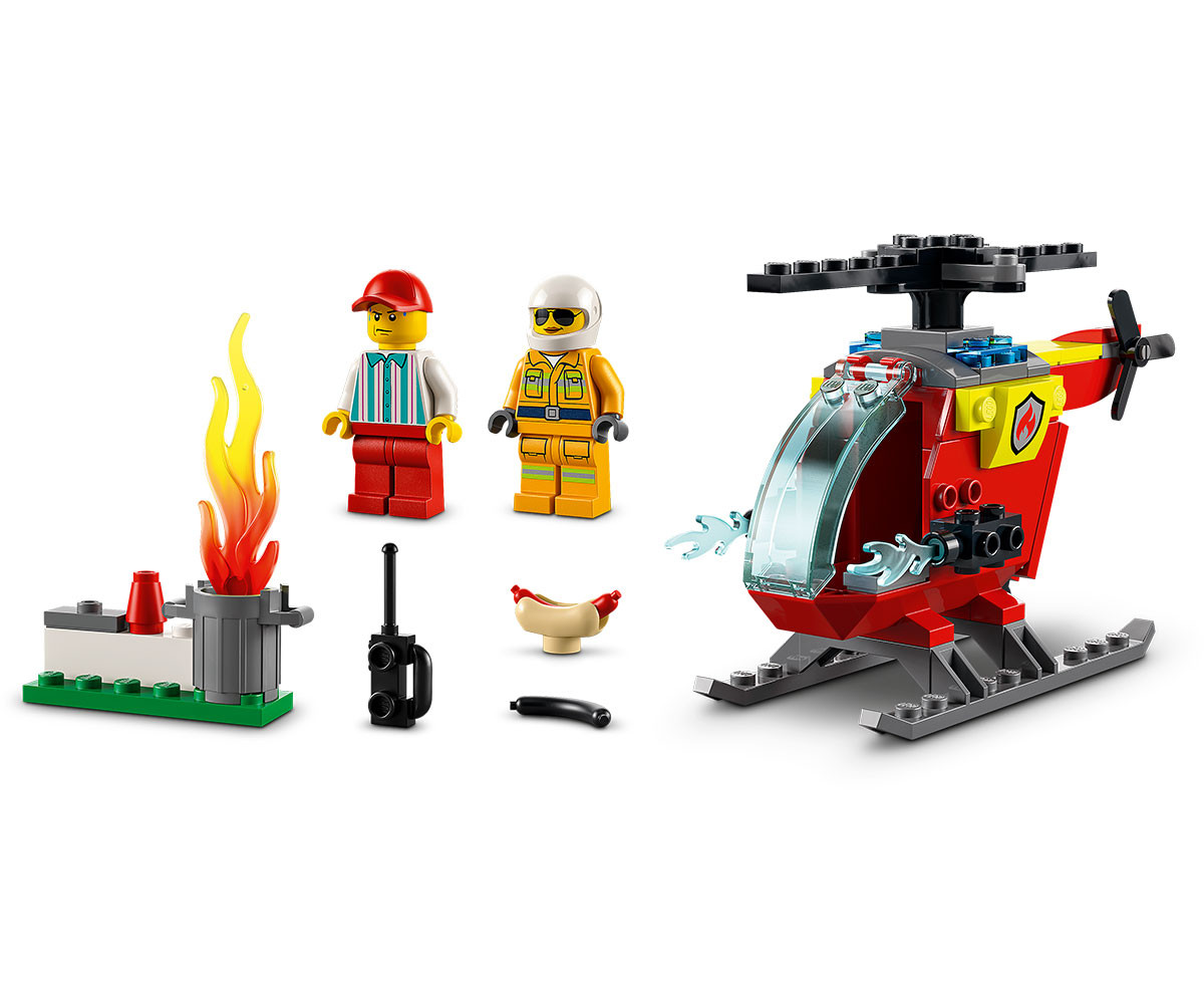 - Какво има в кутията? – Всичко необходимо за построяването на пожарникарски хеликоптер плюс минифигури на пожарникар и продавач, кофа за боклук с пламъци LEGO® и забавни аксесоари, включително изгорен хот-дог;