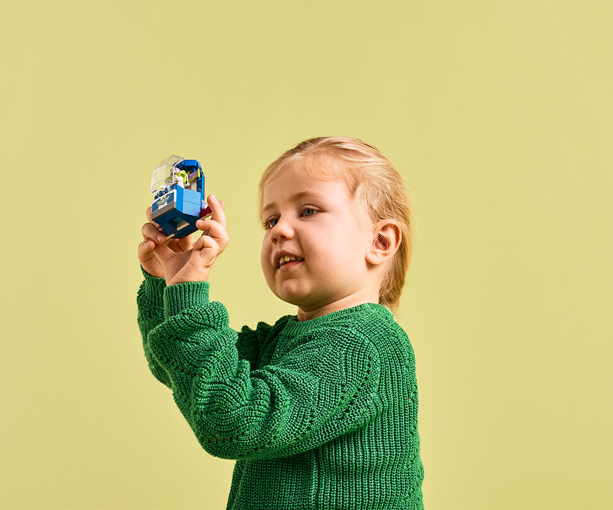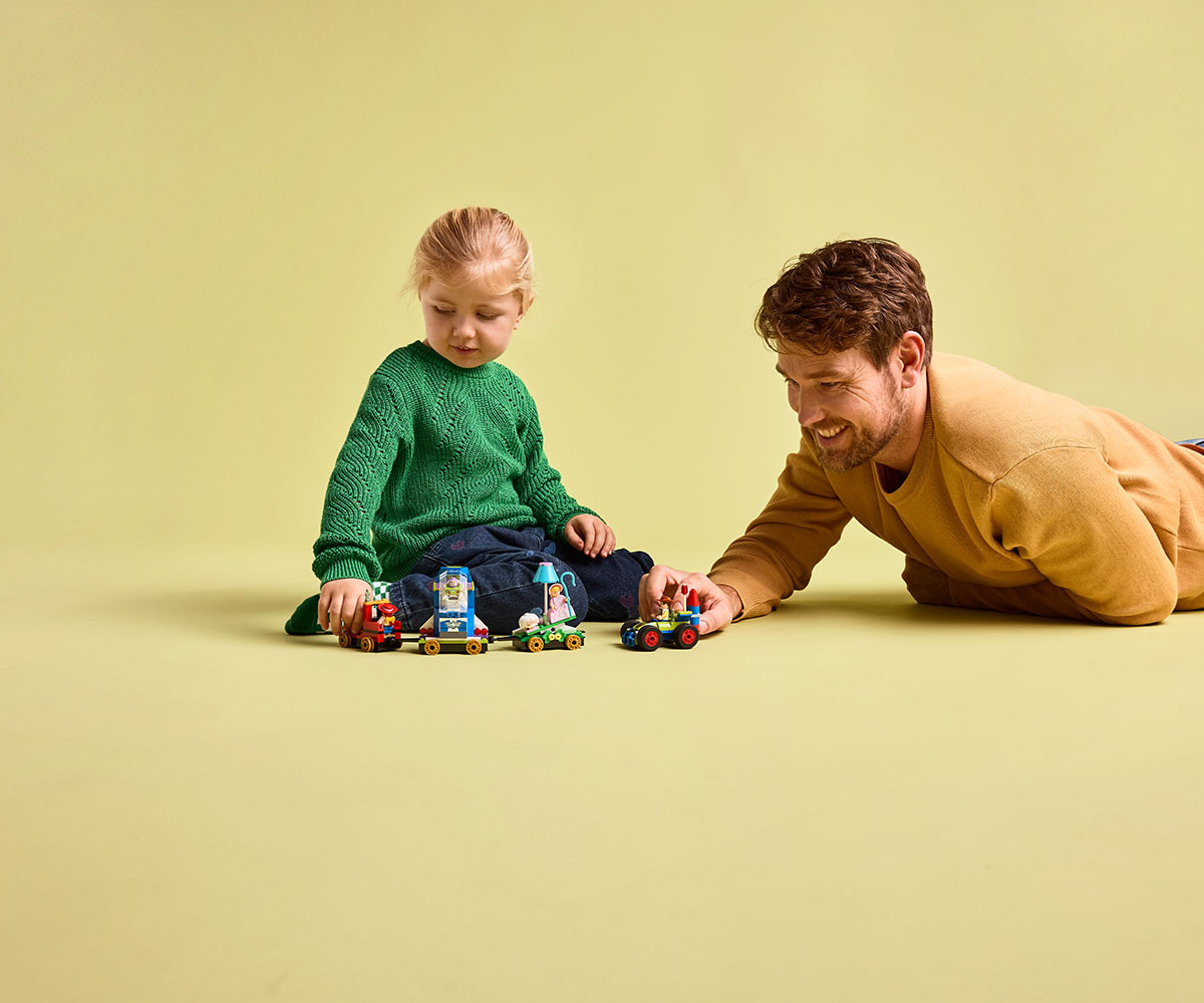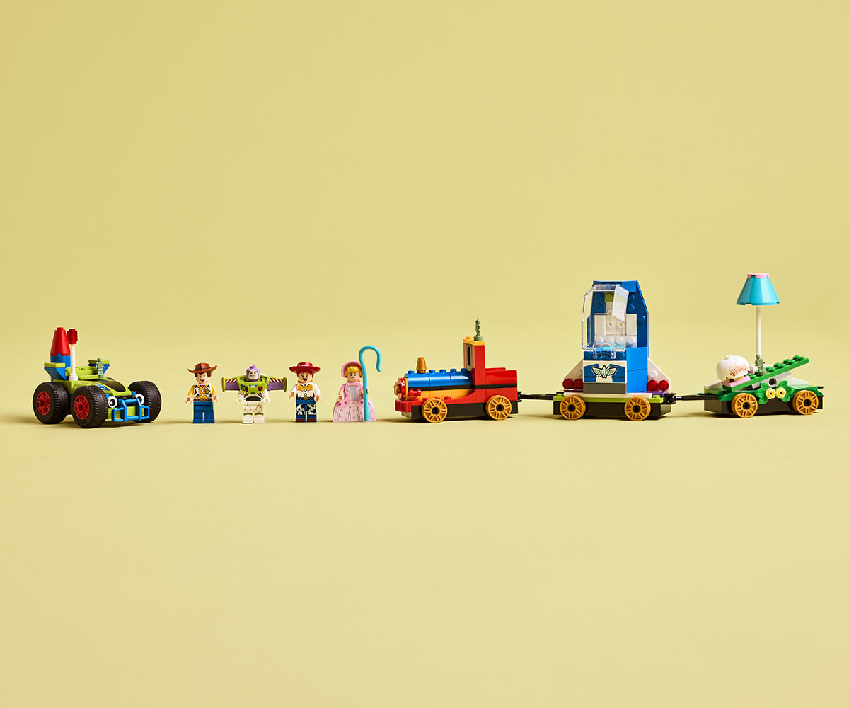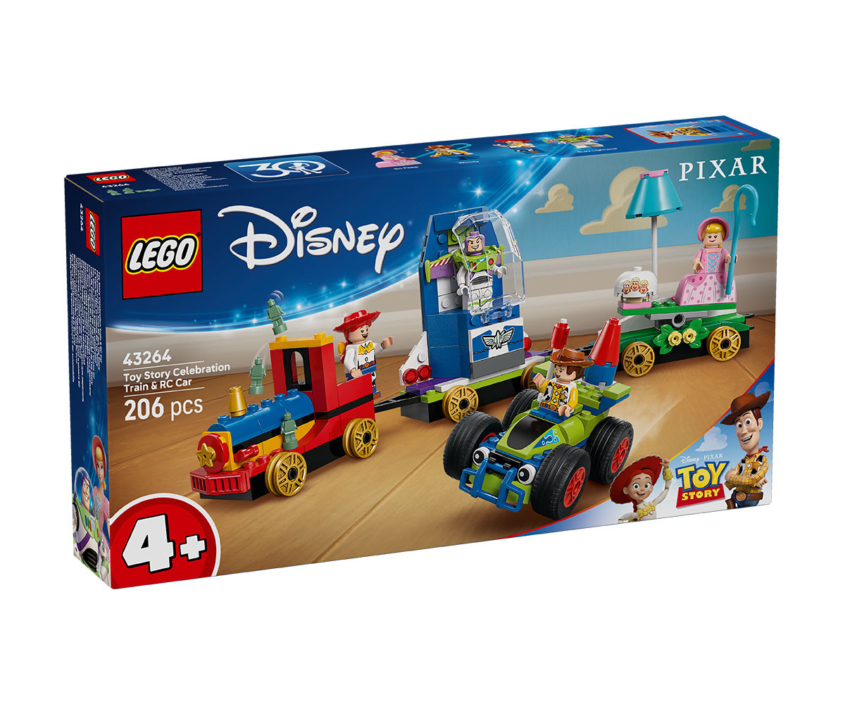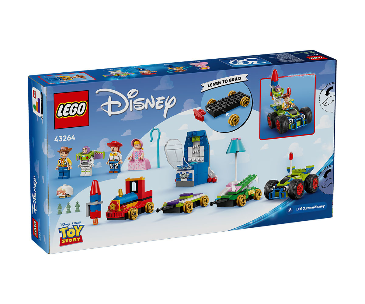 Децата на възраст над 4 години, които обичат превозни средства и влакове, ще намерят всичко това и не само в строителния комплект „Играта на играчките“: Празничен влак и колата RC (43264) от LEGO® ǀ Disney. Децата се учат да строят, докато празнуват 30-тата годишнина от хита на Disney и Pixar „Играта на играчките“ с вдъхновен от Дивия запад локомотив, 2 платформи и кола. На платформите има люлка и космически кораб. В комплекта за построяване са включени 4-ма герои на LEGO ǀ Disney и Pixar: Уди, Джеси, Бо-Пийп и Баз Светлинна година. Този строителен комплект за игра е идея за подарък, който повишава увереността на децата и позволява на възрастните да споделят радостта. Три начални тухлички осигуряват на децата стабилно начало на построяването, а във всяка торбичка с тухлички има по един герой, така че играта започва бързо! Освен това се комбинира с други строителни комплекти LEGO ǀ Disney (продават се отделно). Към простите инструкции с картинки за деца, които тепърва се учат да четат, има лесно, интуитивно строително приключение в приложението LEGO Builder, където децата могат да мащабират, да завъртат модели в 3D и др. Комплектът съдържа 206 части.