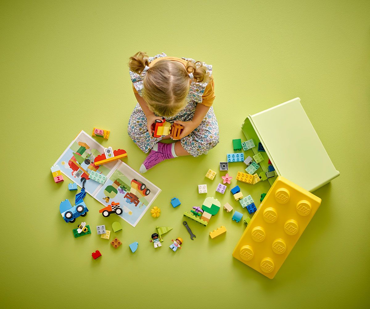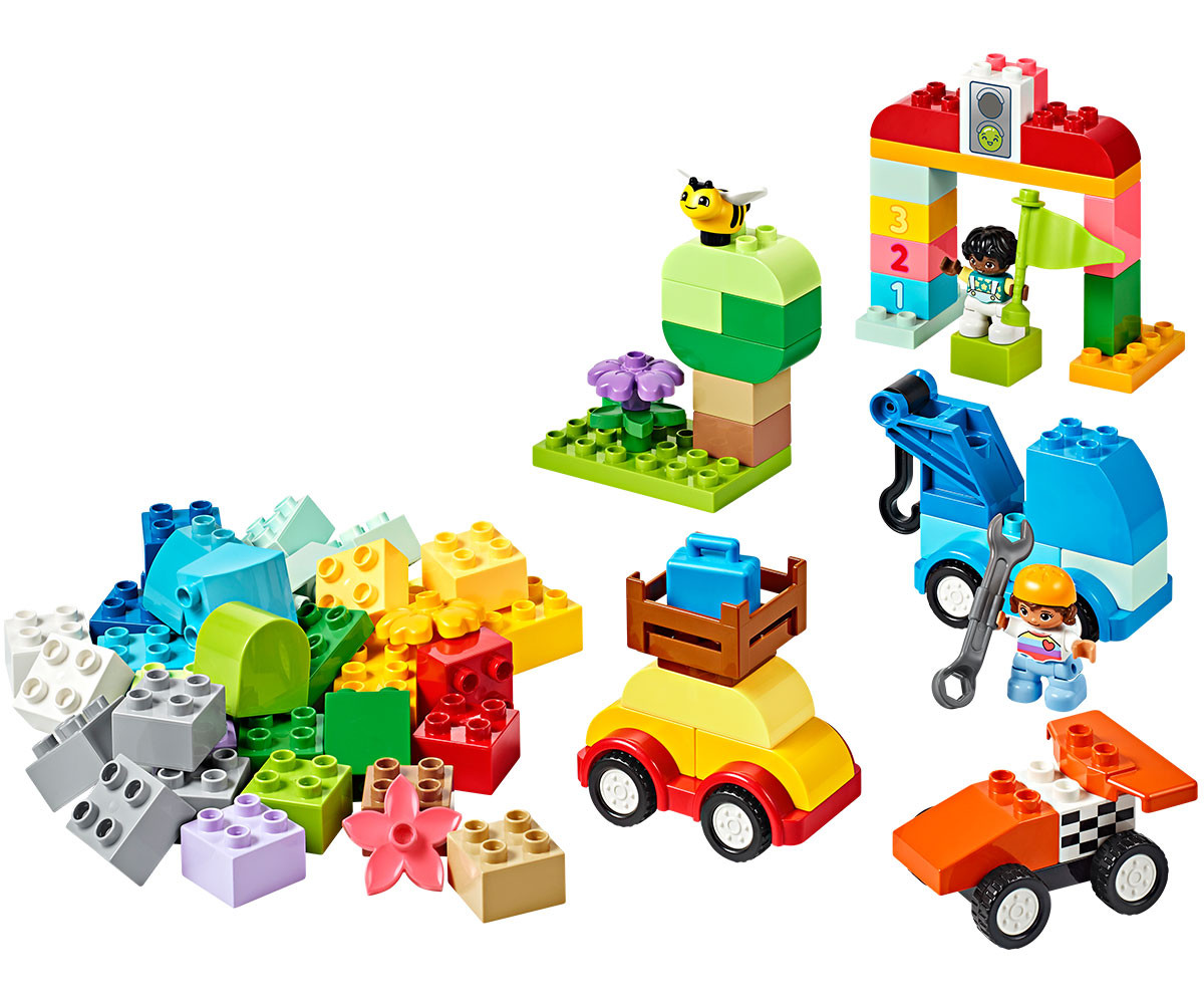 Повдигнете капака към свят от творчески възможности за малките любители на автомобили с тази забавна кутия с различни строителни тухлички LEGO® DUPLO®. Включени са три основи и разнообразни тухлички. Родителите и децата в предучилищна възраст могат да следват инструкциите, за да построят състезателна кола, камион и семейна кола, или да създадат чудесата на колела, родени от детското въображение!