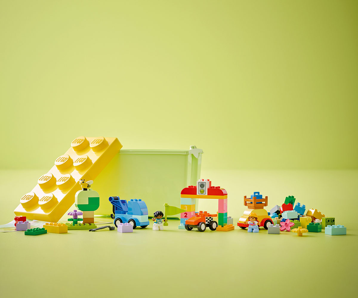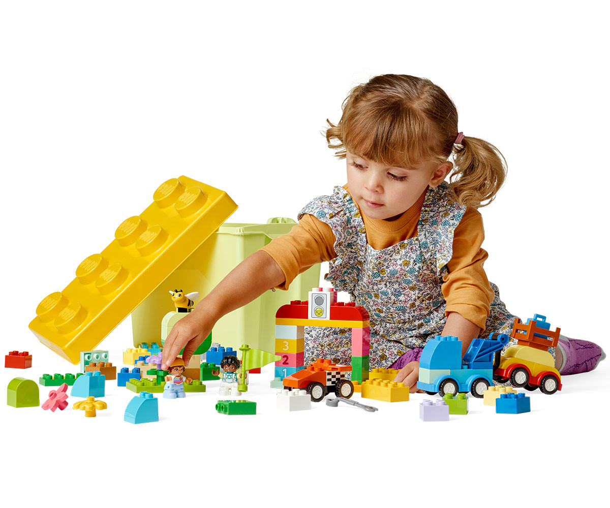 Образователната играчка LEGO® DUPLO® Кутия с коли и камиони за деца в предучилищна възраст е чудесна идея за подарък за малки любители на автомобили.