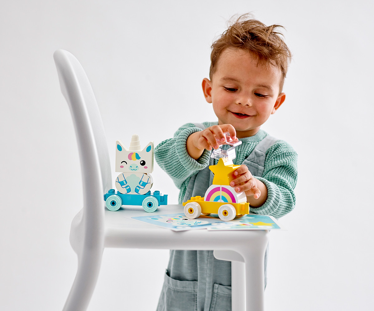 Този симпатичен еднорог за теглене забавлява малките деца с игри на въображението, като им помага да развиват основни умения за конструиране и да научат за формите и цветовете. Имате безкрайни възможности за обучение чрез игра с идеално гладките форми, които малките ръчички могат лесно да вземат, сглобяват и разглобяват от вагончетата на колелца. А за още повече забавления децата могат да свържат влакчето с други играчки LEGO® DUPLO® на колелца.
