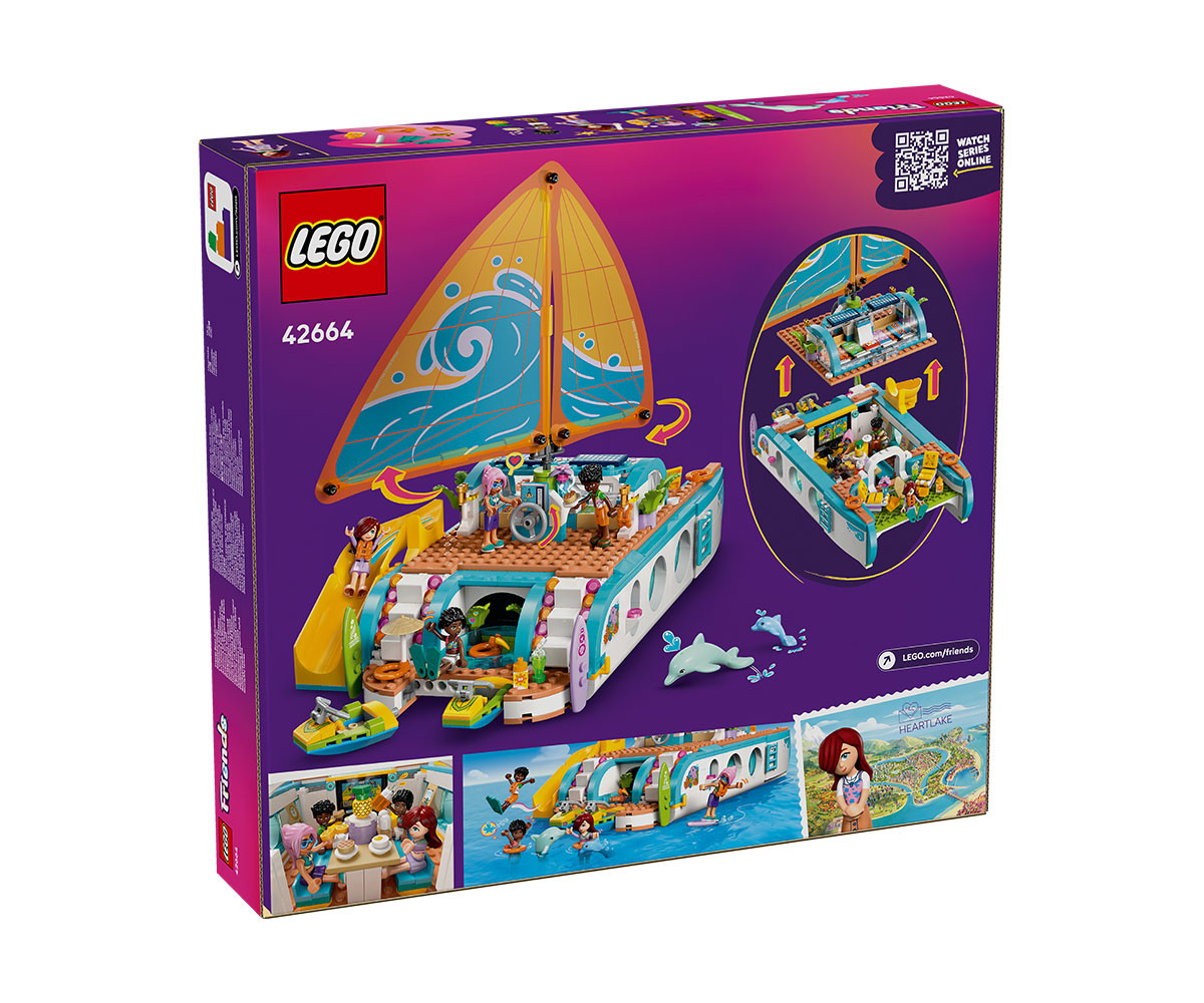 Комплект за забавно построяване, с който ще зарадвате малките моряци! LEGO® Friends Приключение с лодка (42664) за момичета и момчета на възраст над 8 години се предлага с 4 миникукли LEGO Friends и купища аксесоари за въображаема игра. Детайлнаталодка е пълна с реалистични елементи като платното, което се движи, когато децата завъртят щурвала! Децата разказват истории с Пейсли, Зак, Селин и Скай, които тръгват на приключение с лодка. Лодката има зони за готвене, хранене, почивка и спане – идеа лни за създаване на нови истории всеки път, когато децата играят. Открийте хидромасажна вана с надуваем дюшек, плюс зона за игри, зона за спане с 4 легла и душ и тоалетна. Повдигнете горната част на лодката за достъп до детайлния кухненски бокс и трапезарията. Има много елементи, които децата да изследват, докато разиграват готвене и вечеря с героите. Други аксесоари на ваканционна тематика включват бинокъл за наблюдение на делфина и неговото малко, два водни скутера, дъска за сърф, плавници, контролери за игри и други.