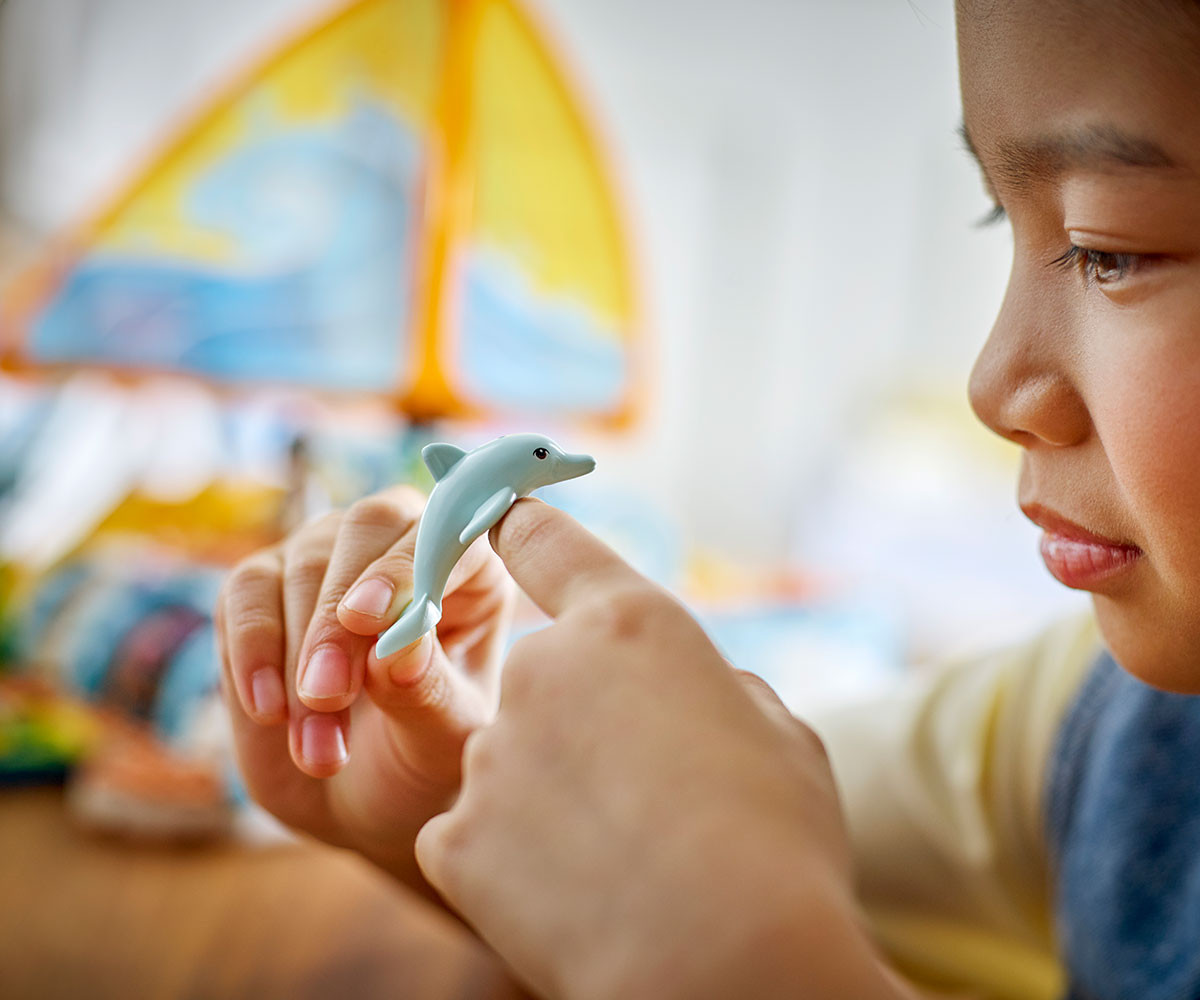 - Комплект за игра с лодка с много елементи – децата могат да построят лодката, след което да се забавляват, създавайки свои собствени истории за героите, докато приятелите играят и си почиват на лодката и наблюдават делфини;