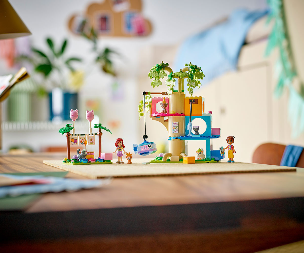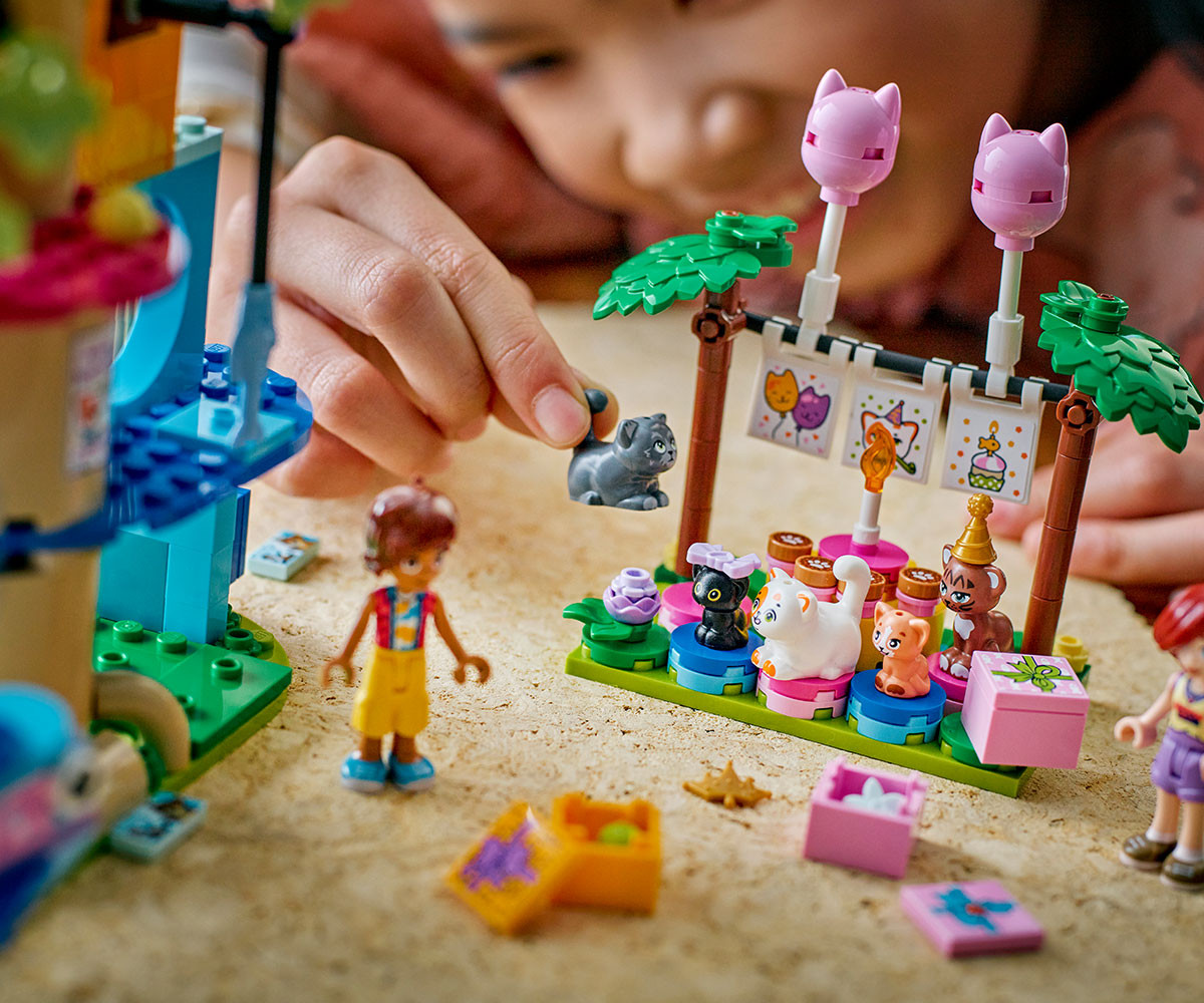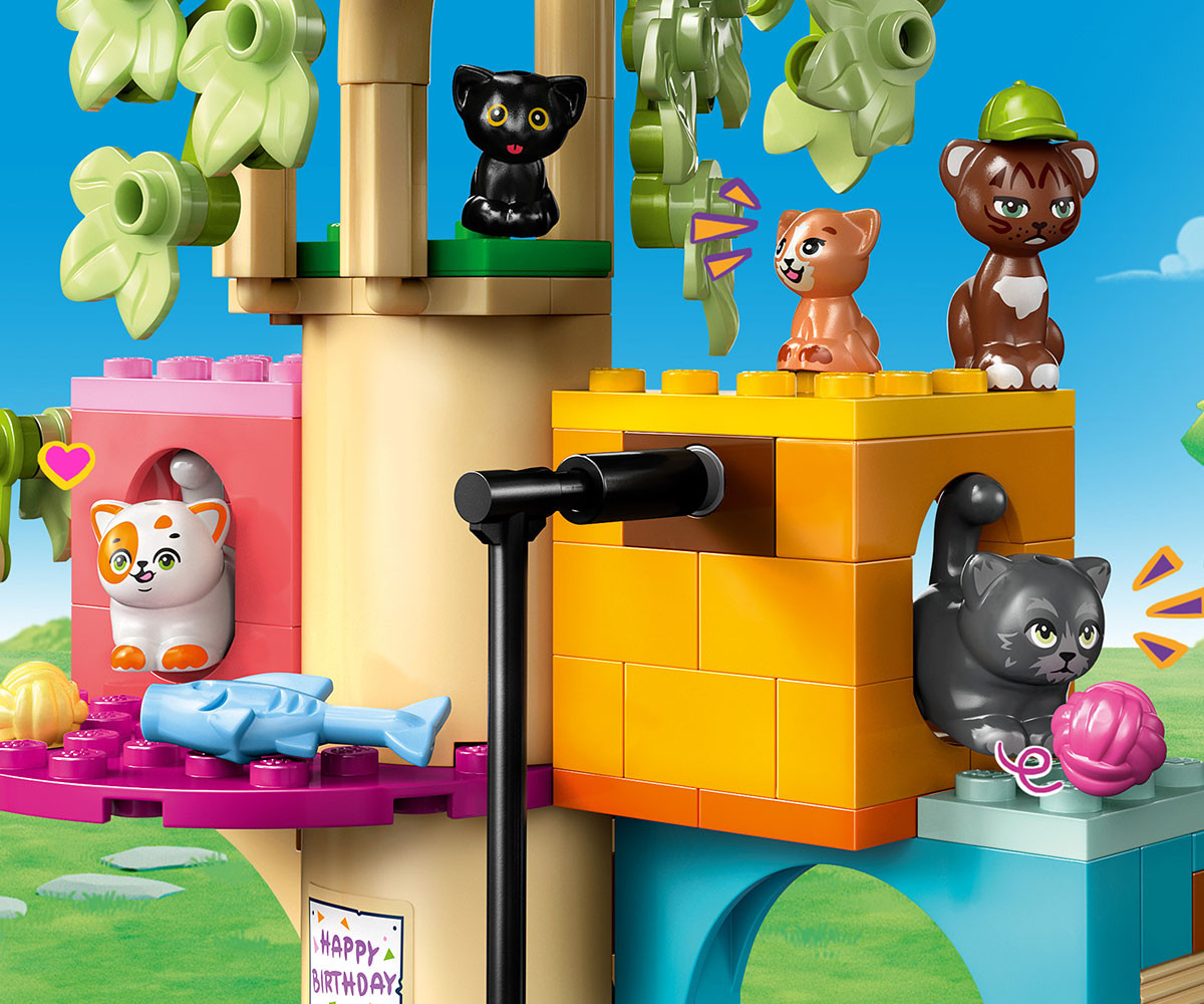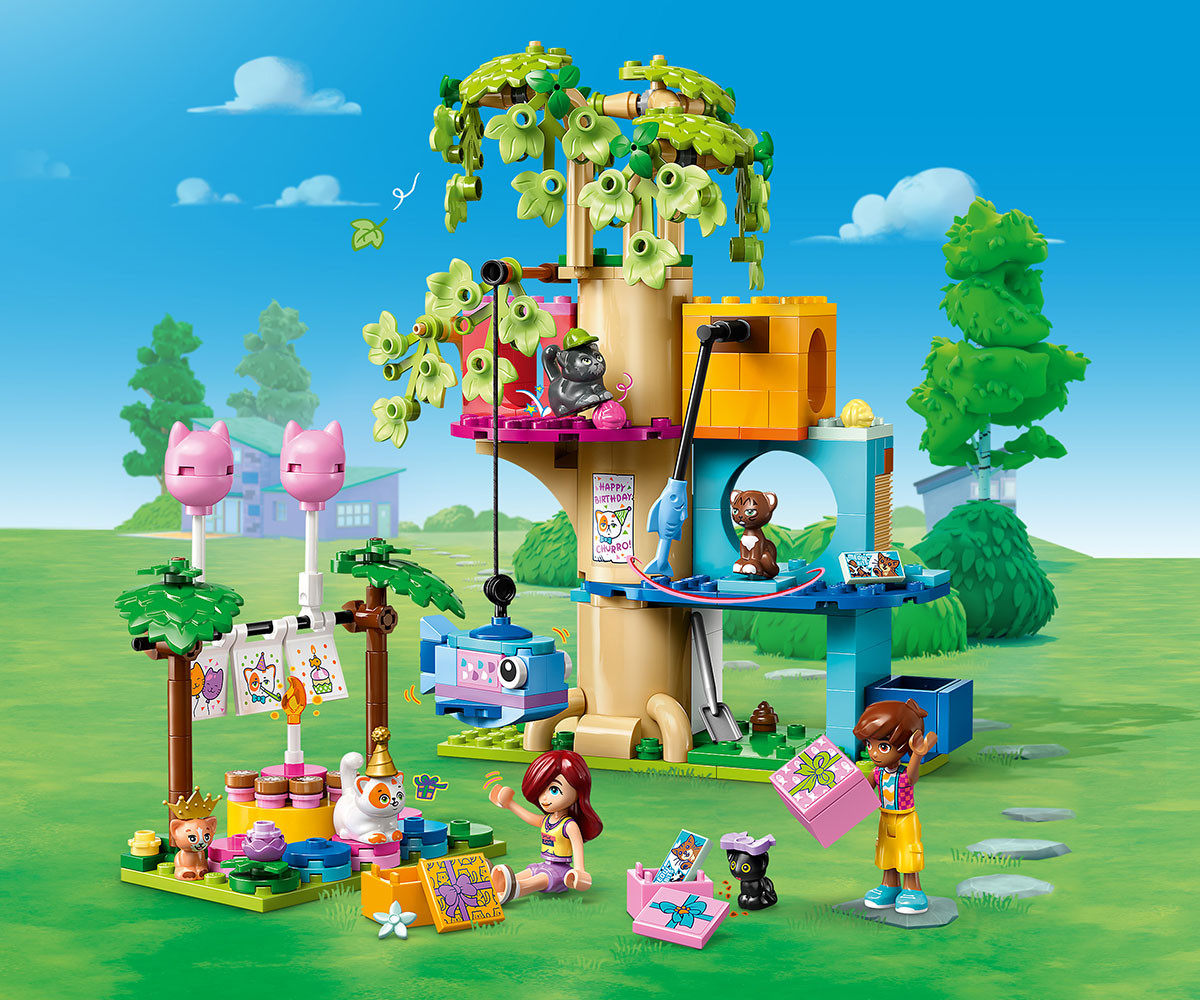 - Строителен комплект за деца, които обичат котки – тази играчка LEGO® Friends Котешко парти за рожден ден и дървесна къща за момичета и момчета на възраст над 6 години се предлага с две миникукли и пет фигури на котки за въображаема игра;