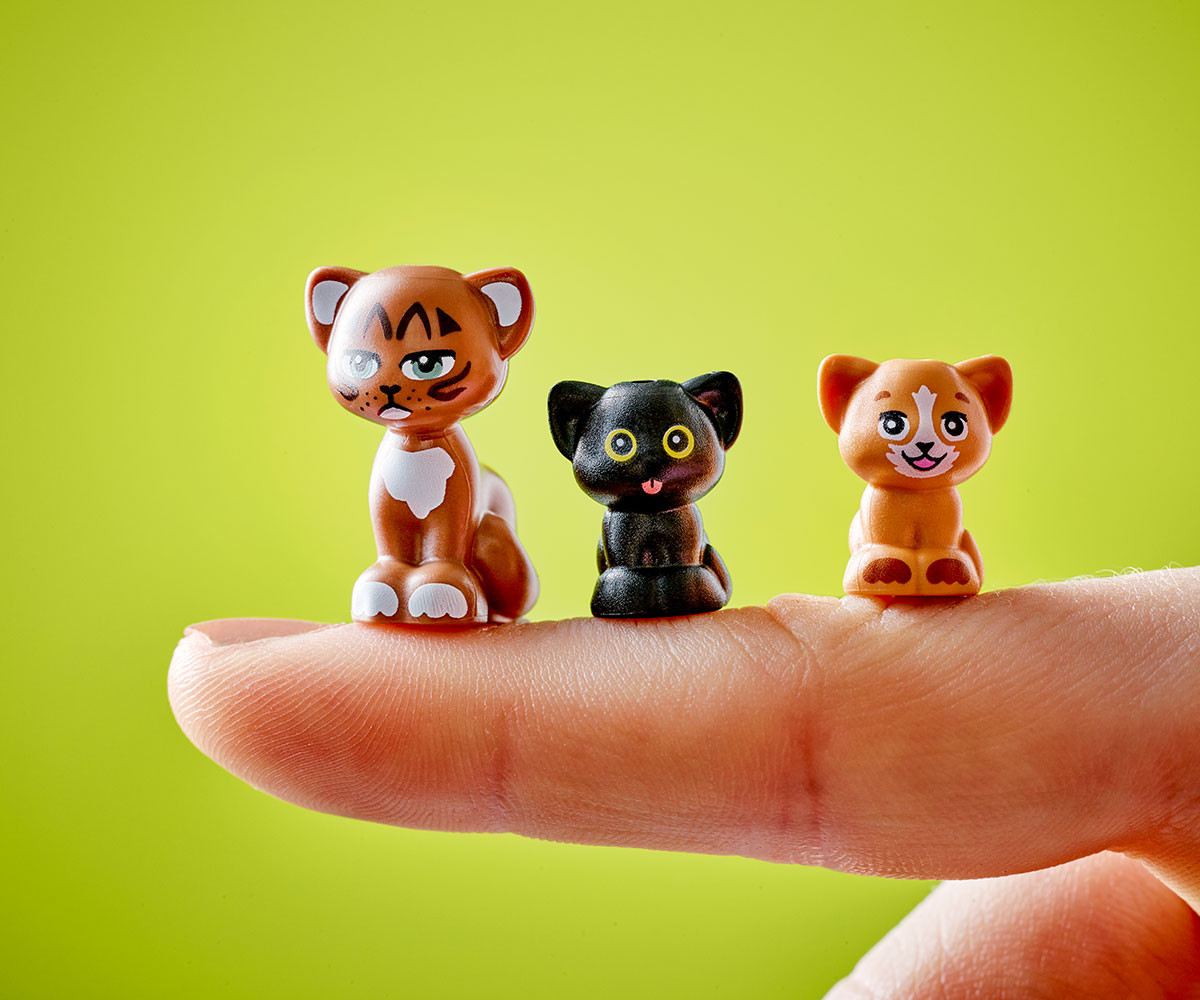 - Създавайте истории с героите на LEGO® Friends – този комплект за игра се предлага с миникукли на Лео и Пейсли, пет фигури на котки, котешка дървесна къща за построяване и сцена с торта за рожден ден за построяване;