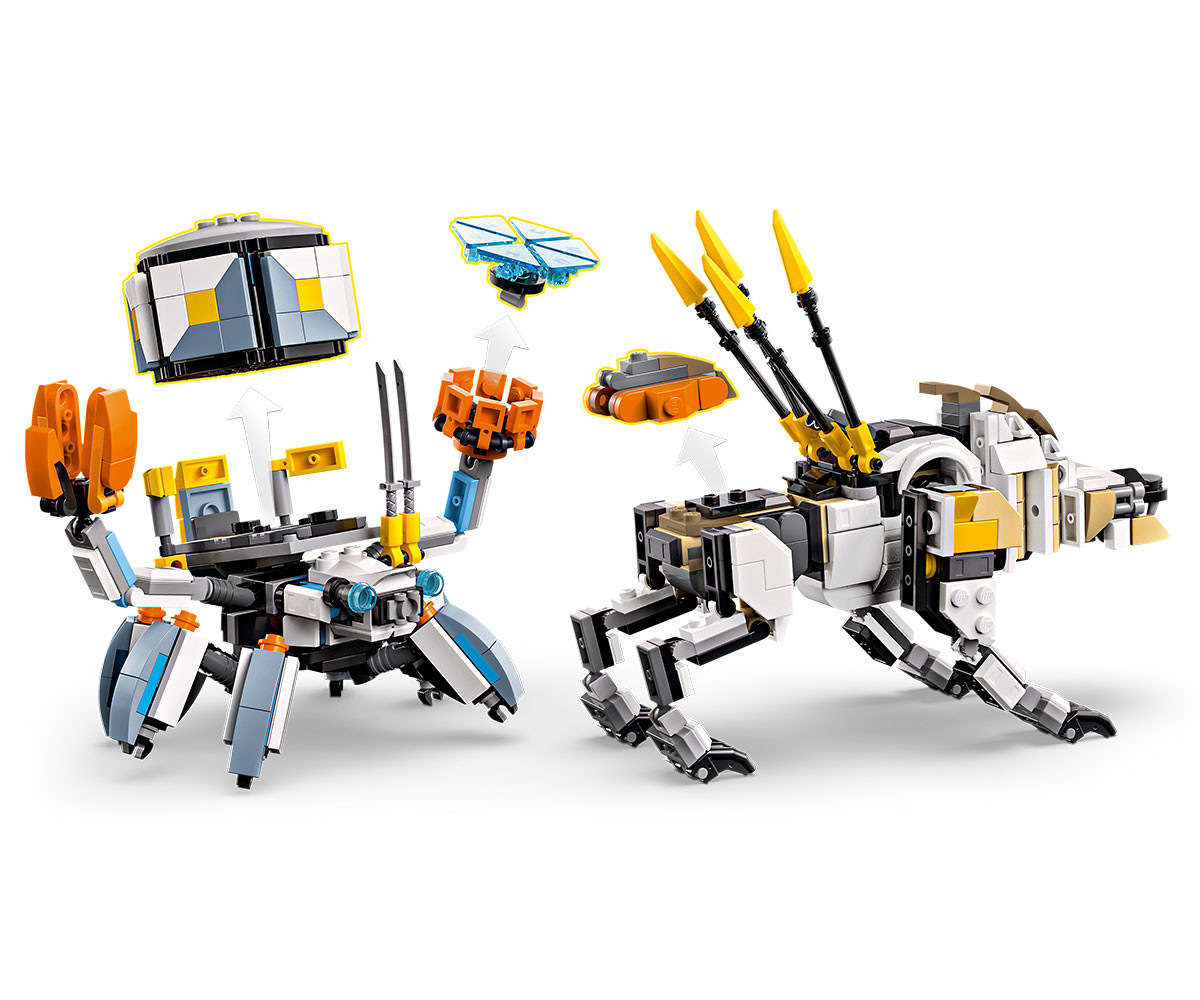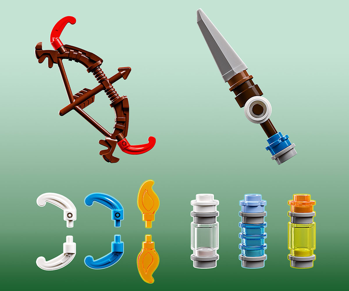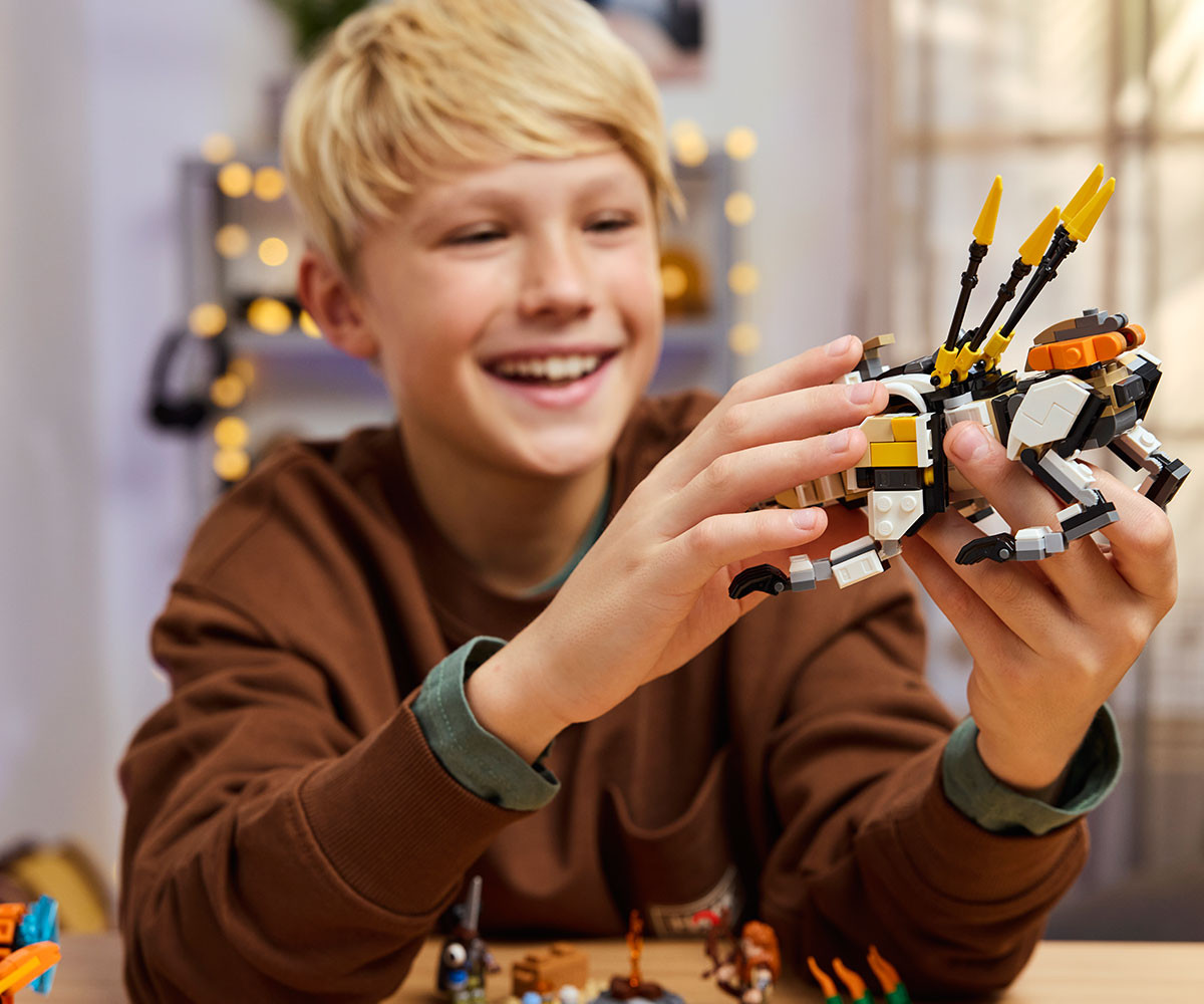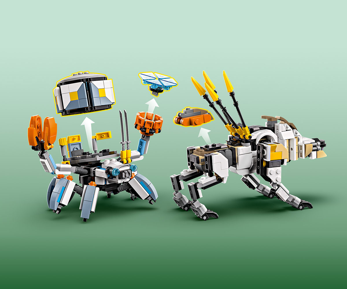 Присъединете се към Aloy и Varl за гейминг с LEGO® Horizon Adventures™, докато се изправят срещу две напълно подвижни мегамашини: Shell-Walker и Sawtooth! Скрийте се зад високата тръстика, докато сменяте перата на лъка на Aloy и кутиите с амунициина копието на Varl, за да активирате атака с огън, шок или лед. Сега използвайте тези сили, за да победите вражеските роботи и да вземете съкровището!